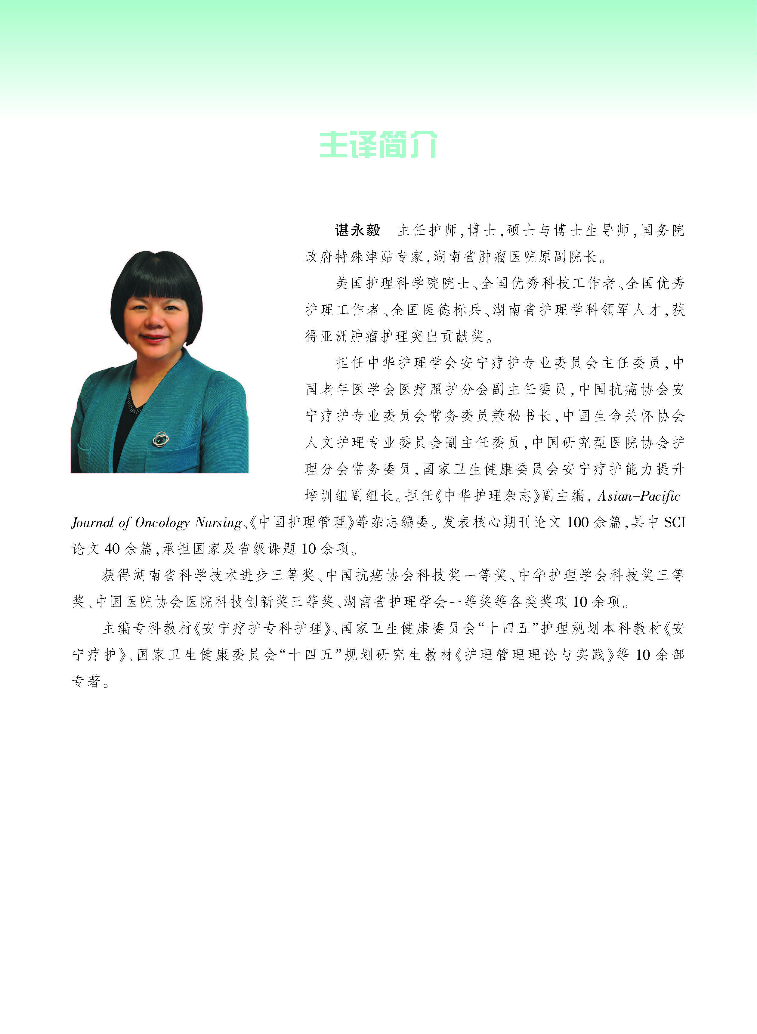 谌永毅 主任护师,博士,硕士与博士生导师,国务院政府特殊津贴专家,湖南省肿瘤医院原副院长。