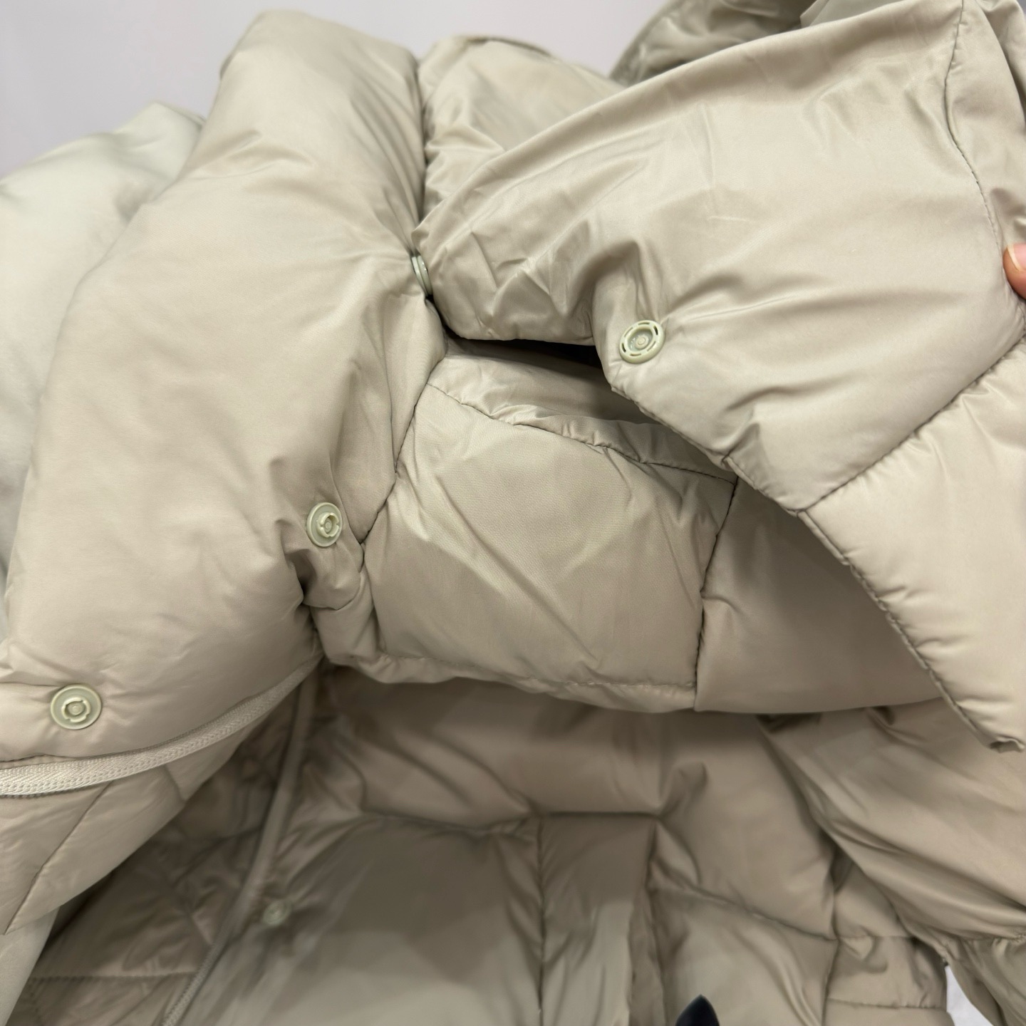 7可拆卸优质保温兜帽logo元素采用四合按扣固定并目填充了羽绒,给头部和脖颈周围带来更大的柔软感,不喜欢戴帽子的,可以拆下来直接当羽绒夹克上身,风格多变!门襟部分采用三层防漏风,四合扣采用菱角凹槽扣固定结实!
