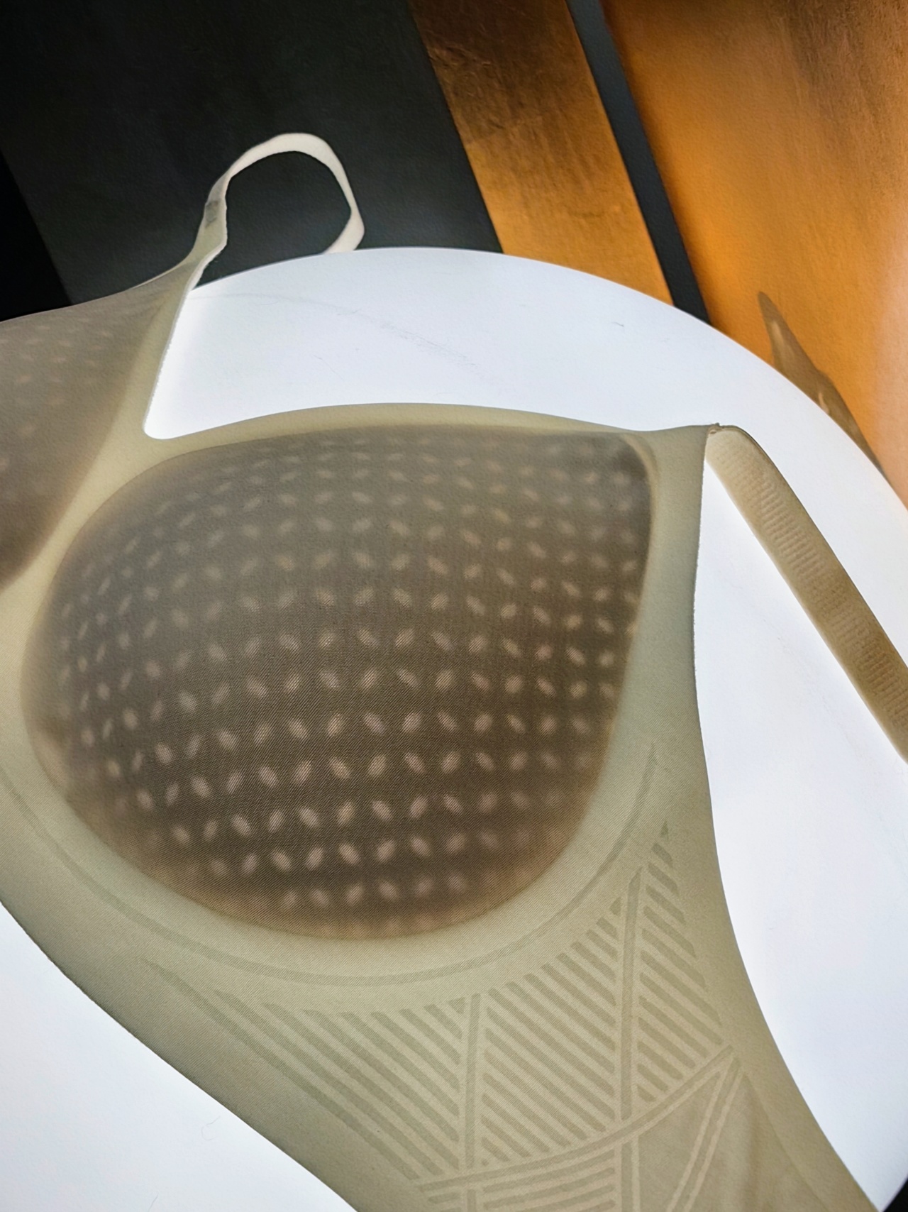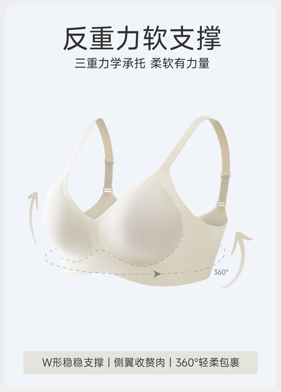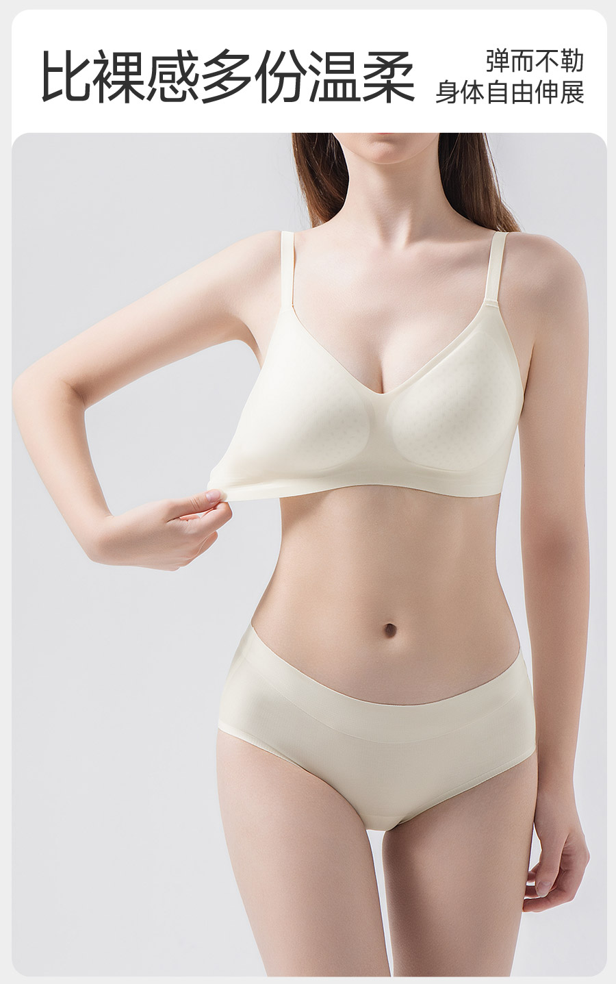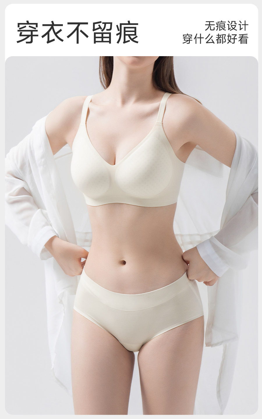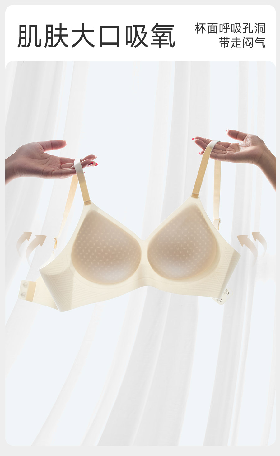设计更是贴心。文胸采用3D立体水滴杯型,这设计太懂女人了,完美模拟自然胸型,能把胸线抬高,让薄胸也能瞬间变得圆润饱满。W型液态胶骨从侧边延伸到下围,紧紧贴合胸部曲线,紧而不勒,承托力超强。还有侧翼的细果冻条,收副乳效果一绝,整个软支撑系统把胸部稳稳往上抬。蜂窝罩杯自带花瓣型透气网孔,春夏穿它,汗不闷、热不黏,就算是38℃的高温天,罩杯都能透出凉风,这透气性没得说。内裤则是简约但绝对不将就,采用了无痕压胶工艺,一片式设计,真正做到隐形无痕,穿在身上就像没穿一样,0勒痕体验太赞了。