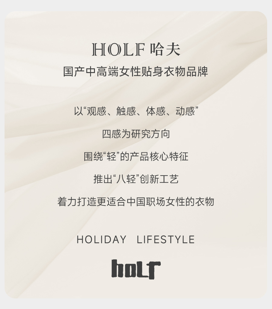 HOLF哈夫主打产品由专业制衣厂研制,拥有长达38年的内衣生产经验,集国内优质内衣裤设计生产于一体。工厂装备国内先进的点胶机、车缝机和定型机超过320台,拥有30余项国家认证专利,荣获多个奖项,如“中国针织内衣行业匠心智造金针奖”、“中国著名品牌”、“十大健康内衣品牌奖”。