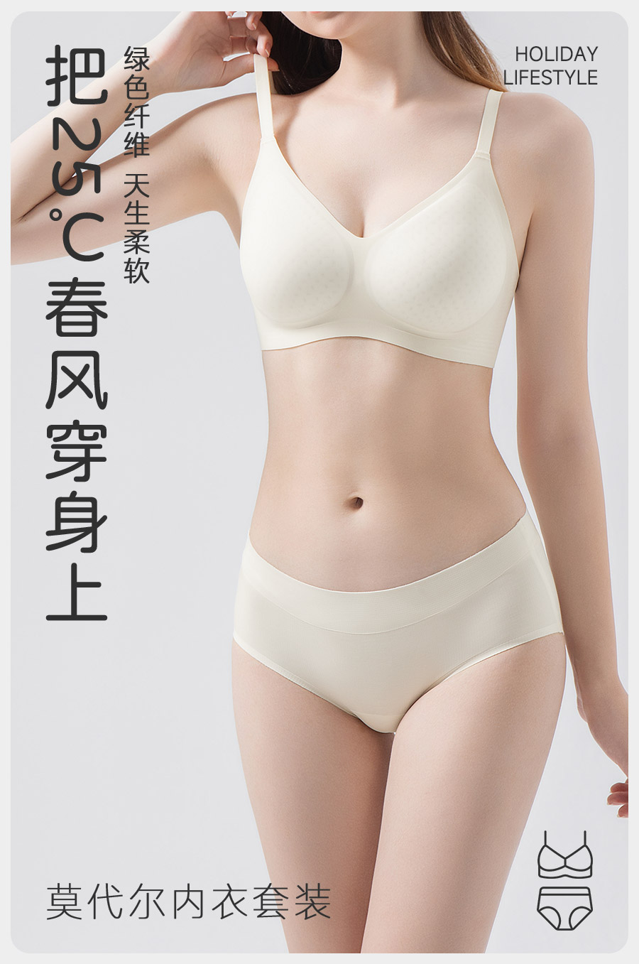 这款0碳莫代尔内衣套装的材质太厉害了!文胸用的是奥地利兰精莫代尔,这原料取自欧洲天然榉木,而且采用了0碳工艺,从源头就开始减排,环保又高级。这面料不仅环保可降解,在丝滑度和吸湿度上更是远超棉质;再加上纤维足够细旦,摸起来就像丝一样软糯。还加入了高弹氨纶,让内衣有了弹而不勒的云触感。配套内裤也是大有来头,外层是马油面膜材质,内层是兰精莫代尔材质,内裆更是加入了贵妇级桑蚕丝,这配置简直绝了,抑菌养肤,给私处最贴心的呵护。