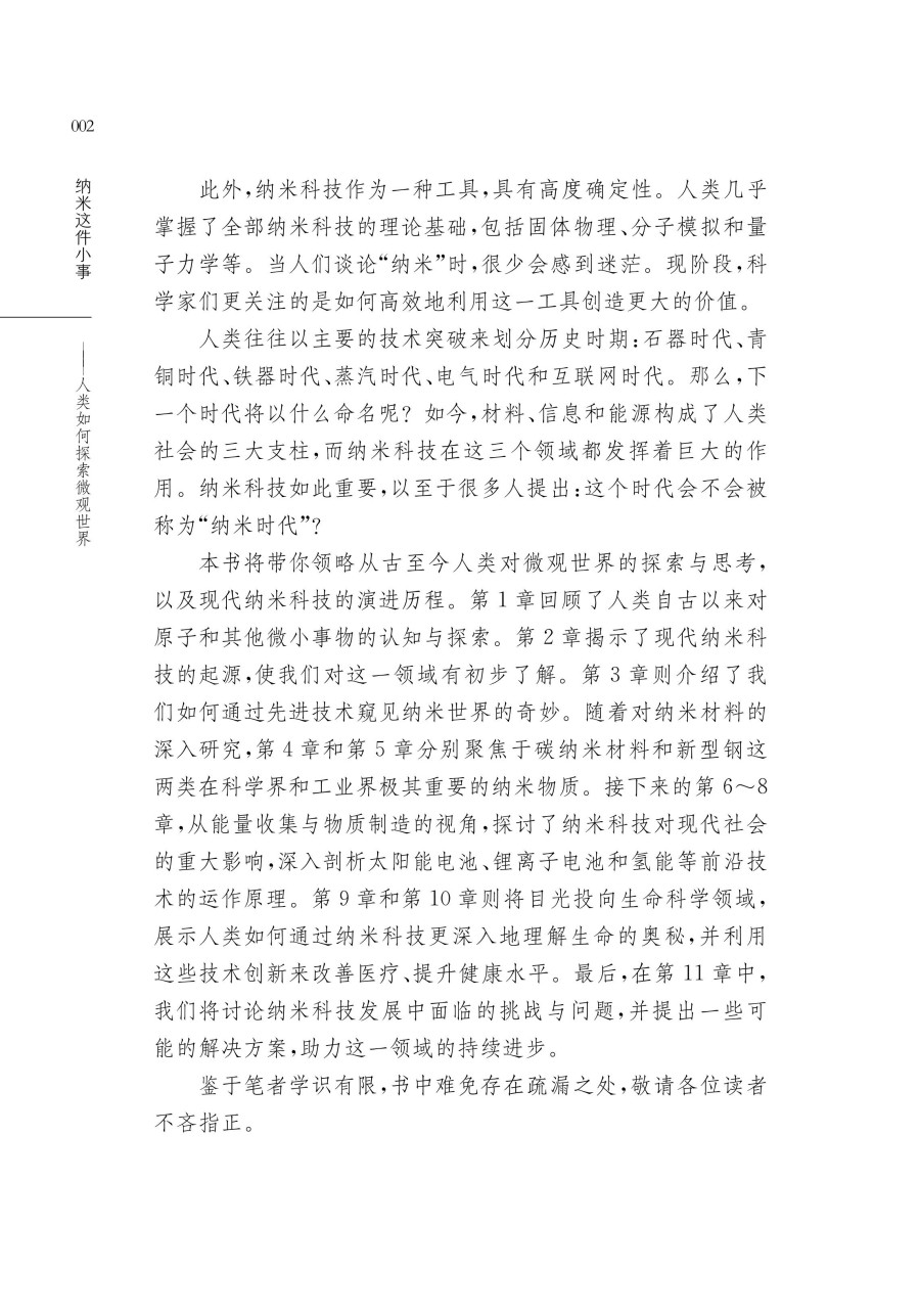 本书梳理了人类探索微观世界的千年历程,从古代原子论的哲学思辨到现代纳米科技的突破性进展。全书共11章,系统展现了纳米科技的前世今生:既追溯了人类对微小事物的早期认知,又详解了碳纳米材料、新型钢等关键纳米物质的特性与应用;既揭示了太阳能电池、锂离子电池等能源技术的微观原理,又探讨了纳米医学在疾病诊疗中的革新作用。最终落脚于纳米科技面临的挑战与未来可能,为读者呈现了一幅从基础科学到产业应用的完整图景。