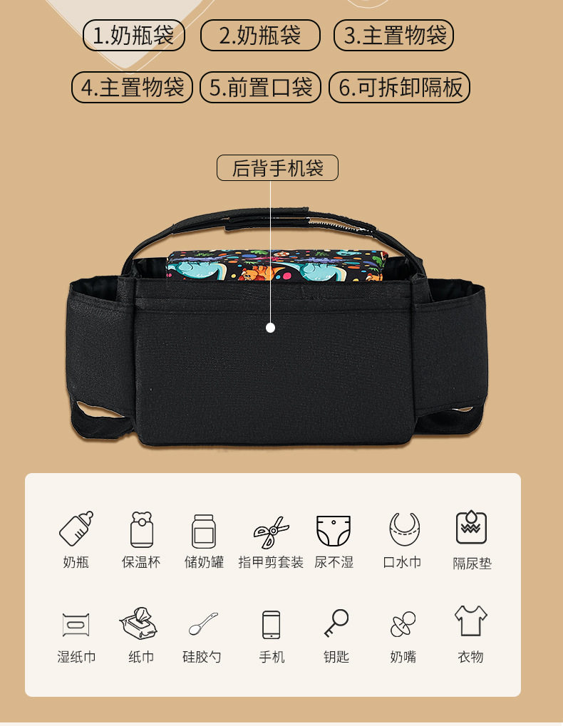 便携式多功能婴儿推车挂包收纳袋奶瓶水杯袋尿片包婴儿车挂袋