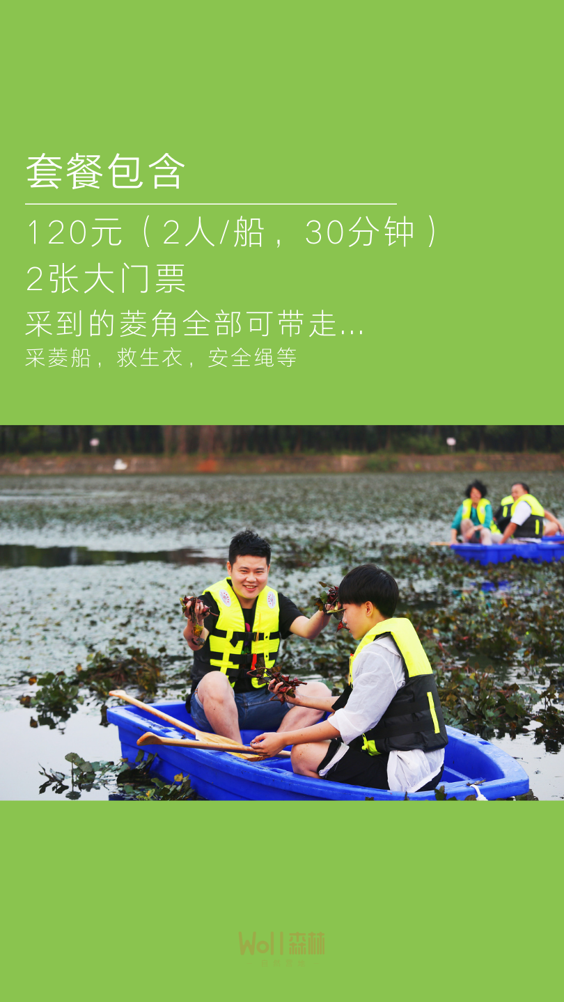 采菱角套票 | 张家港Woll森林自然营地,2人/船/30分钟/含2张门票,来采摘长江水域野生菱角,收获可全带走...