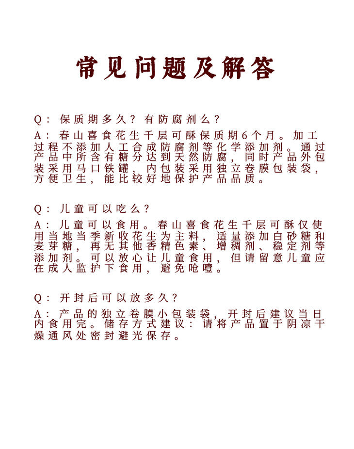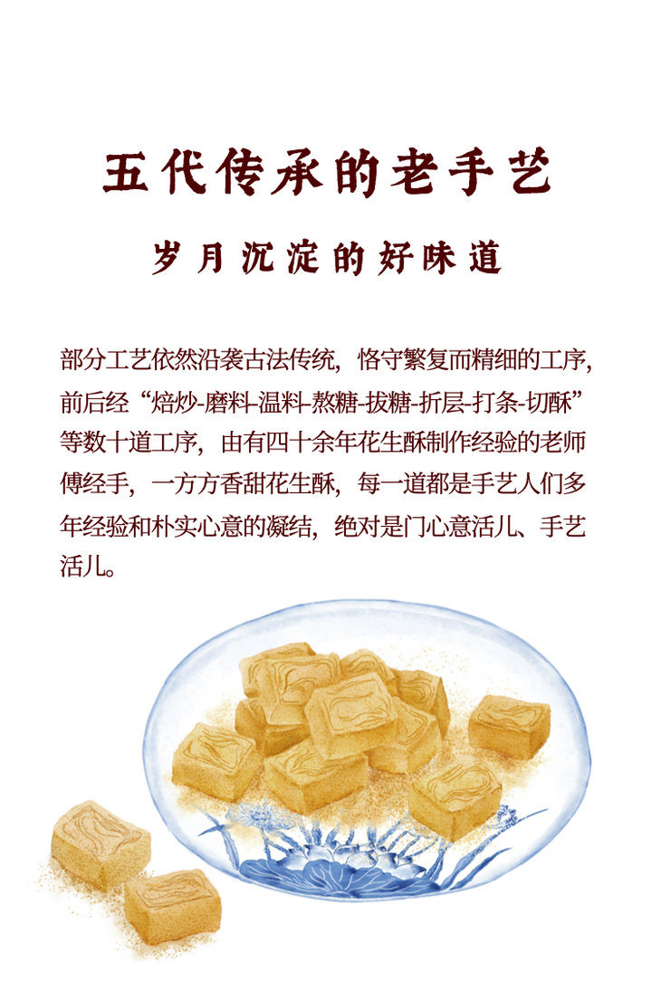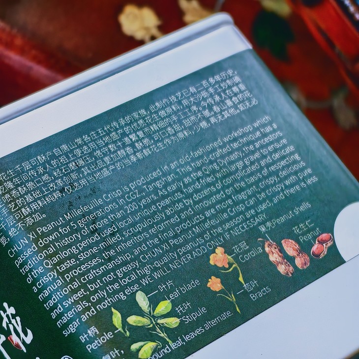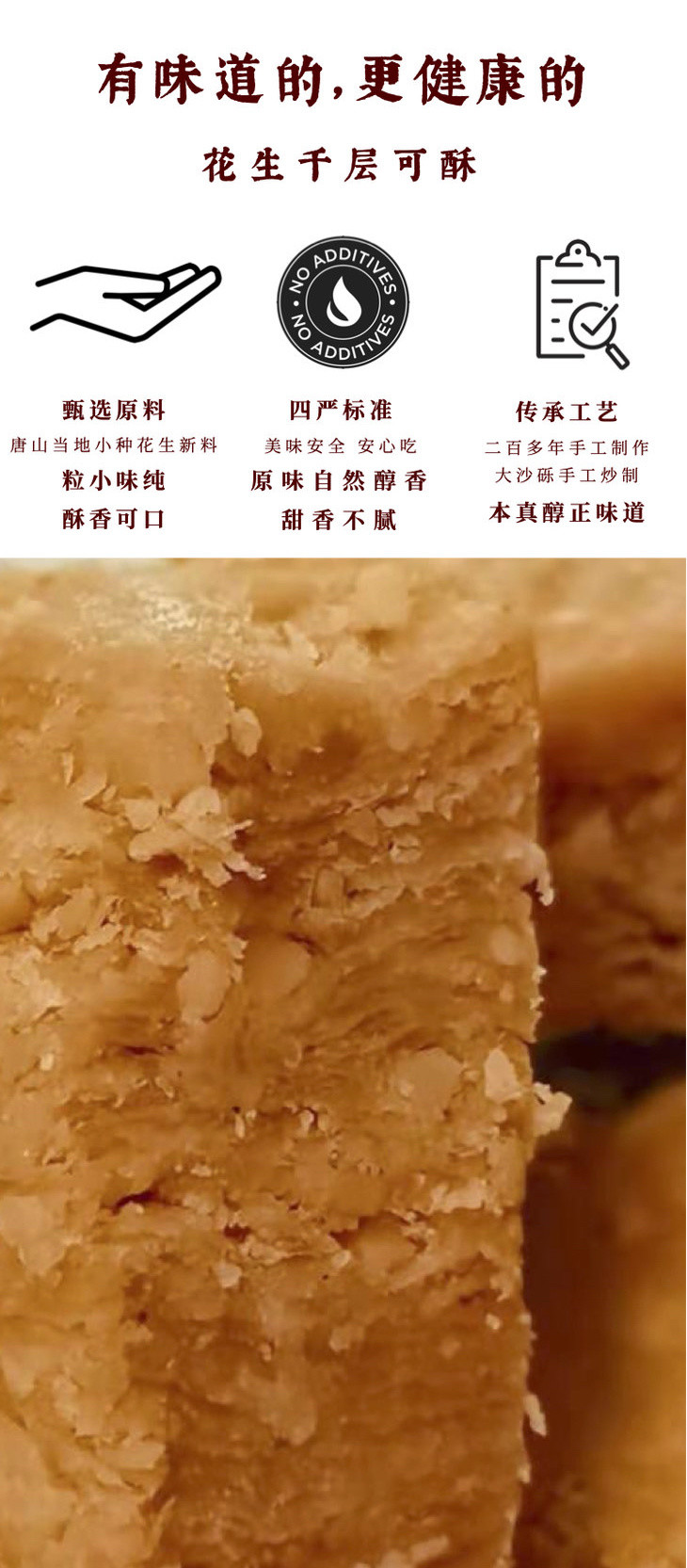 花生酥已经蛮少吃到了,春山喜食用料纯净,选用的是唐山滦县当季新收小颗粒花生,部分工艺沿袭古法传统,恪守繁复而精细的工序,前后经焙炒、磨料、温料、熬糖、拔糖、折层、打条、切酥等数十道,由有四十余年花生酥制作经验的老师傅经手,适量添加糖、芝麻、麦芽糖,不添加香精、增稠剂、稳定剂等人工添加剂,出品的花生酥风味自然,甜而不腻,好吃,健康,安心。