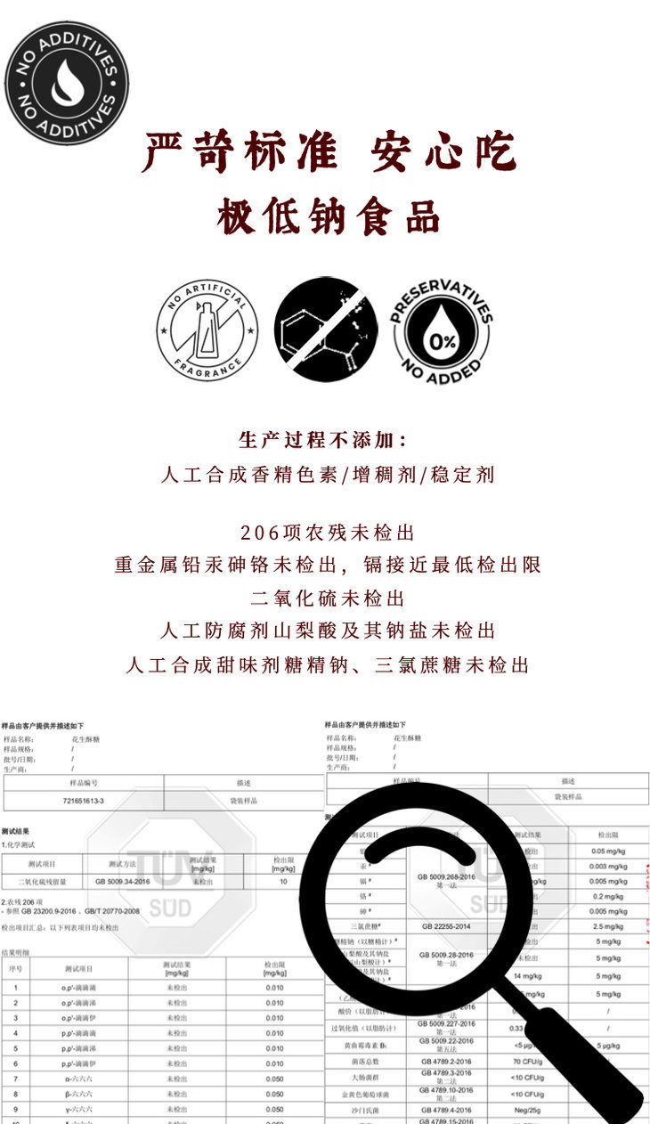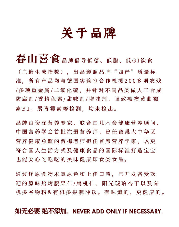 春山喜食自诞生之初,就致力于做植根美味食物、上佳品质、健康生活的中国高端休闲食品品牌,一直坚持低糖、低脂、低GI饮食,聘请了资深营养专家、中国营养学会首批注册营养师、曾任联合国儿童基金会健康专家和雀巢大中华区营养健康总监的贾梅老师担任首席营养学家。同时,还严格遵照高标准,由德国实验室进行200多项农残、多项重金属、二氧化硫的检测。针对不同品类做人工合成防腐剂、香精色素、甜味剂、增味剂、强致癌物黄曲霉素B1、展青霉素等检测,均未检出。