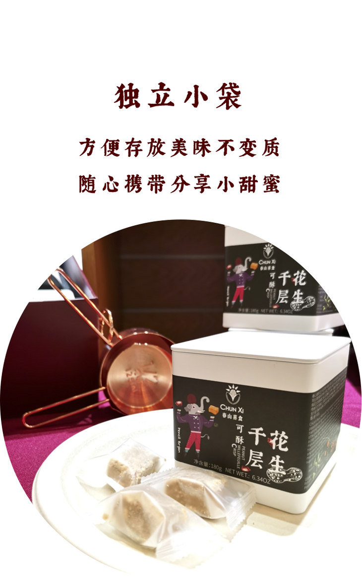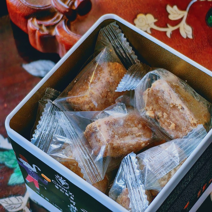 包装是挺简约的小铁罐,每一颗花生酥都有独立小袋,密封性好,不容易受潮。撕开袋子,就能闻到混合着花生和熬制糖料的暖暖香气,切面可以看到细小的花生粒和金亮亮的小糖丝儿,入口酥香松软不粘牙,有小时候的味道哦,配上咖啡或茶,也能给忙碌的下午提升点能量和热情!而且,它没有任何人工色素和香精,小朋友也可以放心吃!