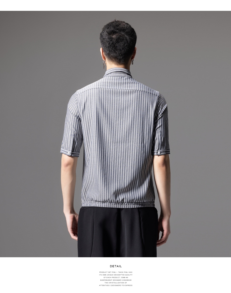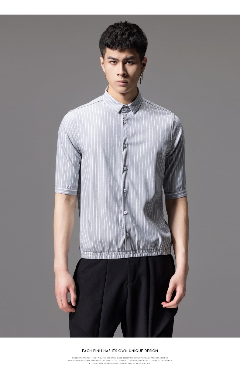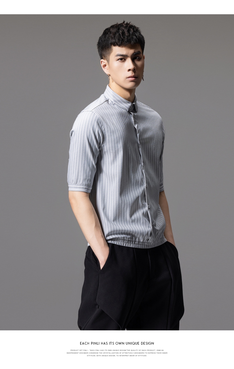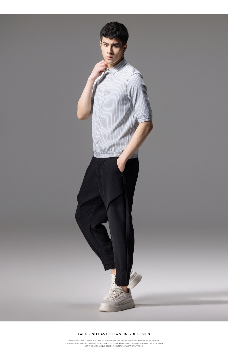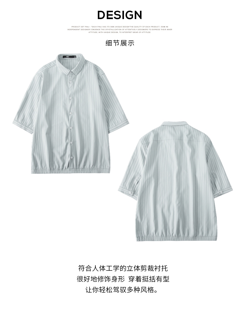 PINLI品立2024夏季新款男士尖领休闲条纹中袖衬衫上衣B242113065