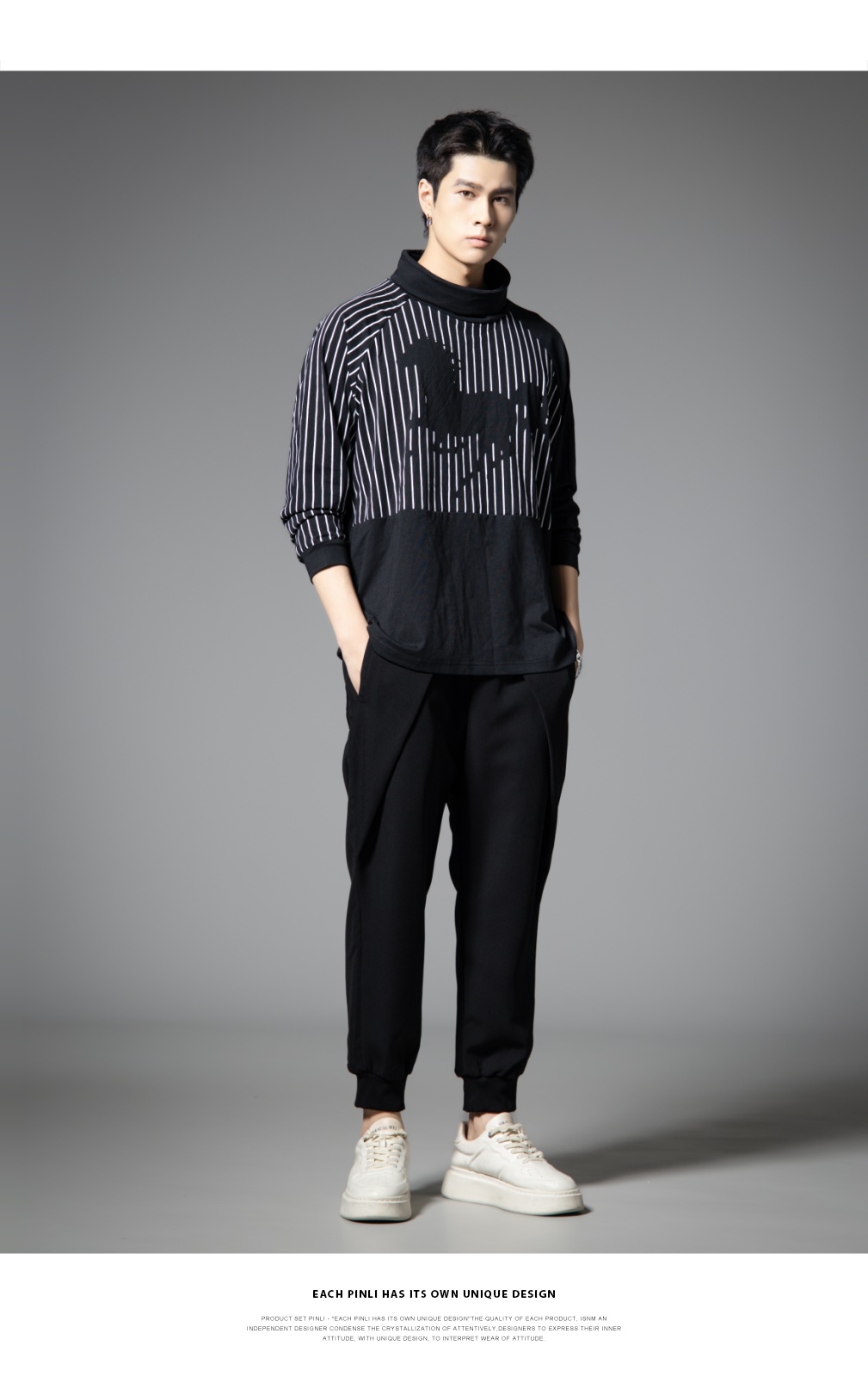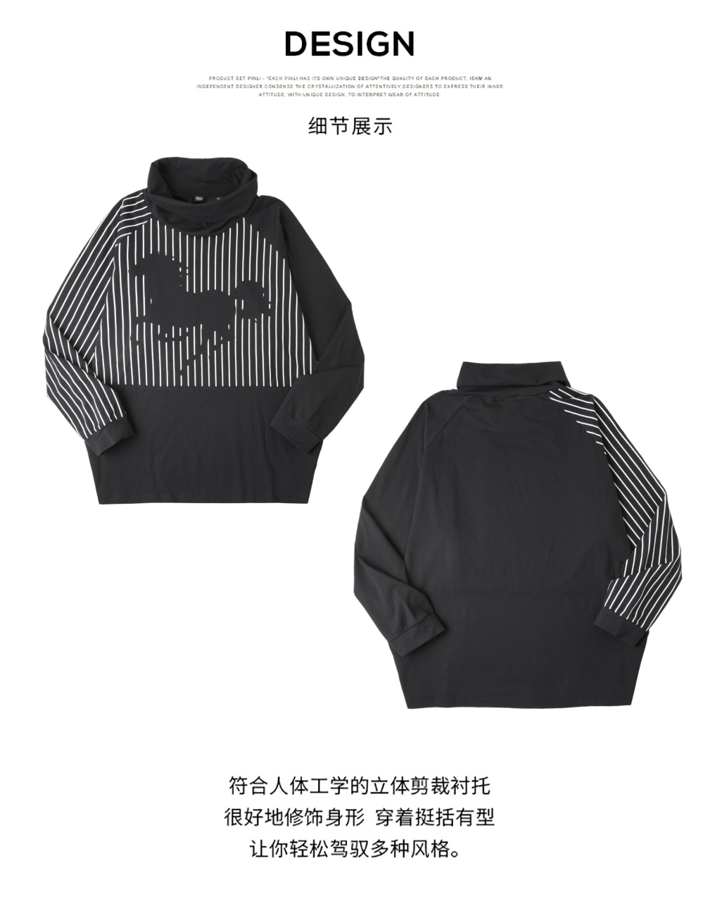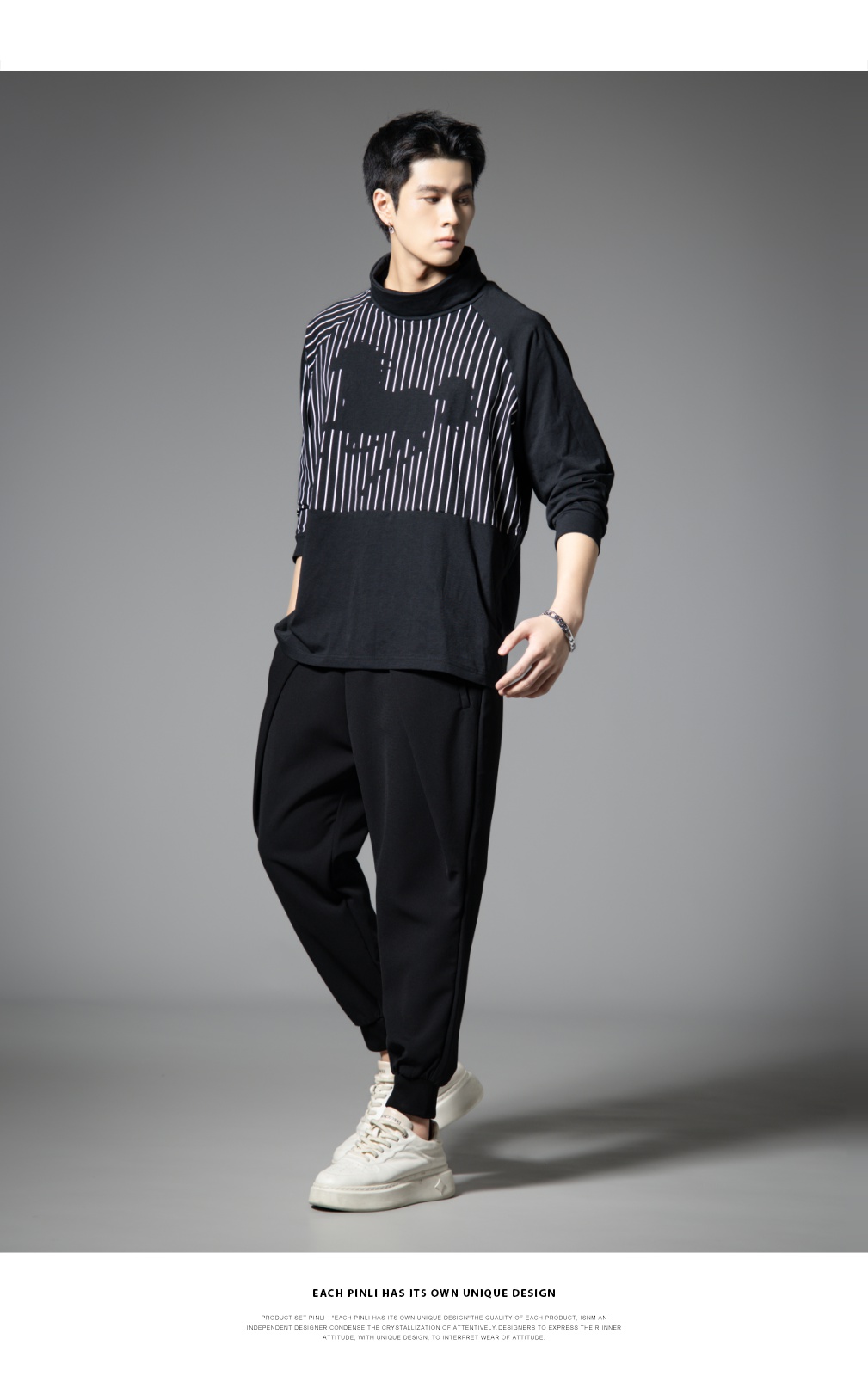 PINLI品立2025秋季新款拼料插肩袖堆堆领T恤潮牌休闲宽松男士上衣B253111105