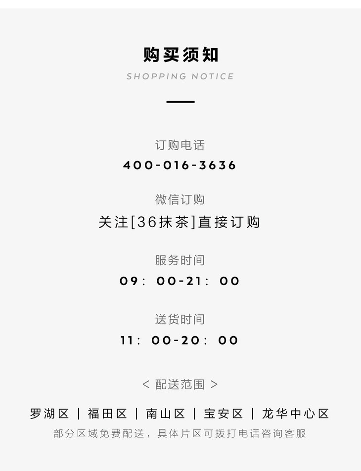 我们目前拥有36MATCHART和36cake两个品牌,主营抹茶甜品与新鲜蛋糕,深受数百万抹茶控和甜品控的拥趸。好吃安心,奶油只选法国铁塔。全城3小时免 费速达。客服热线400-016-3636
