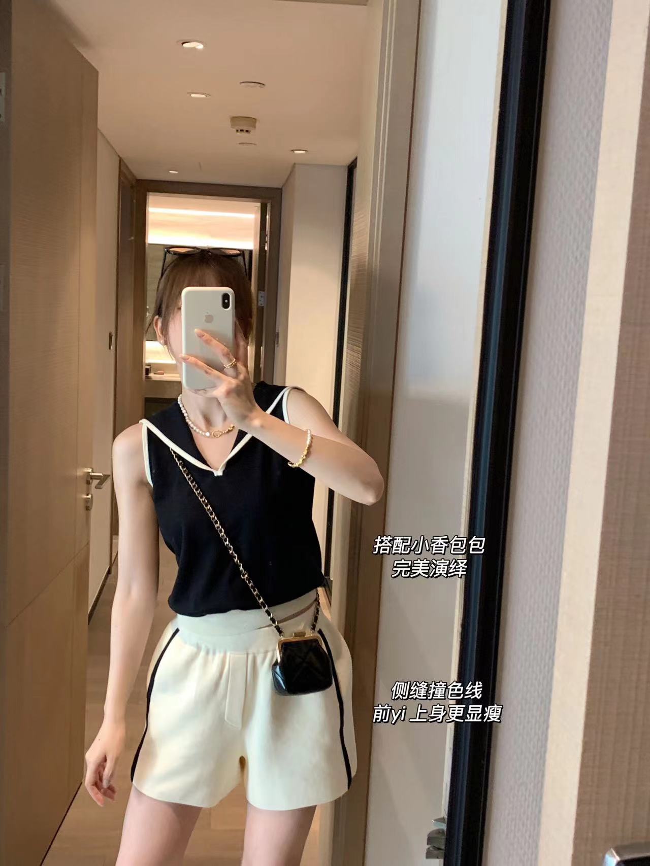 腰部弹力,不挑人,无论背心还是短裤,都显瘦遮肉,v领,海军领,袖口也是包副乳。