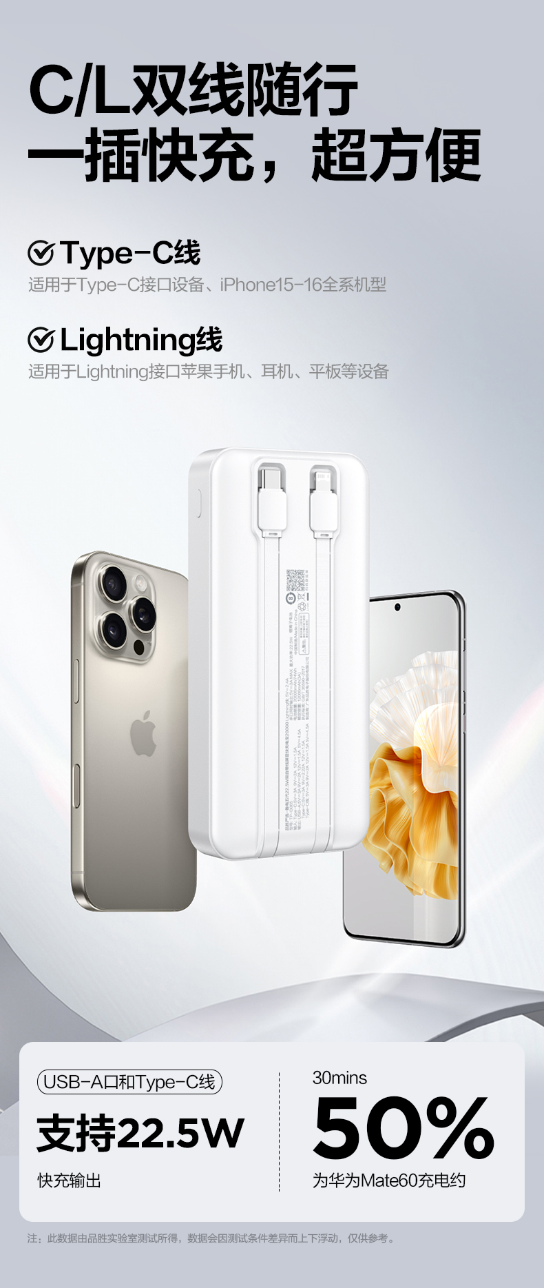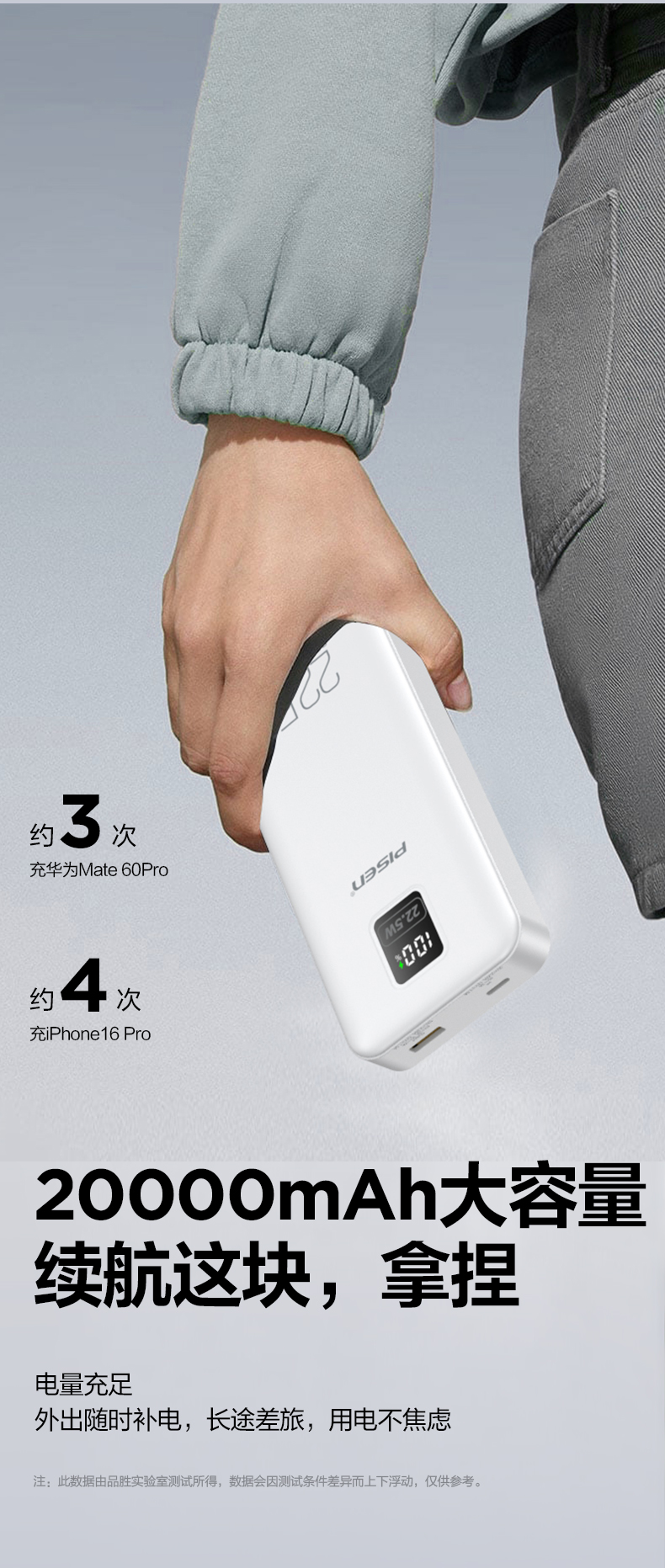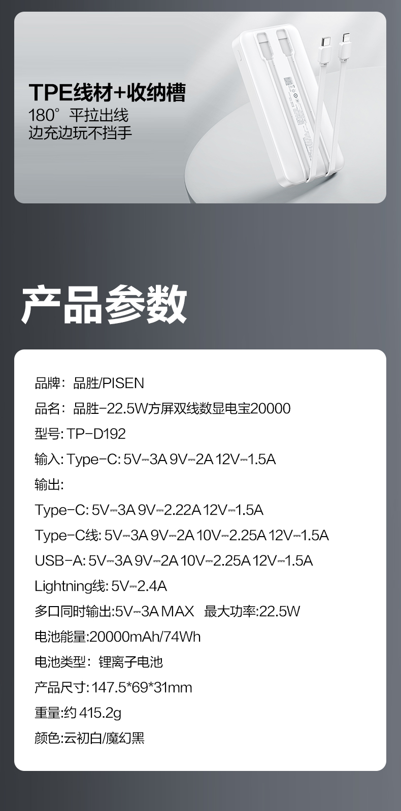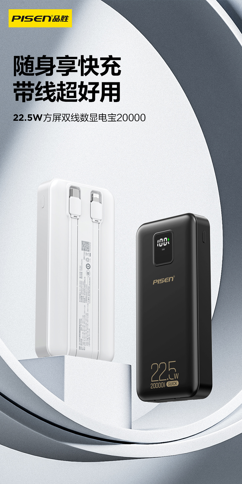 品胜 22.5W方屏双线数显电宝20000毫安 屏显充电宝 自带双线苹果/C口数据线 双向快充移动电源