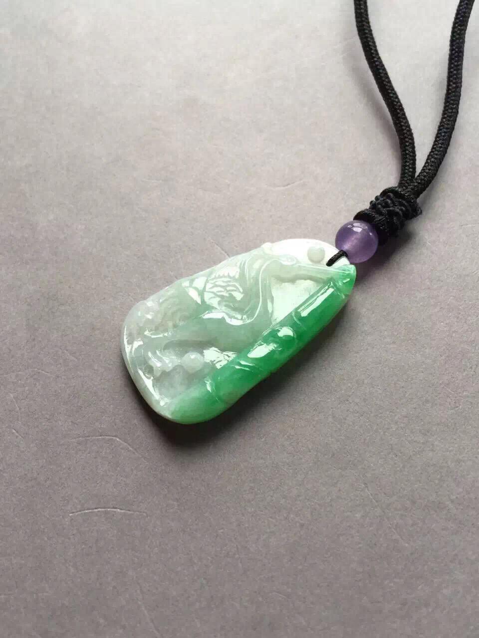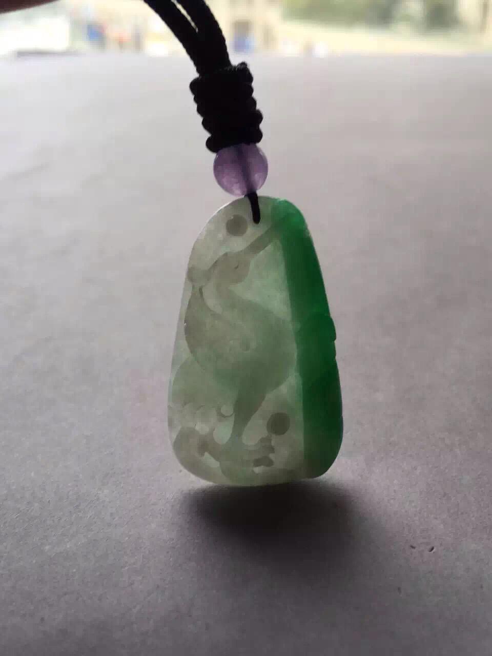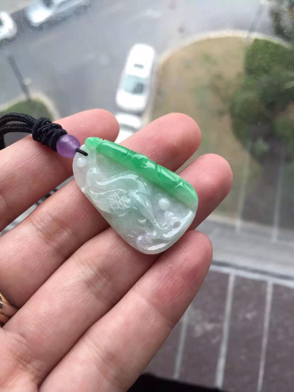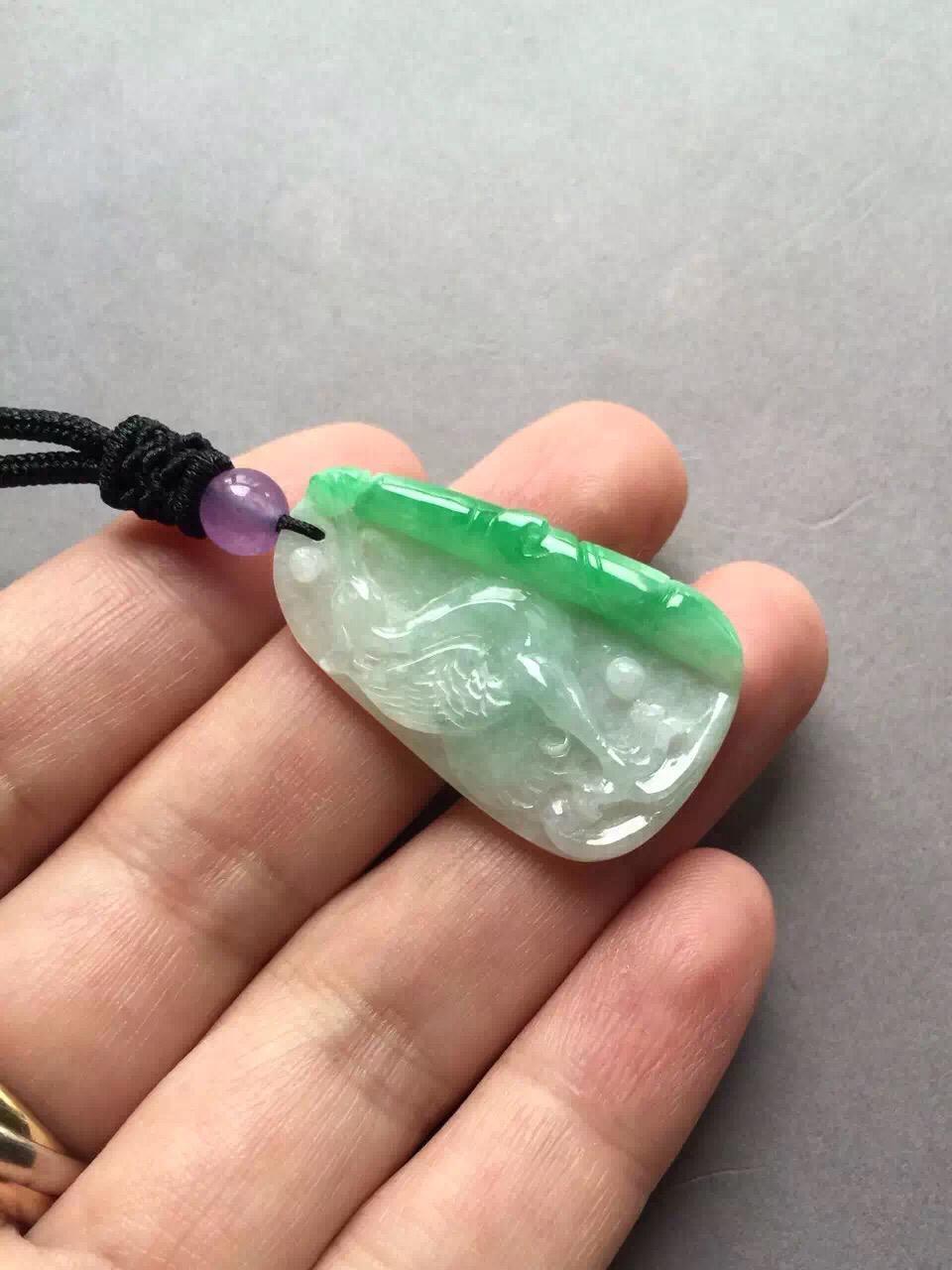 少有的特色精品,翡翠鹤竹祝寿,35*21.1*6.1mm。糯种阳绿白底青高翠挂坠,种水好,底白肉细色辣,阳绿艳丽,俏色运用让人啧啧称奇,手工精雕,仙鹤身姿修长,与绿竹相得益彰。集稀有与艺术性于一身。侧面鹤嘴处有白色短石纹隐于刻线中。"白鹤千秋寿,青松万载春",不可多得的作品
