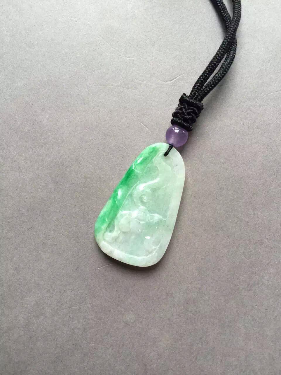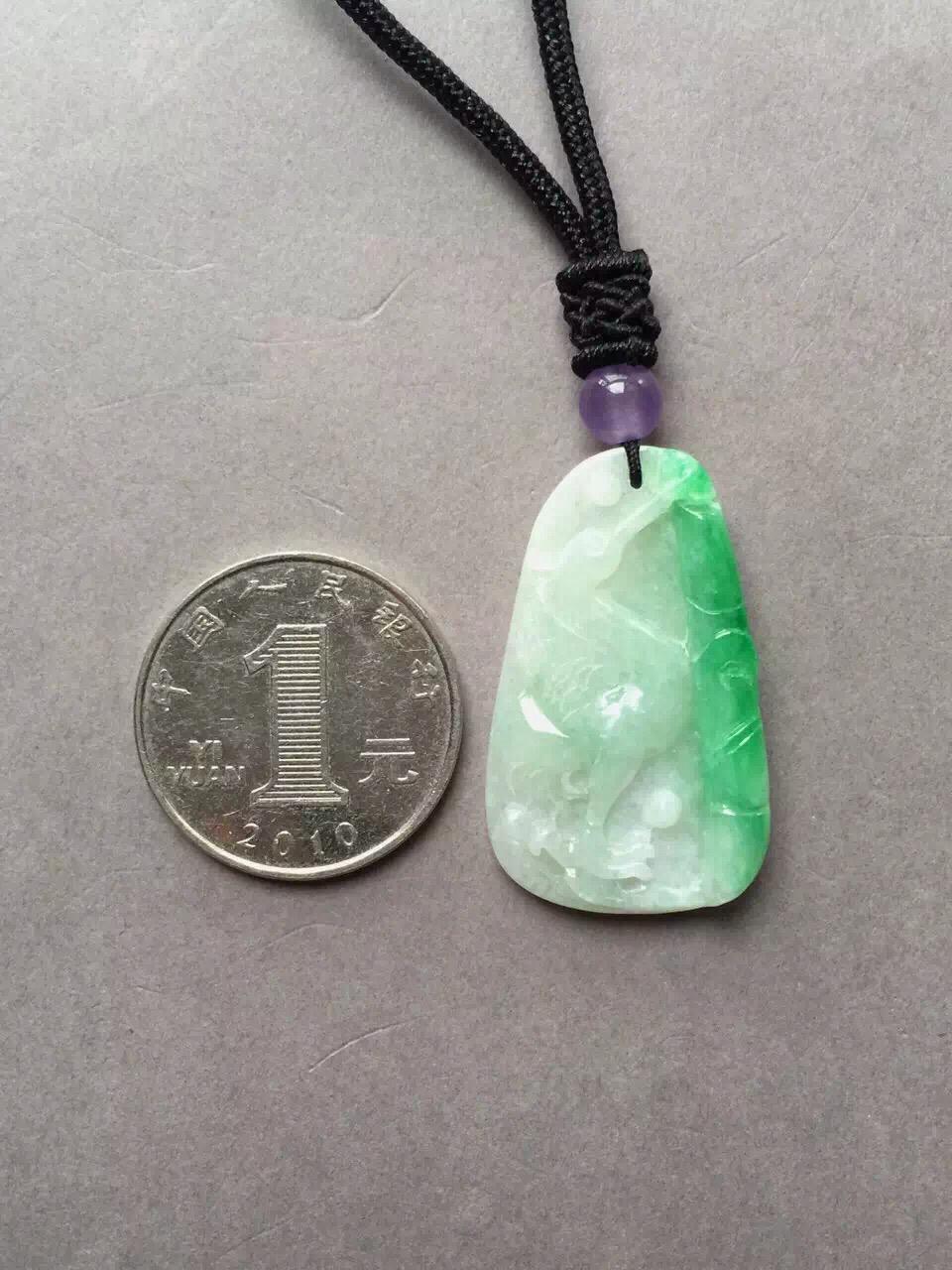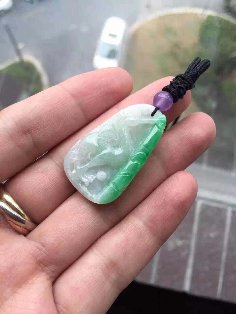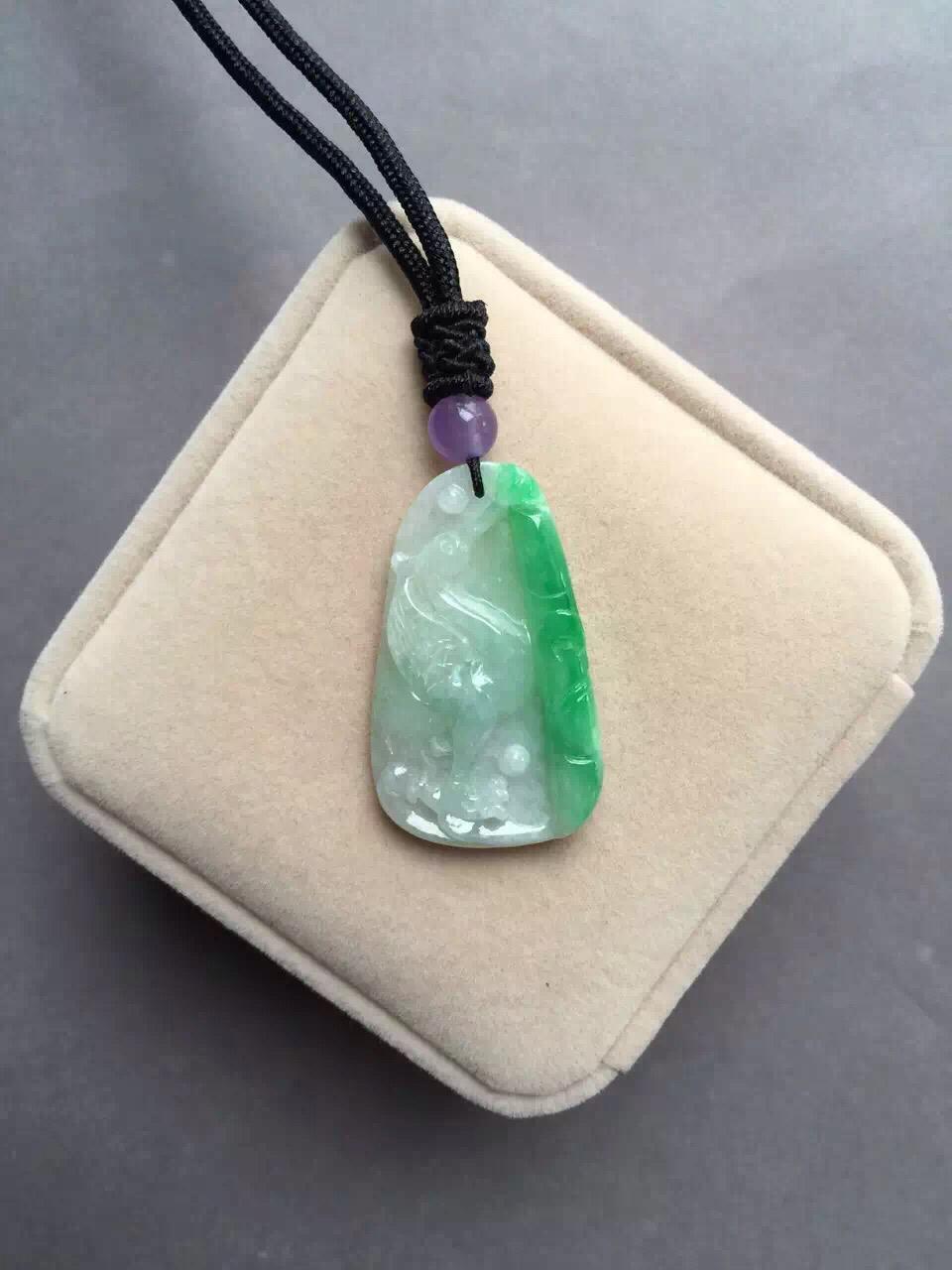 少有的特色精品,翡翠鹤竹祝寿,35*21.1*6.1mm。糯种阳绿白底青高翠挂坠,种水好,底白肉细色辣,阳绿艳丽,俏色运用让人啧啧称奇,手工精雕,仙鹤身姿修长,与绿竹相得益彰。集稀有与艺术性于一身。侧面鹤嘴处有白色短石纹隐于刻线中。"白鹤千秋寿,青松万载春",不可多得的作品