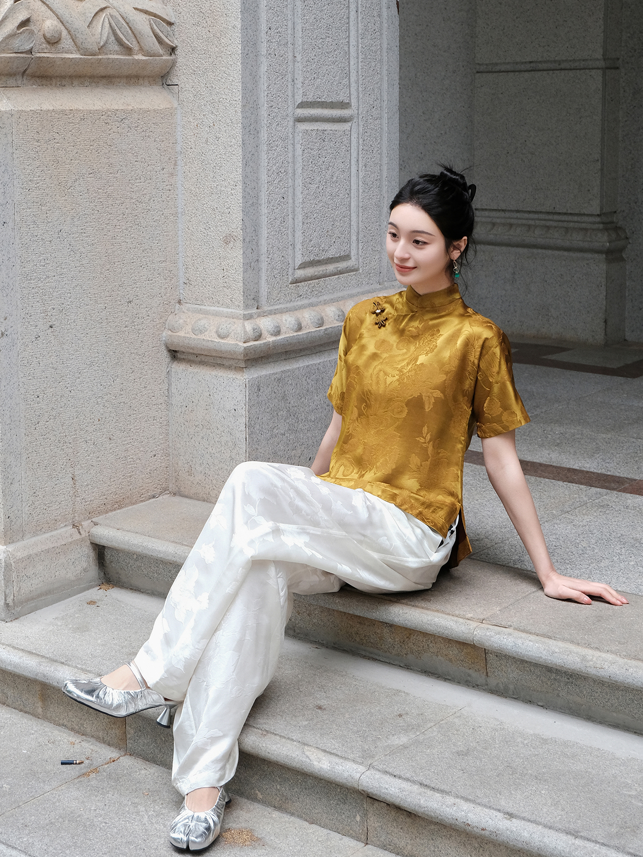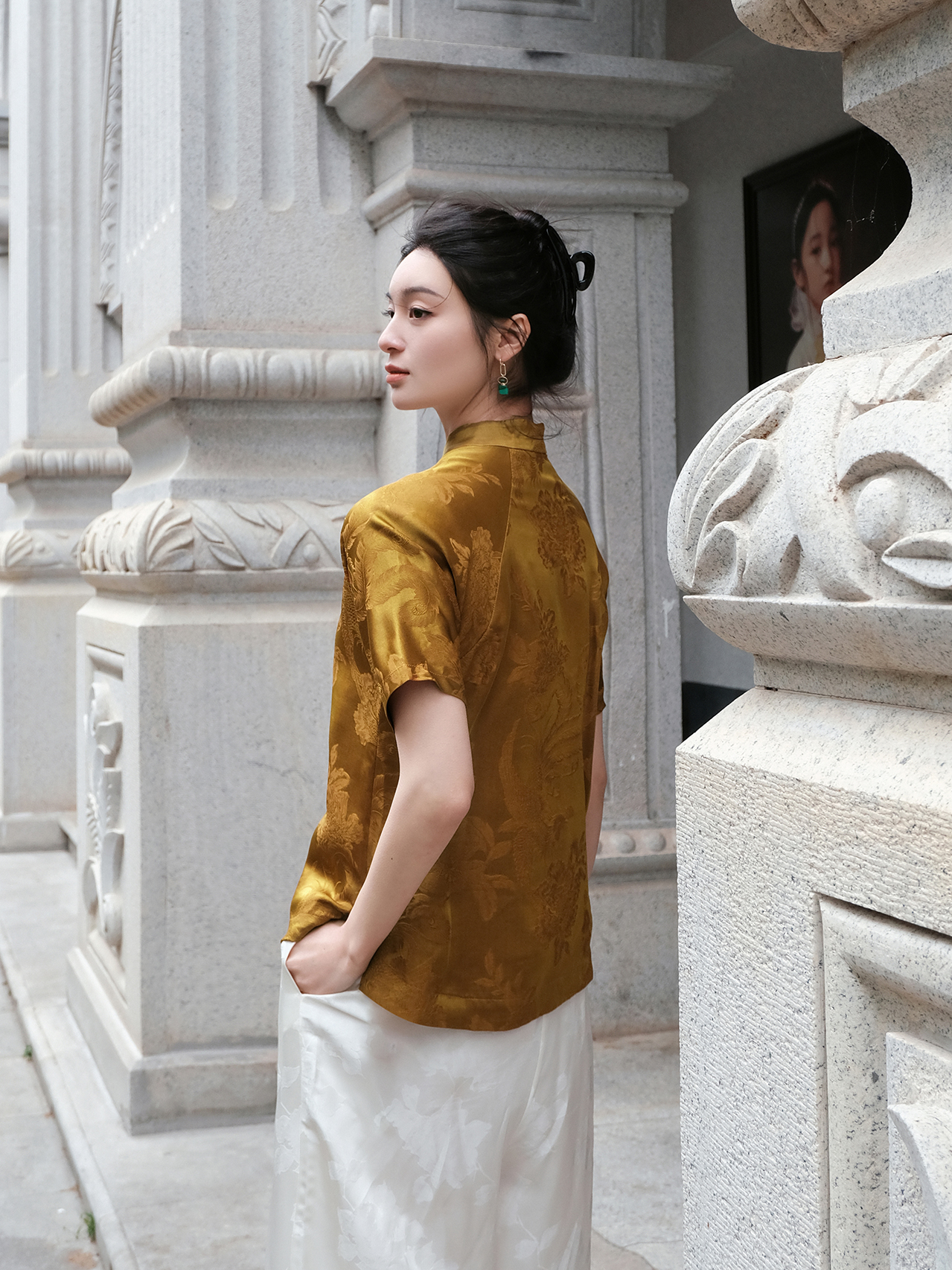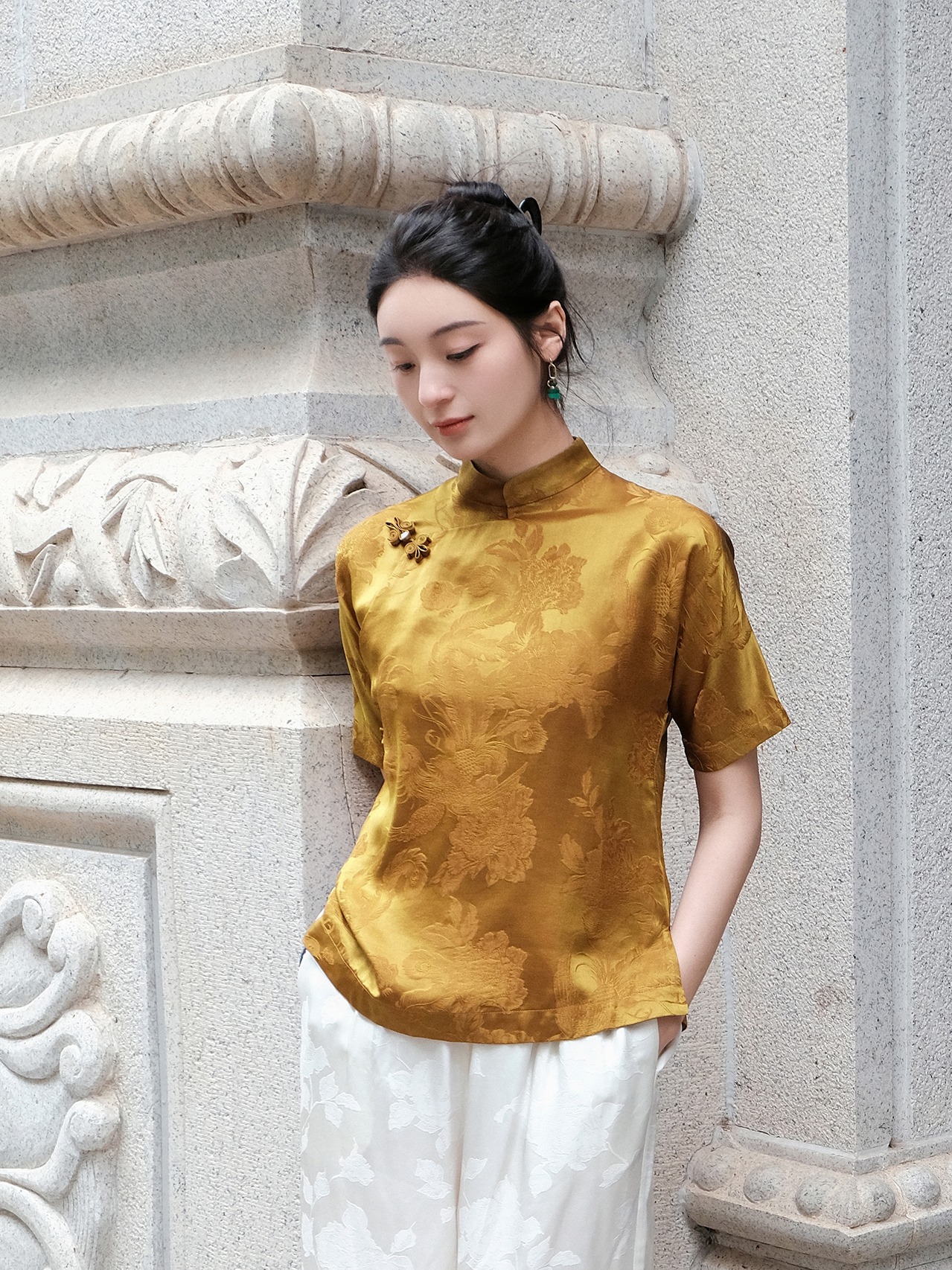 盛唐婧 |蝴蝶盘扣凤戏牡丹上衣-香槟色