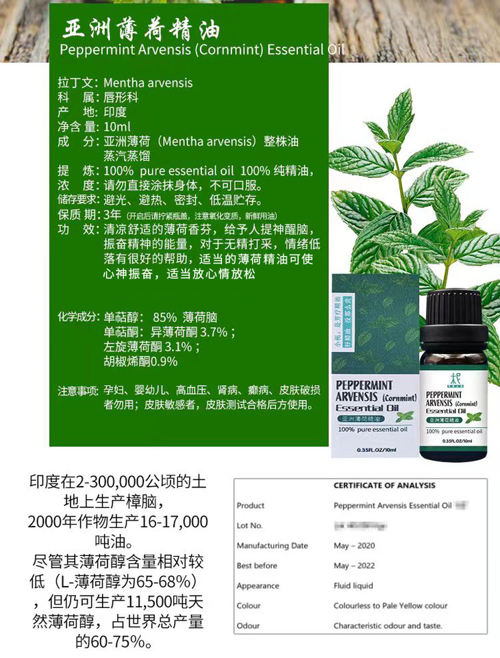 印度【 亚洲薄荷】精油 单方纯精油 清凉舒爽 闻嗅/扩香/调油