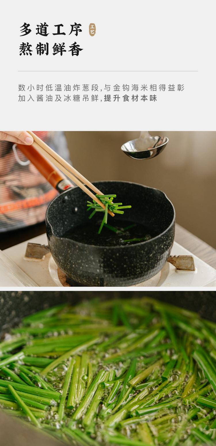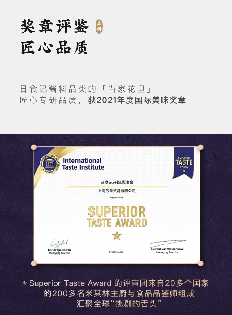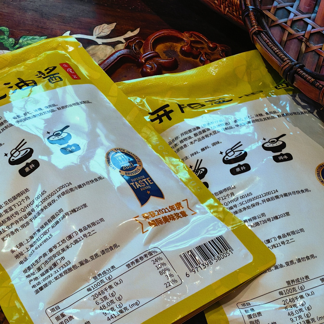 开阳葱油酱的独特之处在于它有用到来自北方海域的野生捕捞金钩海米,也就是人们常说的开阳,肉质紧实,味道鲜美,为酱料注入了无限风味!再搭配上优质的葱油、高品质的生抽和草菇老抽,以及传统工艺研制的冰糖,每一口都体现出对食材本身的尊重与保留。咸鲜比例也经过无数次的精心测试和调整,只为呈现最正宗、最美味的口感。值得一提的是,在2021年国际美味奖章评选中还荣获了1星大奖,足以证明其卓越的品质!