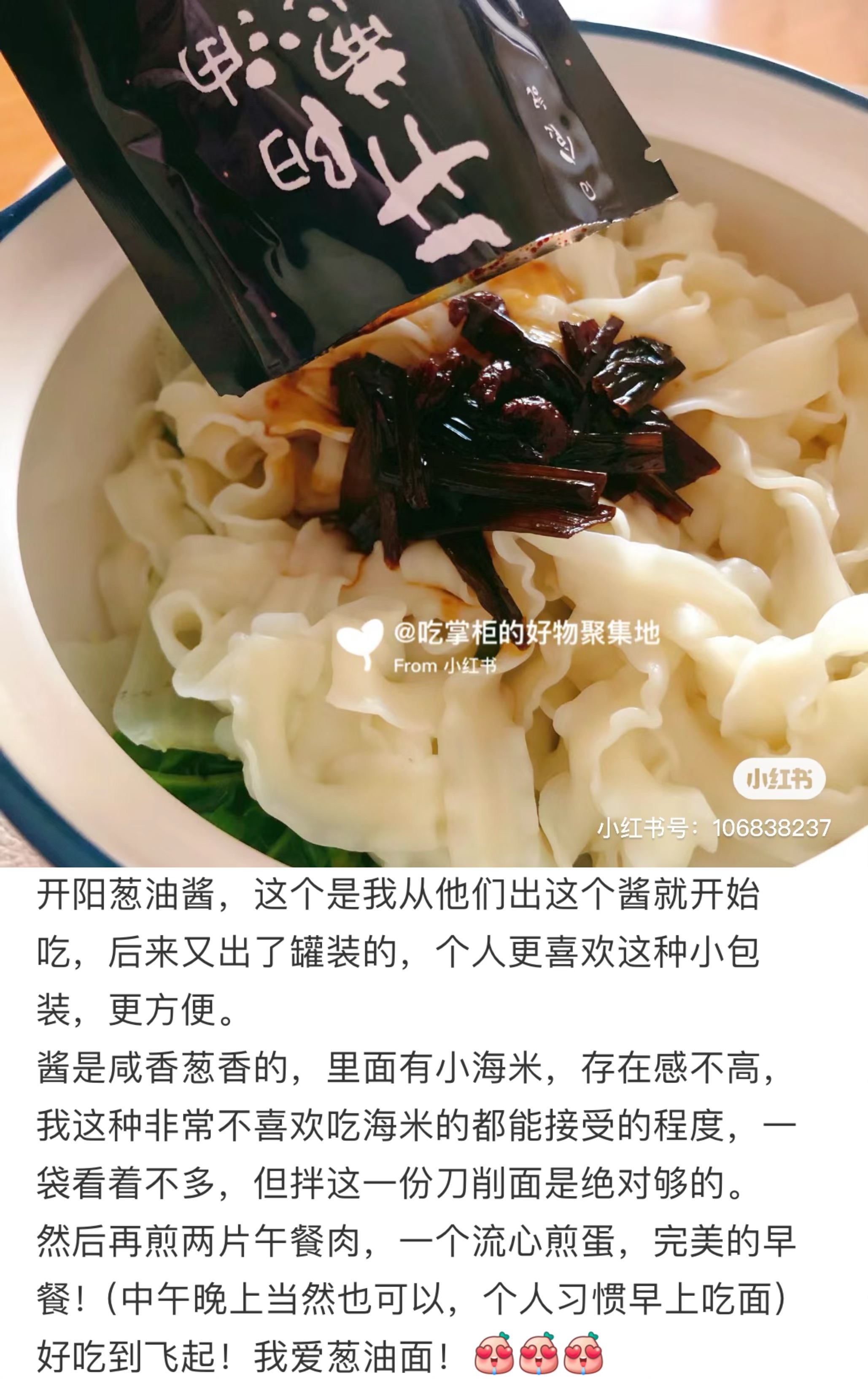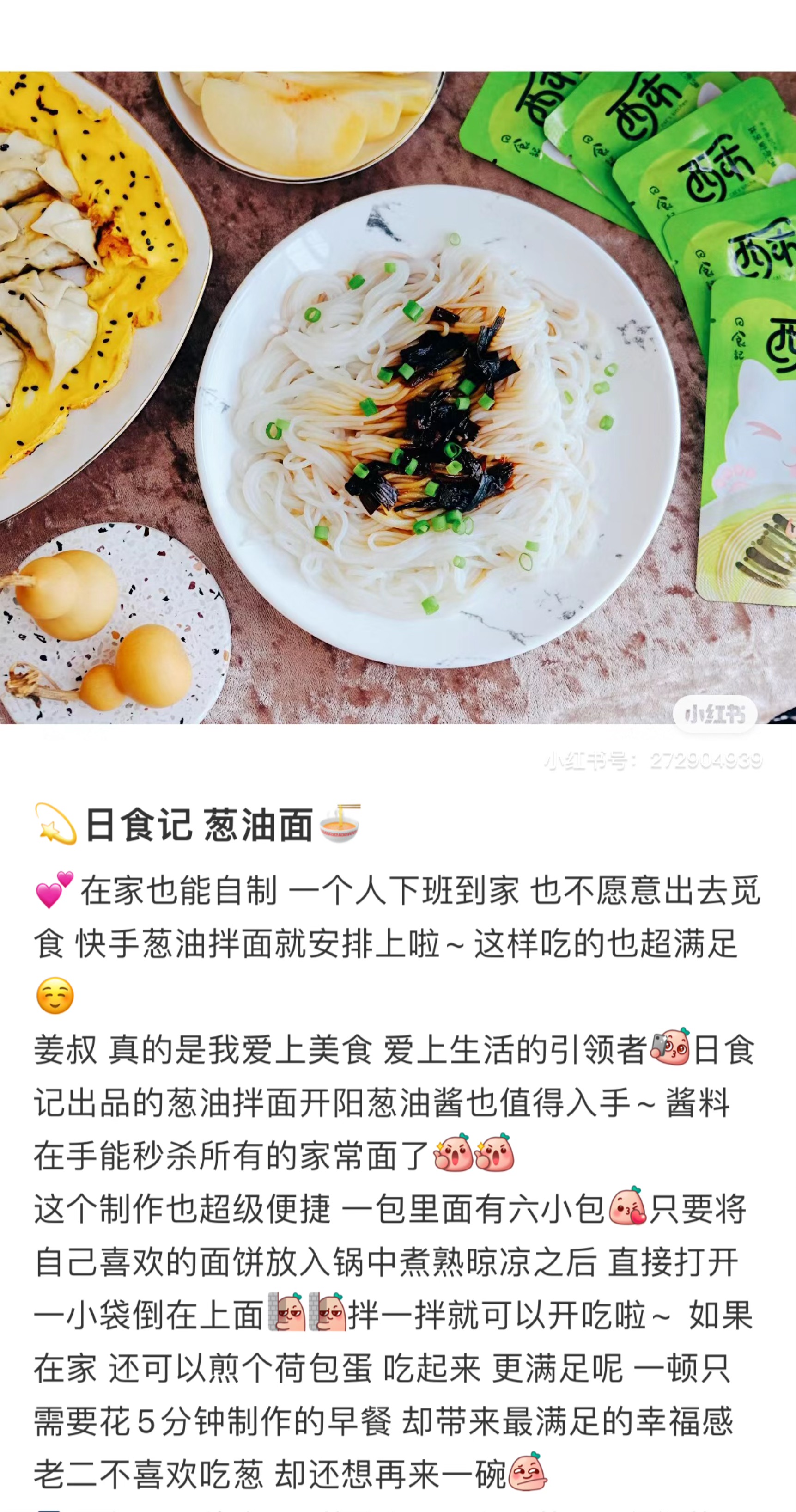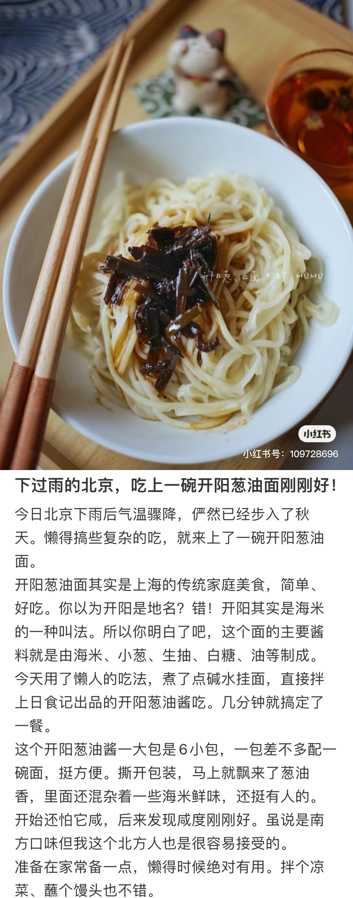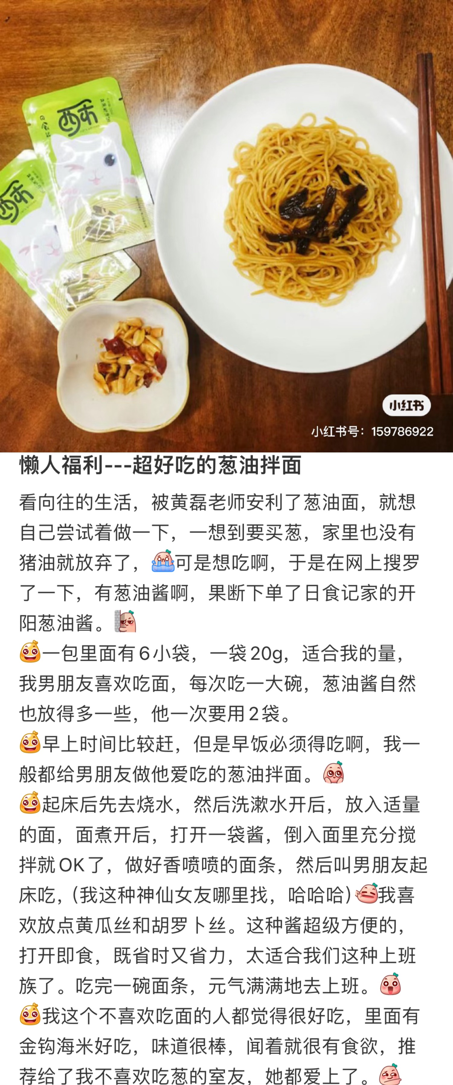 小时候,每当妈妈做葱油拌面,一捞一拌之间,那诱人的香气总是弥漫整个屋子!日食记的开阳葱油酱,也是很还原家常,无论是搭面条还是米饭,都能瞬间唤醒味蕾,让人欲罢不能。咸鲜的味道、浓郁的酱色,再加上开阳的鲜美和葱油的香气,美味程度满分!特别推荐搭配手延素面,再加一颗咸酸梅,真绝配,别的什么都不用放咯!除了拌面,还可以用来夹馒头、拌时蔬、拌馄饨饺子、做葱油饼,也都非常美味哦,等你们试试!