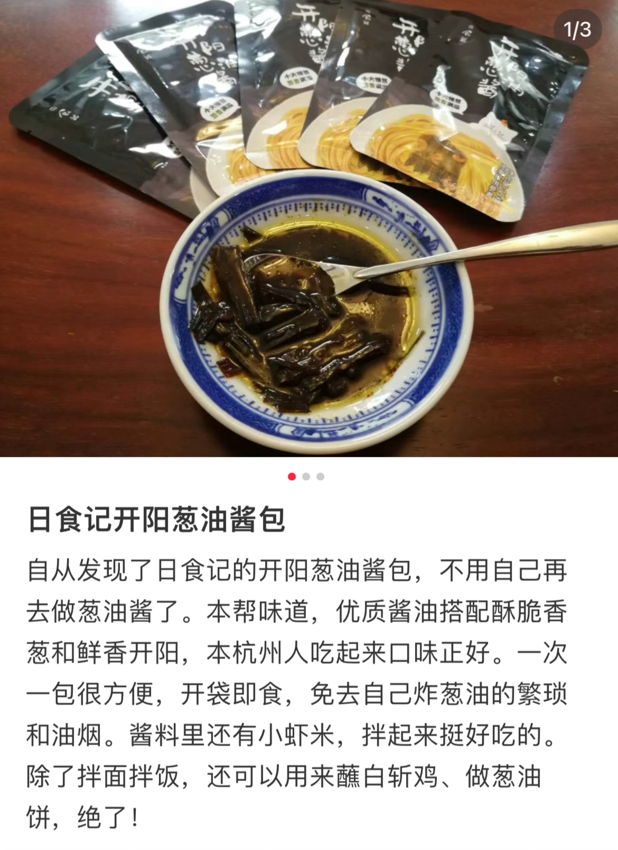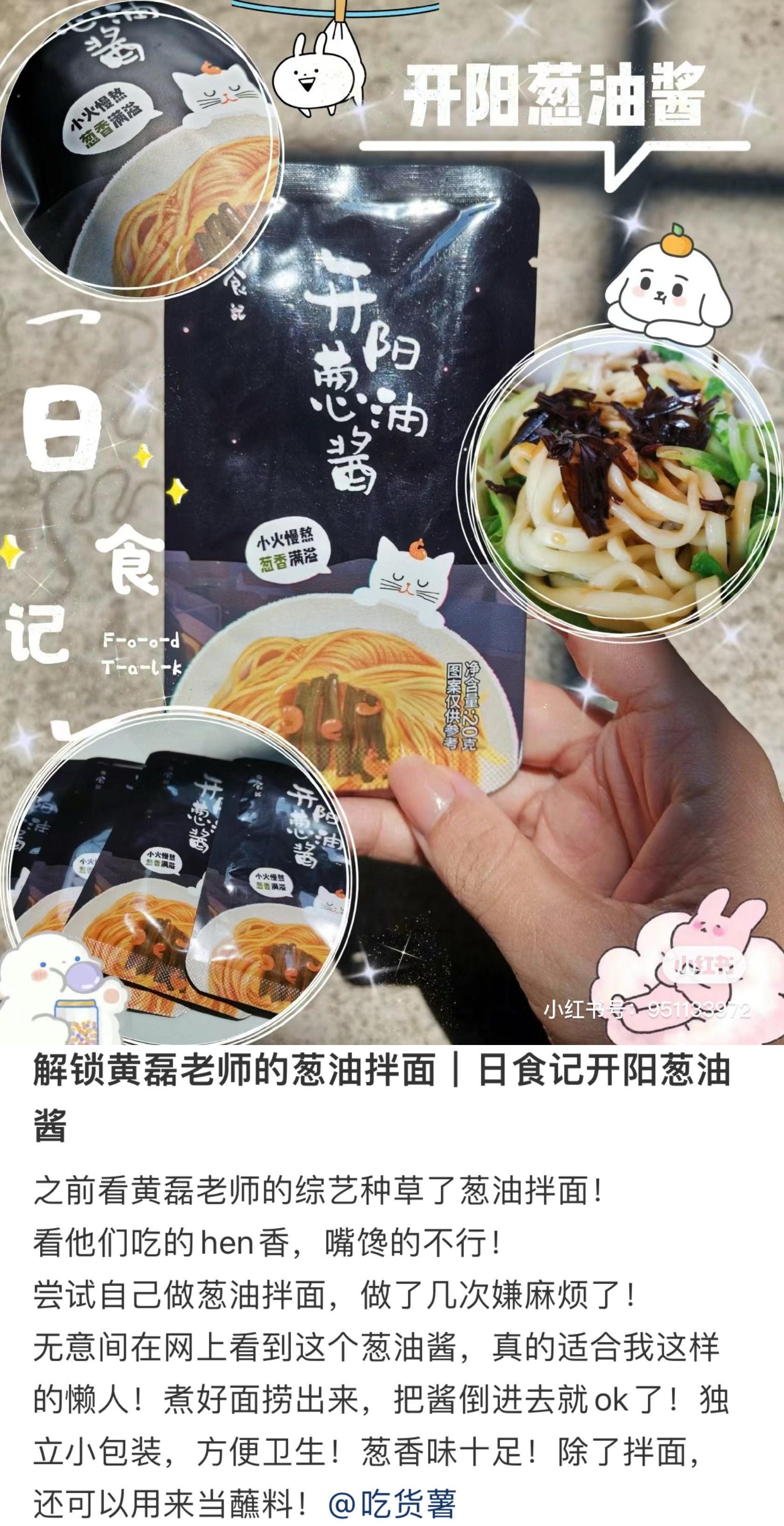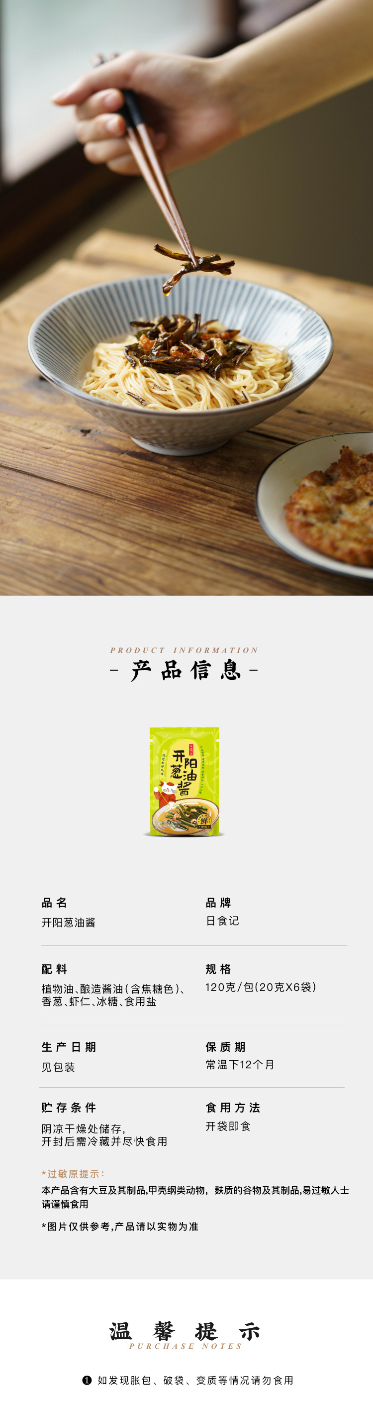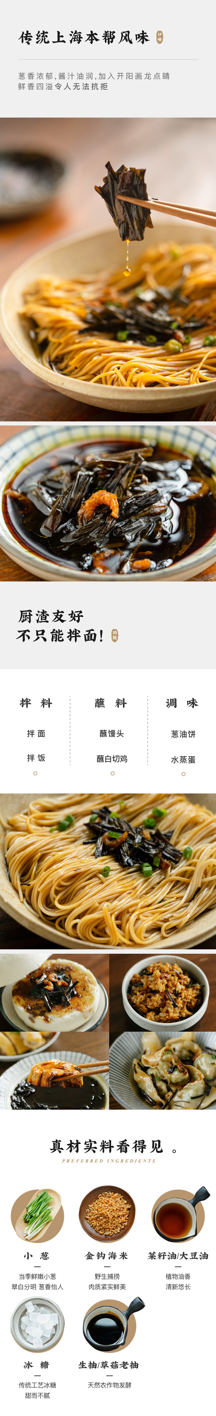 小时候,每当妈妈做葱油拌面,一捞一拌之间,那诱人的香气总是弥漫整个屋子!日食记的开阳葱油酱,也是很还原家常,无论是搭面条还是米饭,都能瞬间唤醒味蕾,让人欲罢不能。咸鲜的味道、浓郁的酱色,再加上开阳的鲜美和葱油的香气,美味程度满分!特别推荐搭配手延素面,再加一颗咸酸梅,真绝配,别的什么都不用放咯!除了拌面,还可以用来夹馒头、拌时蔬、拌馄饨饺子、做葱油饼,也都非常美味哦,等你们试试!