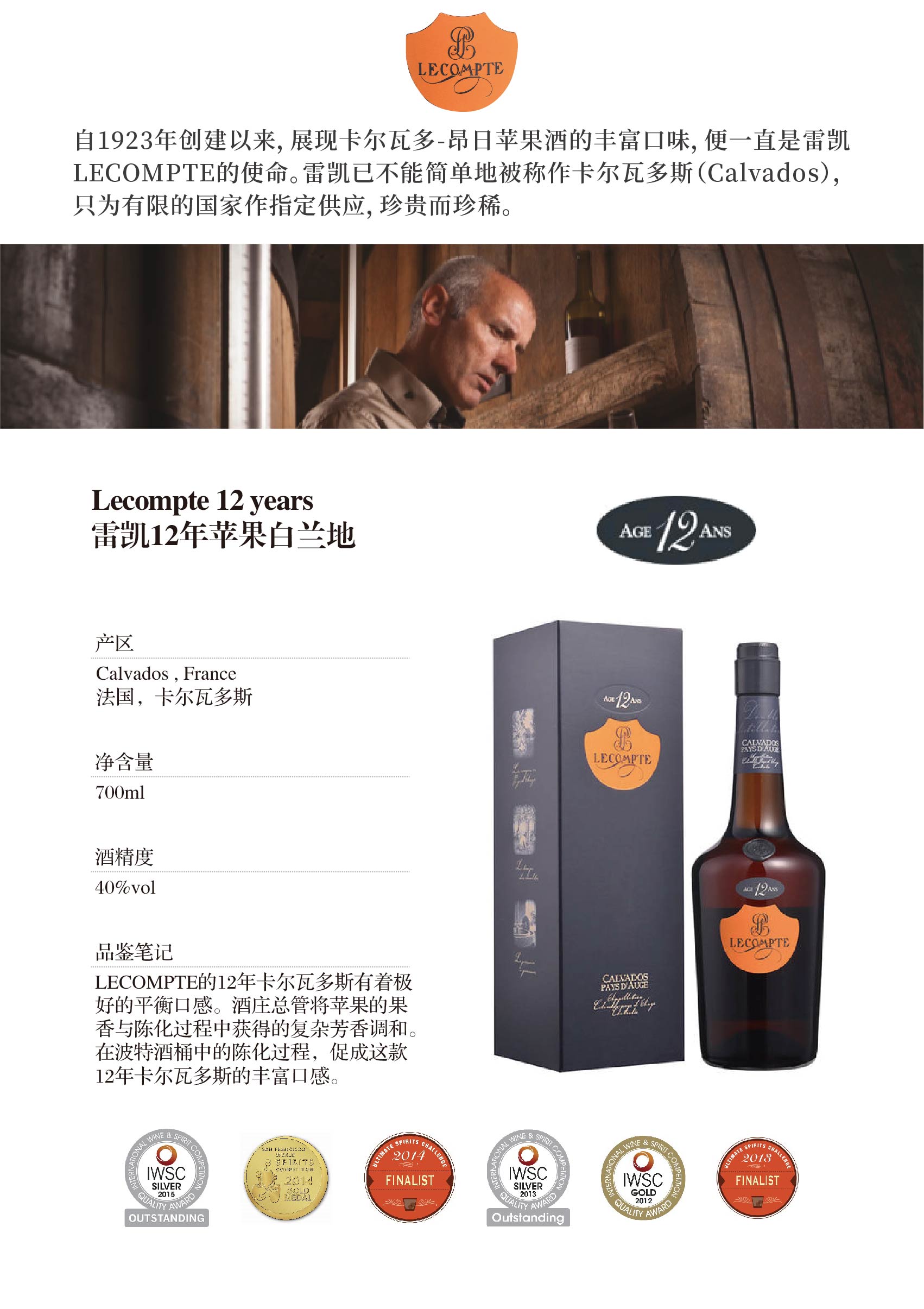 雷凯12年卡尔瓦多斯白兰地 LECOMPTE 12 Ans Calvados Pays d' Auge