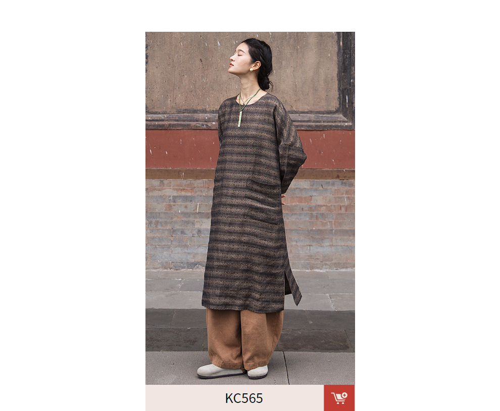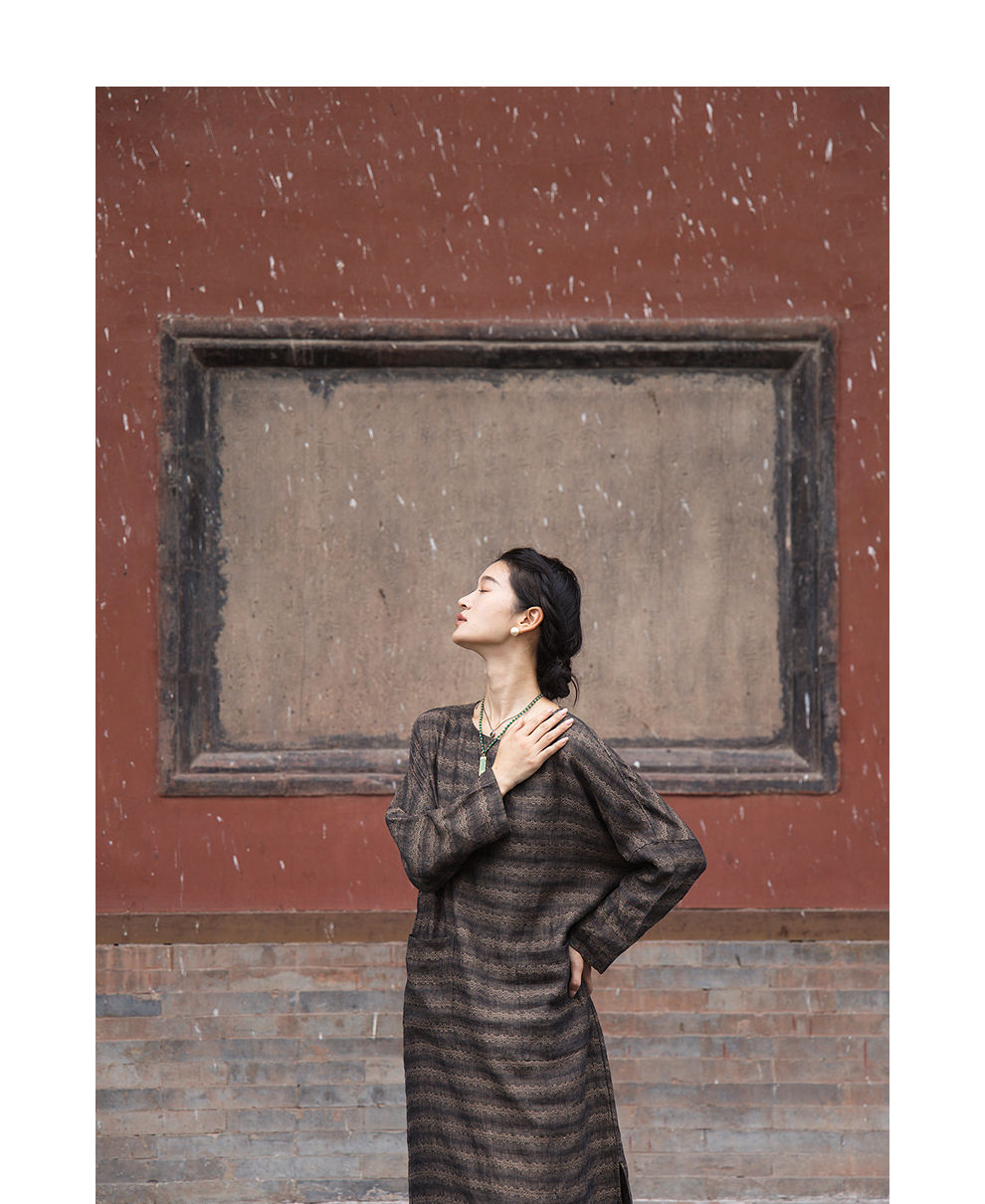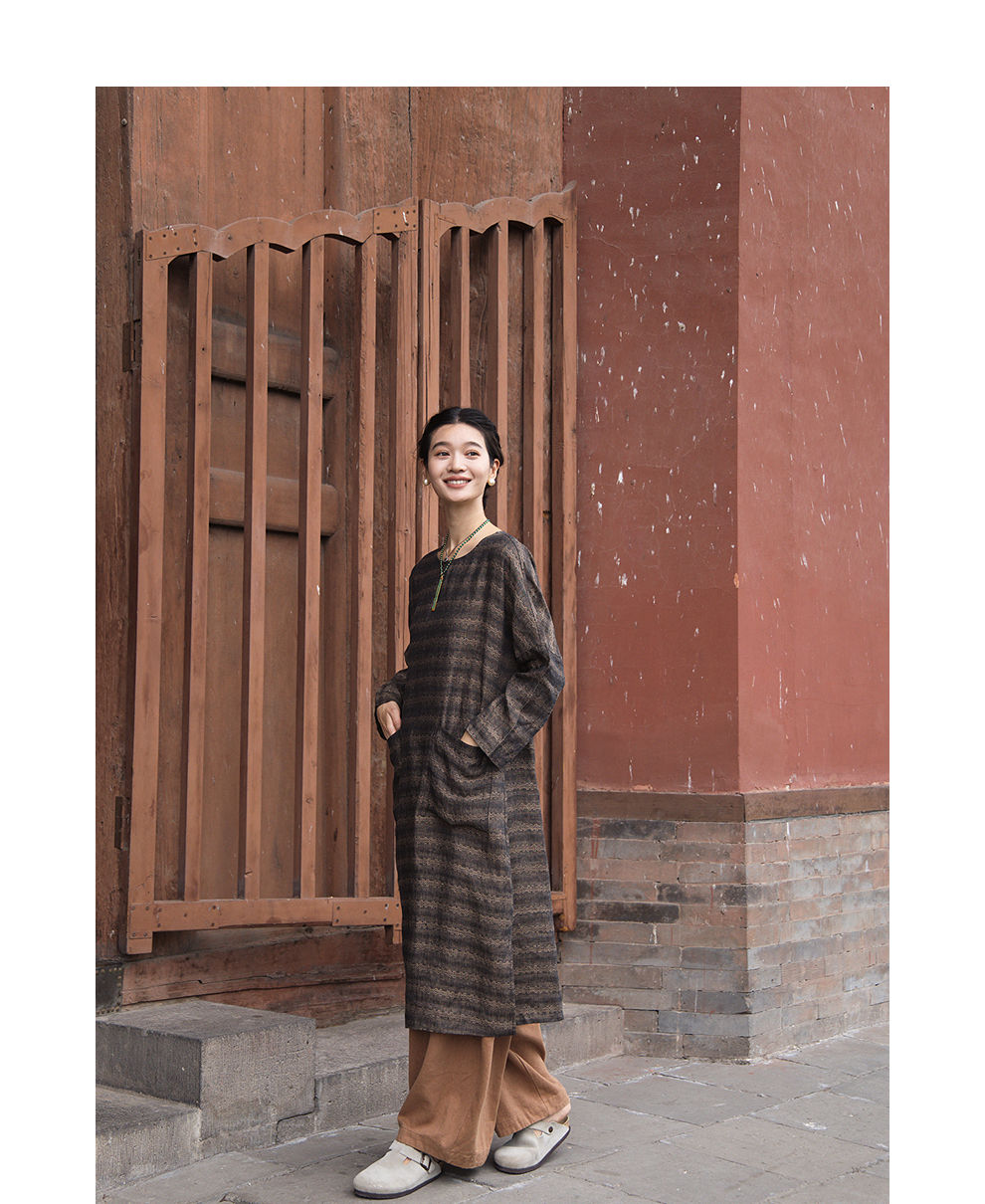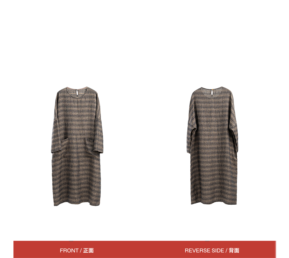 绽放女装585朵/色织亚麻提花圆领落肩袖大口袋长袖文艺连衣裙女秋