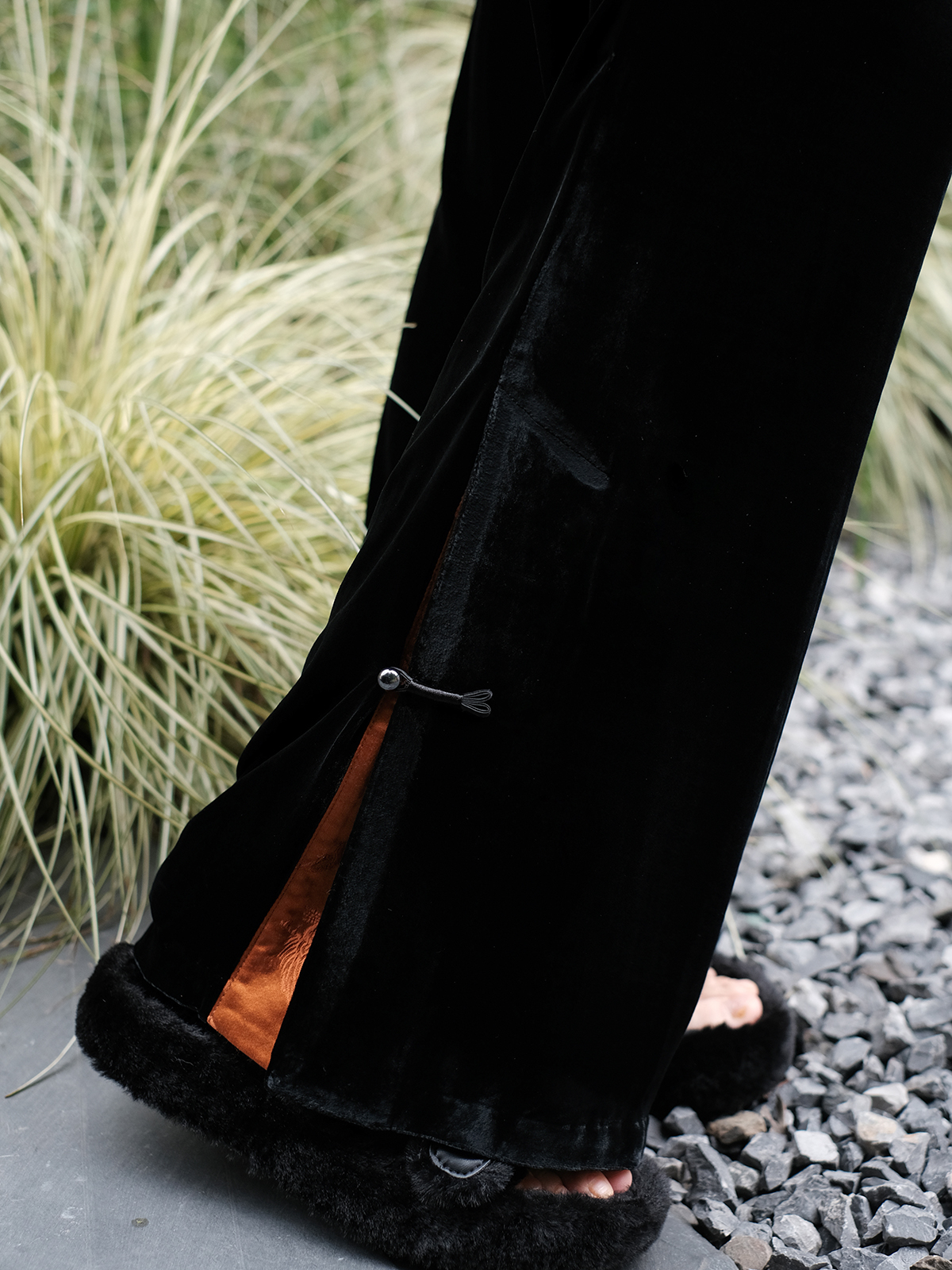 盛唐牡丹 |黑色丝绒松紧腰女裤 焦糖色裤脚口