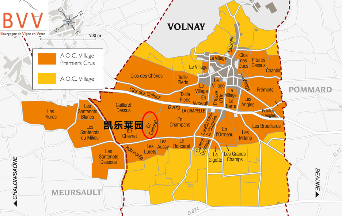 凯乐莱园:位于沃尔奈村西部的坡高处。棕色钙质土壤,侏罗纪基岩,陡峭多石。暗色土壤回温快,陡坡地势和东南朝向获得更多阳光。位于沃尔奈村精华区,Lavalle在1855年时将此园列为全村顶级之列,是强劲且丝滑质地的典型。
