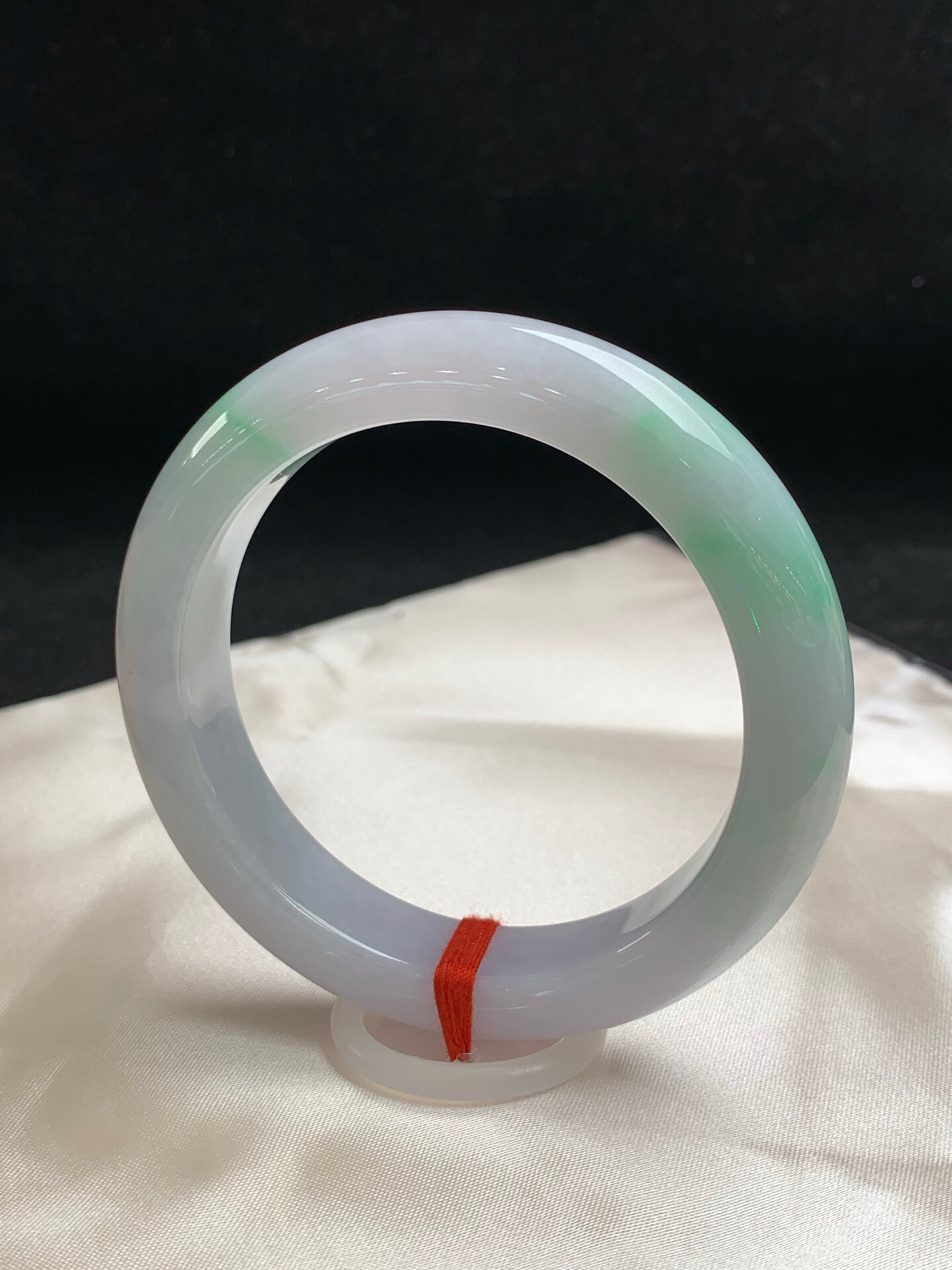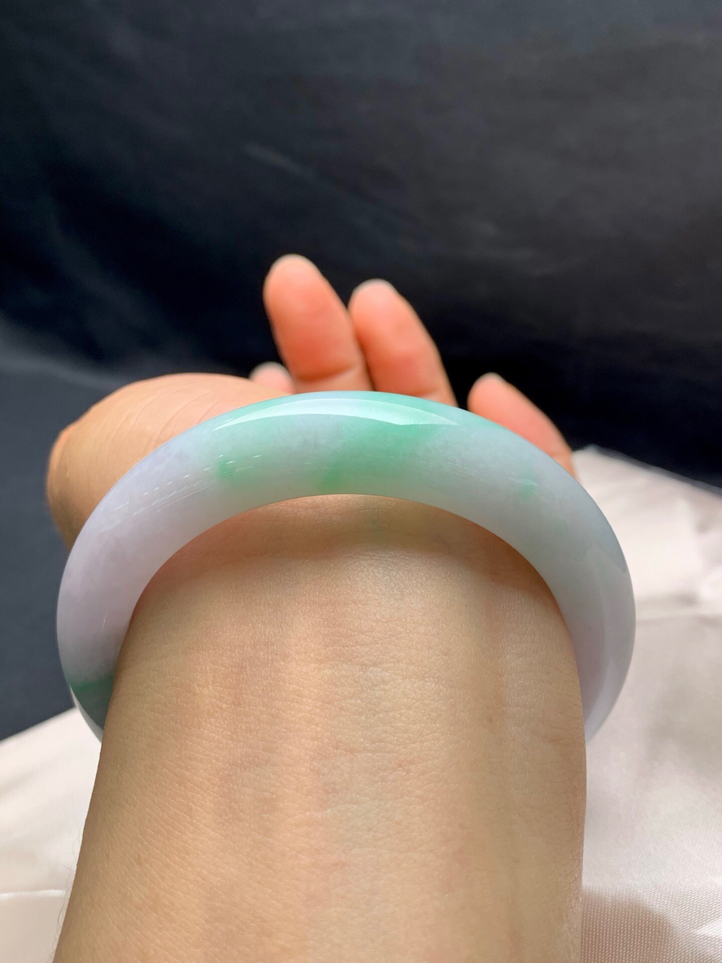 612763,55.8圈口,细糯春彩正圈平安镯,紫底飘绿,条形厚装