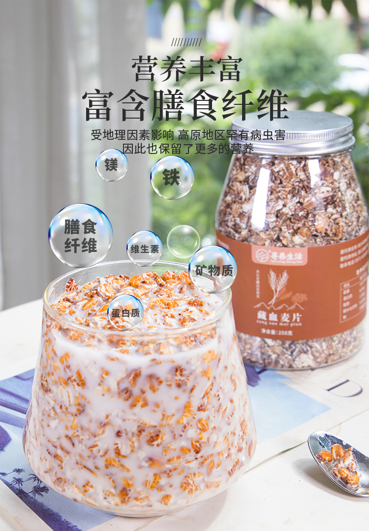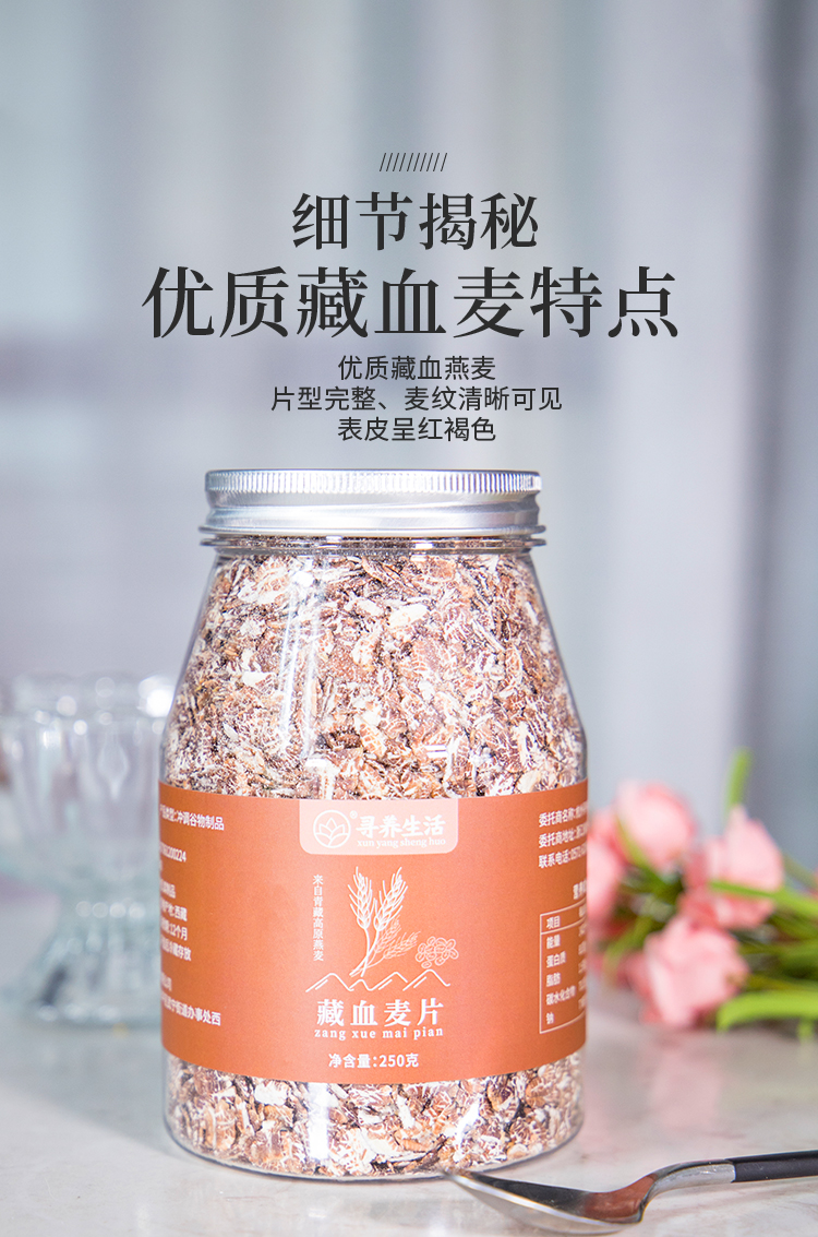 这是来自寻养生活的藏血麦,新品哦!店里也上了寻养生活家好几款健康小零食,都不错!藏血麦如其名,产自西藏海拔2800米以上的青藏高原地区,得益于青藏高原上无污染的生长环境、弱碱性的富硒土壤培养、生态有机肥的滋养以及高山雪山的灌溉,藏血麦天生就比其他品种的粗粮多带一丝高原的灵气,少了病虫的侵害,因此也保留了更多的营养。在藏传医学专著《晶珠本草》记载,藏血麦属于野大麦类作物,其植物的茎、叶、种子均有非常高的养生保健价值,尤其是藏血麦的种子,富含全谷物的所有营养。优质的藏血麦片型完整、麦纹清晰可见,表皮呈现自然的红褐色,非常特别。