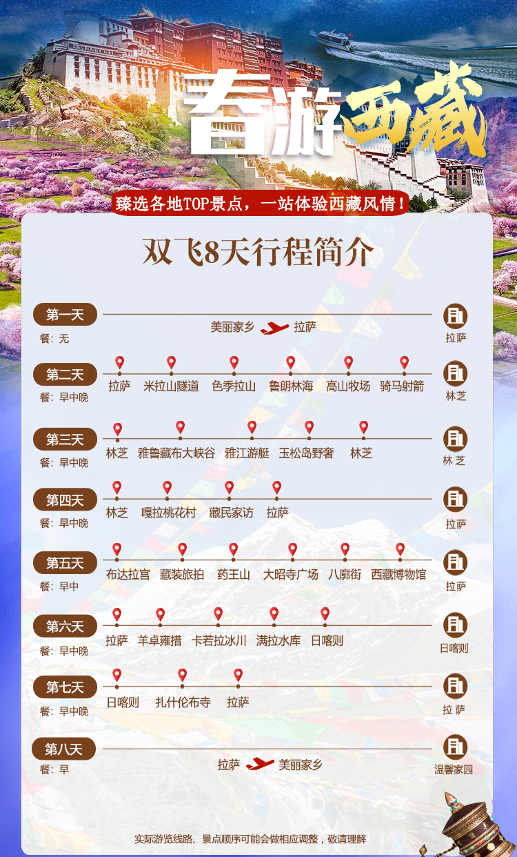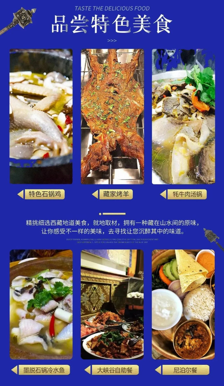 3、 用餐:全程7早12正餐,早餐为酒店含早,行程中大家也会品尝到以下民族特色菜:大峡谷自助餐、烤羊藏餐、石锅鸡、牦牛肉汤锅、冷水鱼宴、尼泊尔餐;