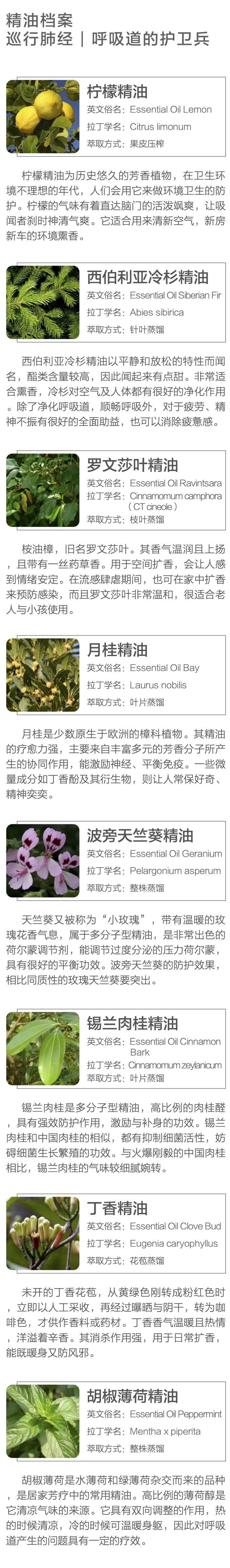 巡精油是由柠檬精油、西伯利亚冷杉精油、罗文莎叶精油、月桂精油、波旁天竺葵精油、锡兰肉桂精油、丁香精油、胡椒薄荷精油复配而成,主要帮助净化空气和呼吸道。精油中的柠檬和西伯利亚冷杉,本身都有净化空气的作用,特有的味道还能提神和消除疲劳;罗文莎叶和波旁天竺葵则是舒缓情绪安定,平衡荷尔蒙;月桂能激励神经、平衡免疫;锡兰肉桂则可以抑制细菌活性,丁香辅助消灭细菌;最后就是胡椒薄荷精油,它可以帮助呼吸系统进行双向调整,冷的时候温暖身躯,热的时候降温清凉,让呼吸道在一个合适的温度中,一定程度上帮助改善哦!