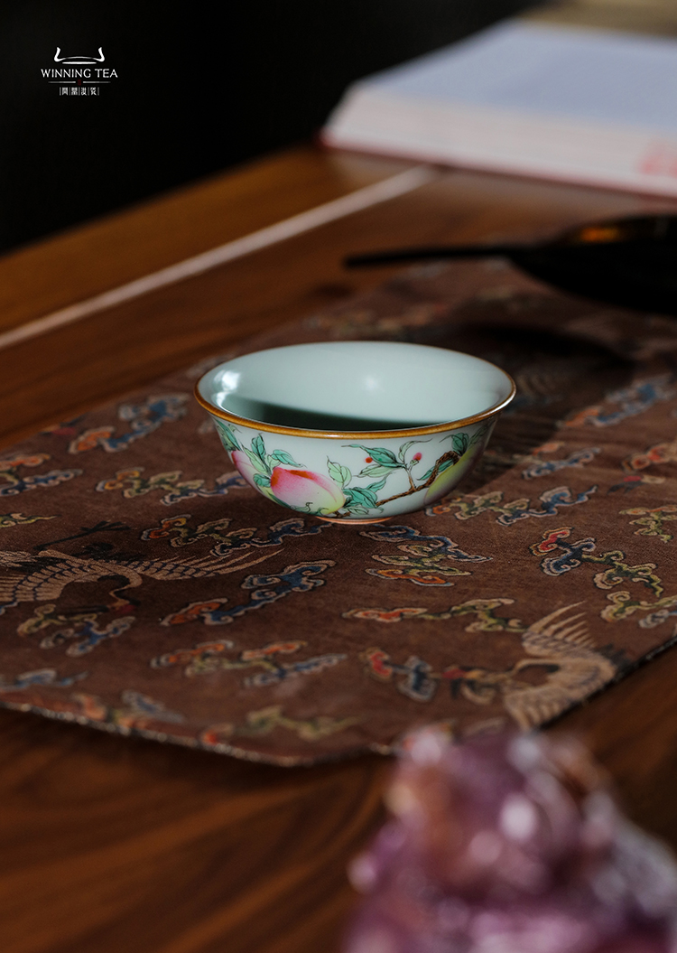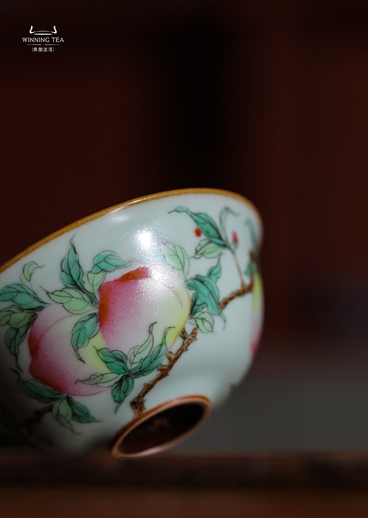 问鼎汝瓷鼎峰柴窑月白观月杯(梵红描金狮子绣球)