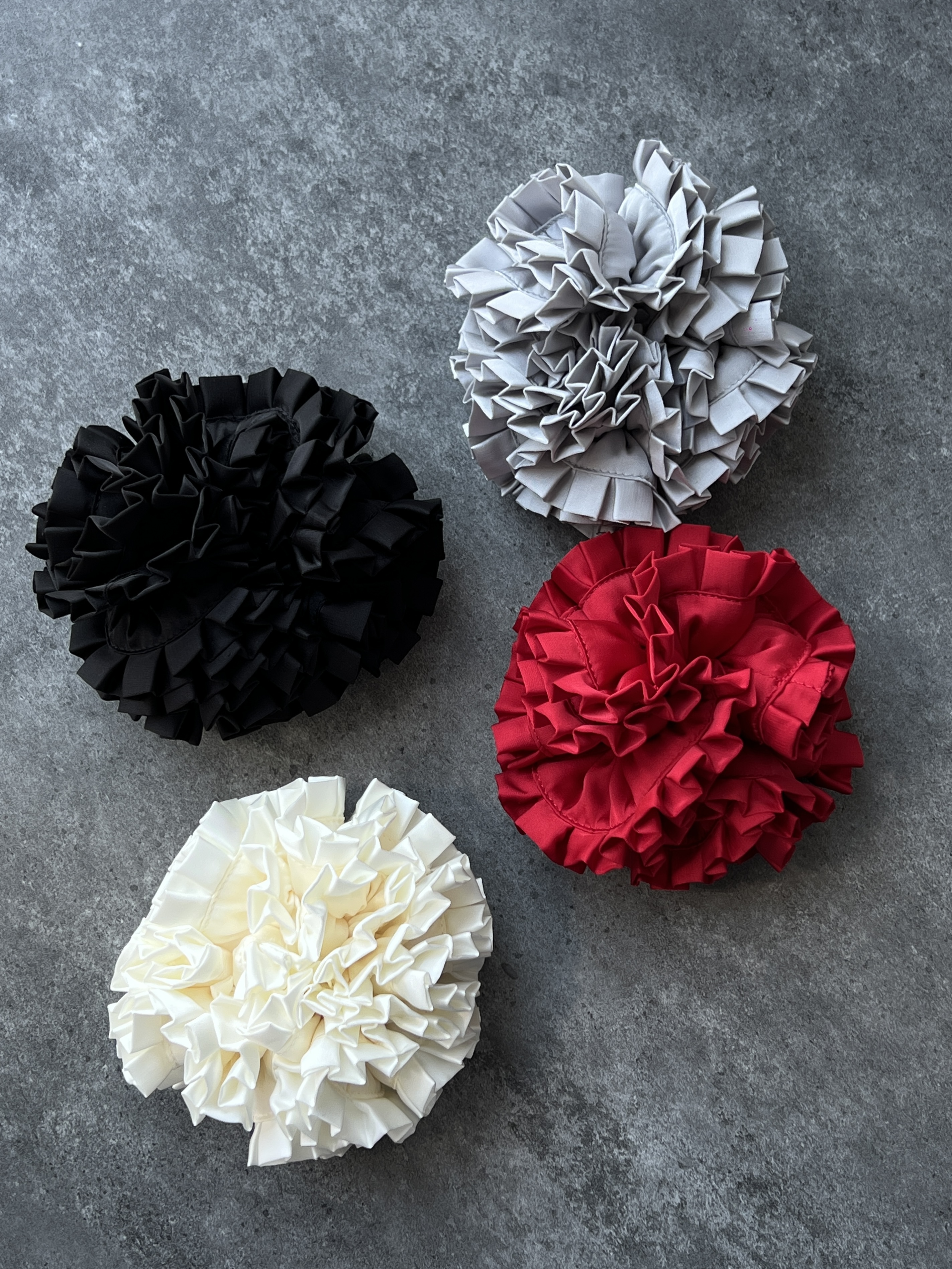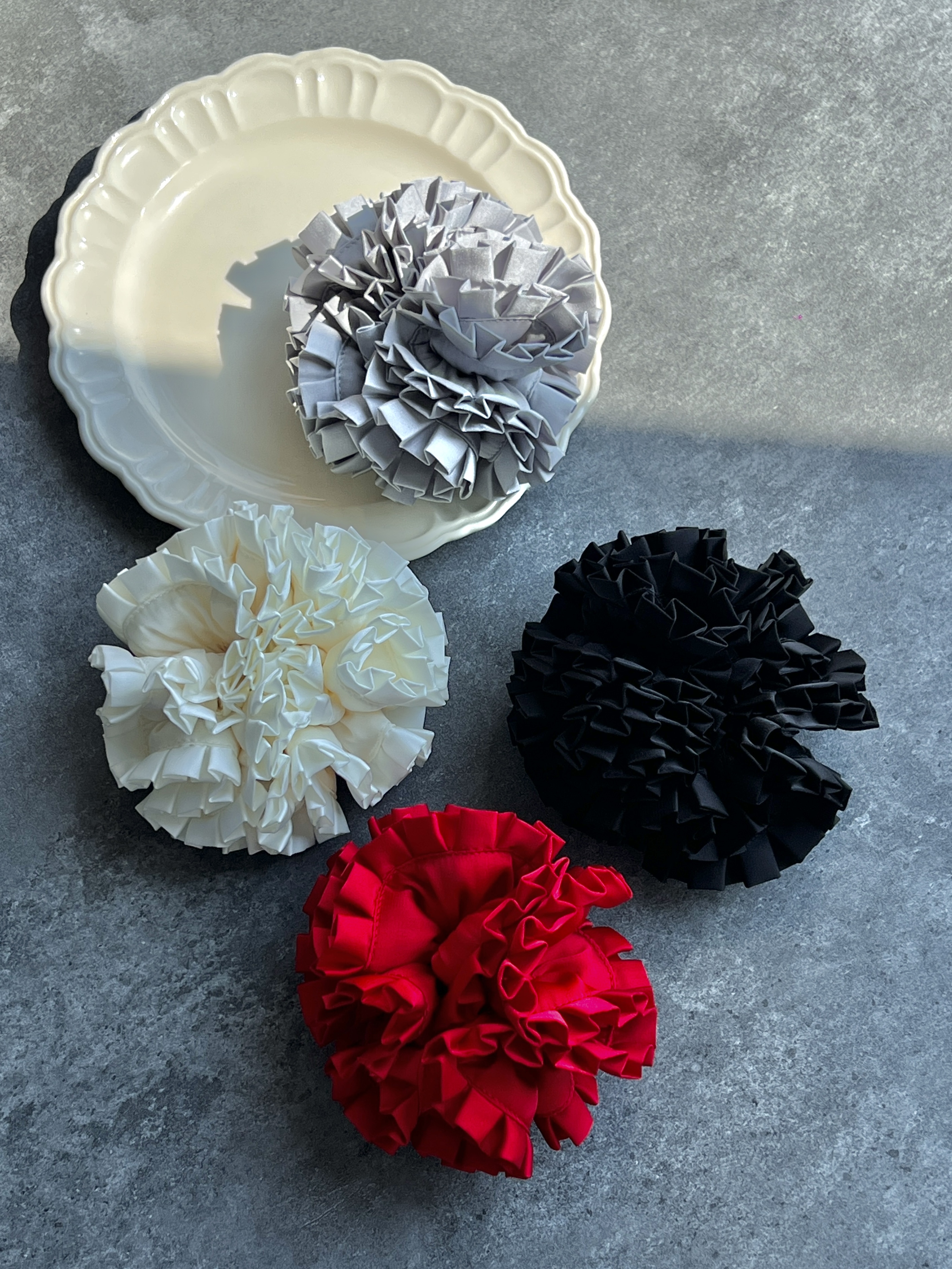 花瓣周边可能会有发黑的情况,主要是因为花瓣是布艺材质,要用烤边工艺才能作出卷曲花瓣形状,工艺需要,不是瑕疵, 请知悉:)