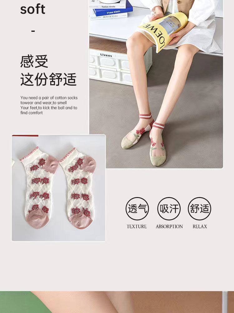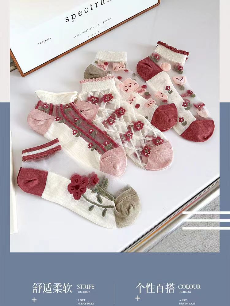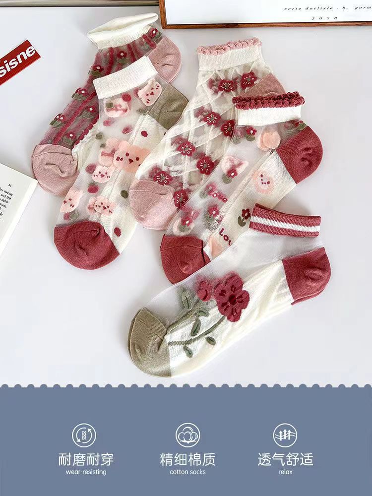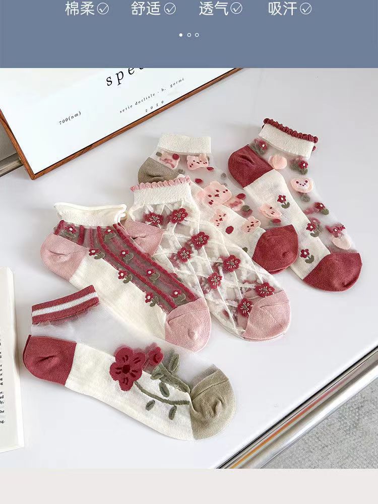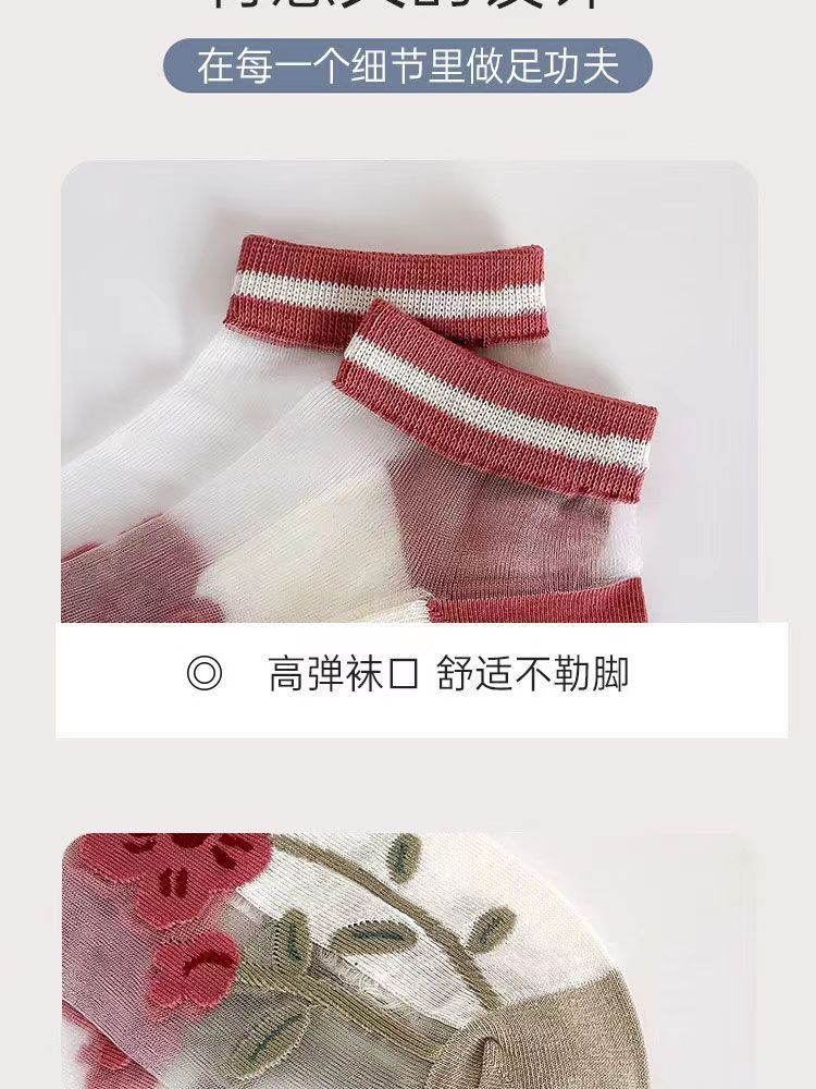 【19.9抢五双!卡丝花朵短袜】夏季薄款猫咪花朵水晶玻璃丝,活性印染拒绝掉色,透气吸汗不闷热,花边甜美网红袜子女短筒袜QQ