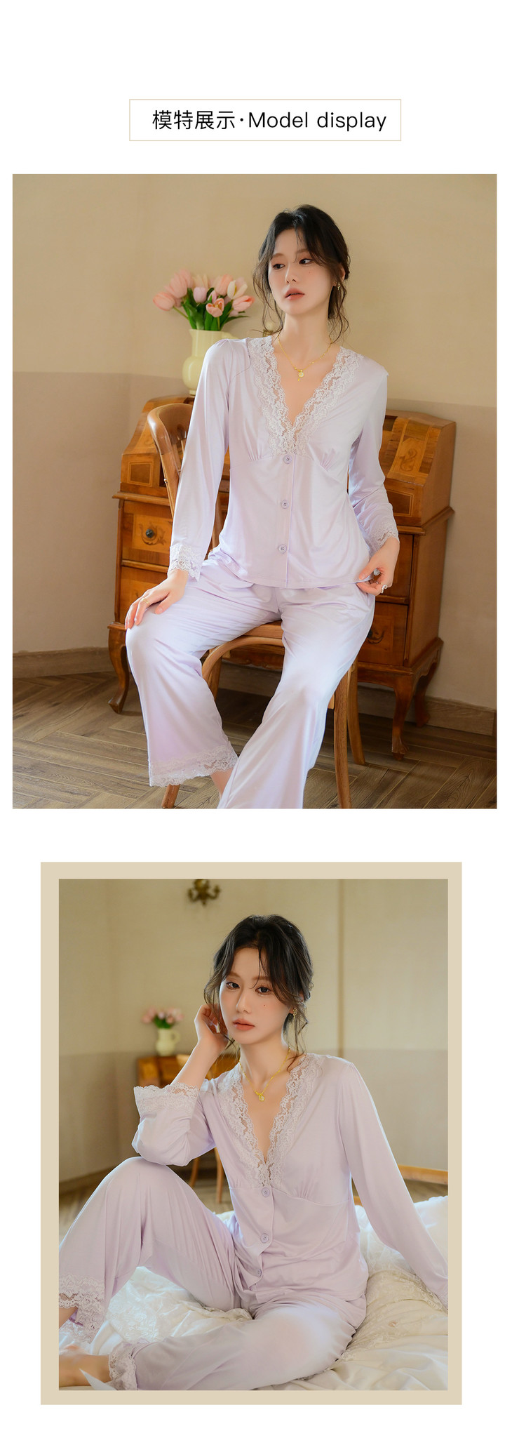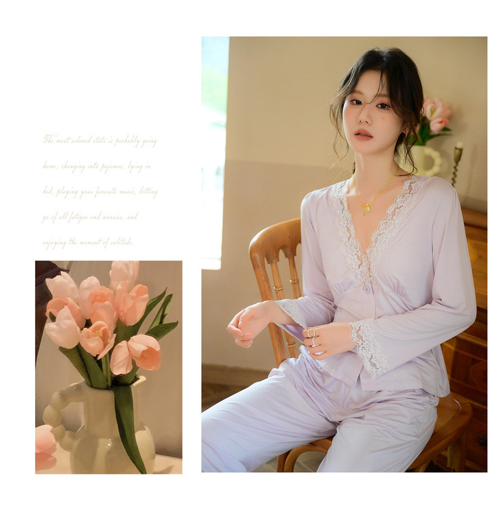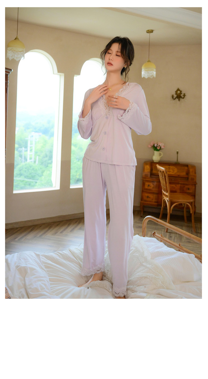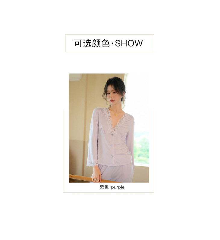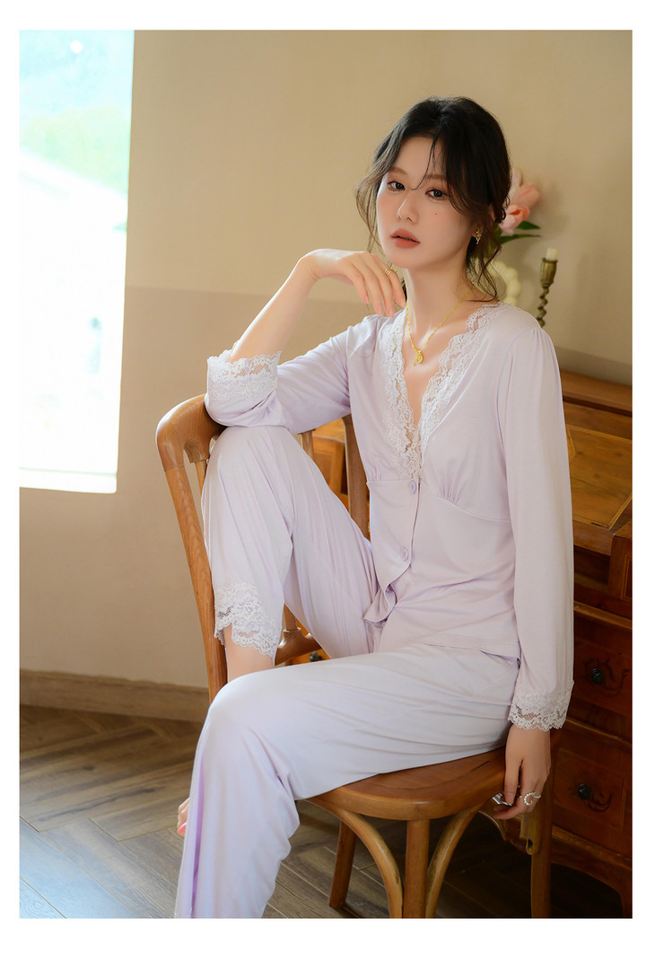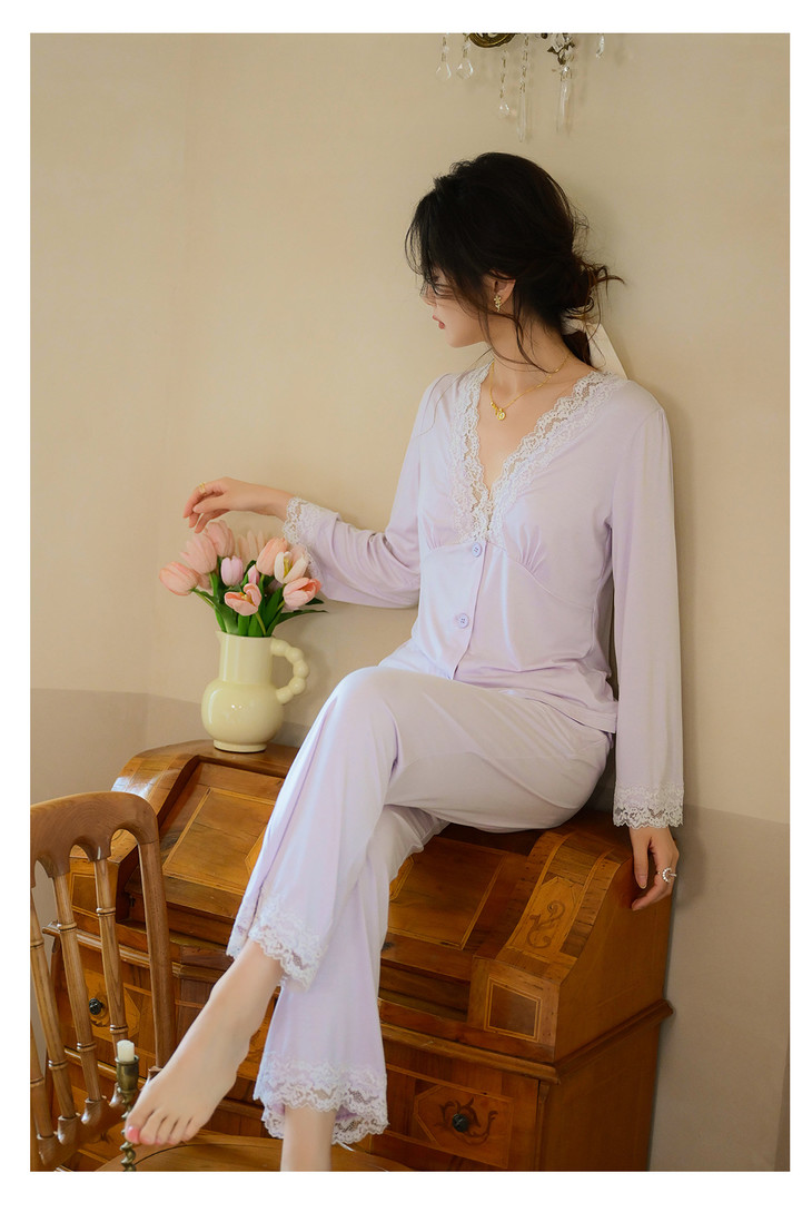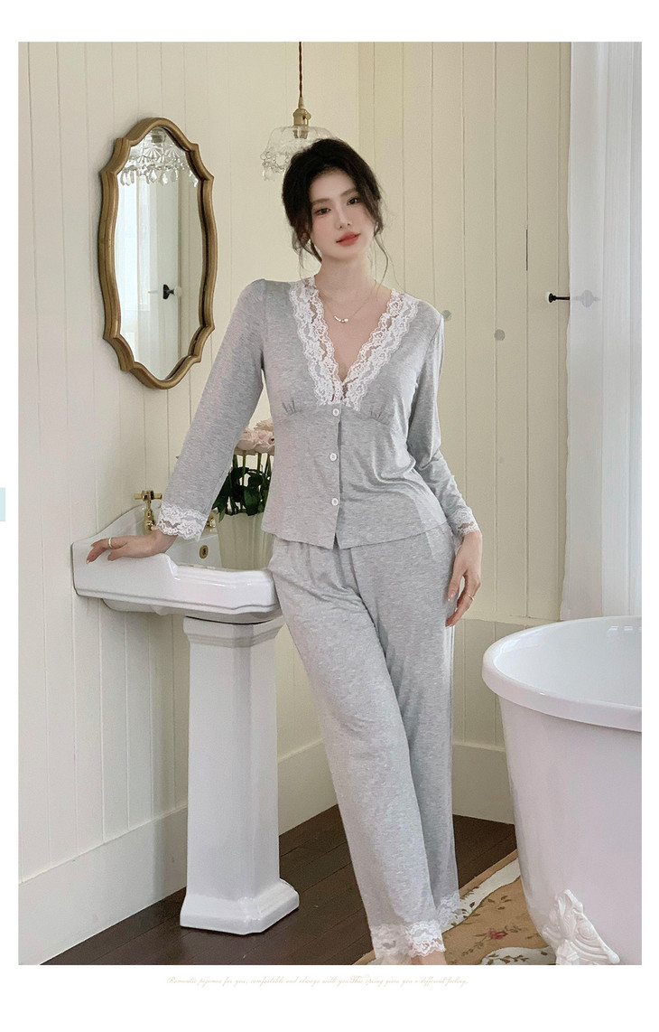 【秋冬严选!蕾丝开衫家居服套装】法式睡衣睡裤女V领棉质春秋季薄款长袖长裤可外穿