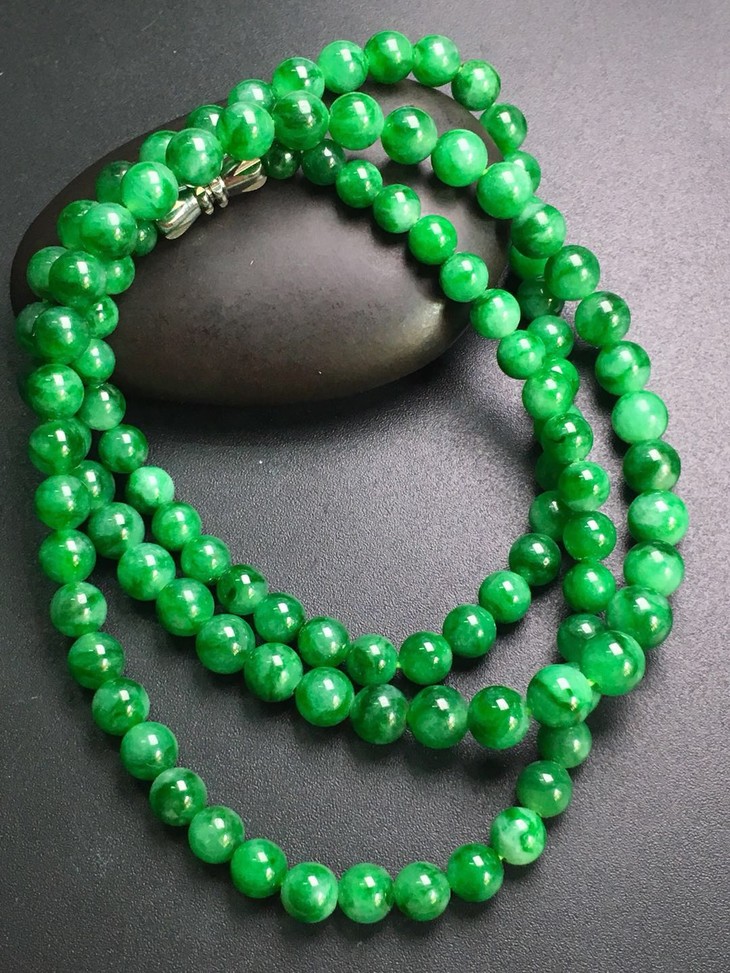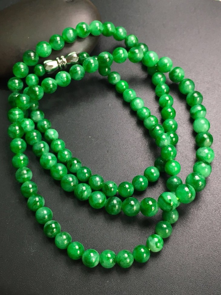 【12353】翡翠冰糯种辣绿珠链,有种有色,水润光泽,珠圆玉润,完美无裂。裸石尺寸:5.2/4mm,超值价10800
