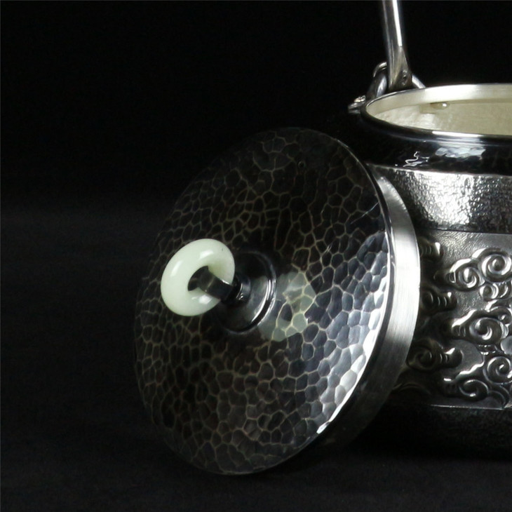 此壶短流,壶身霰打若砖石状,中部似祥云画卷展开,呈现出一片祥瑞气象。造型端庄大气,作工考究,壶盖钮为玉环形翡翠钮,平添华美风韵。