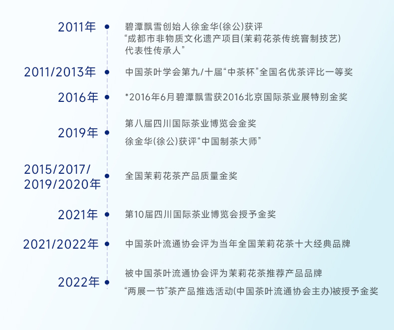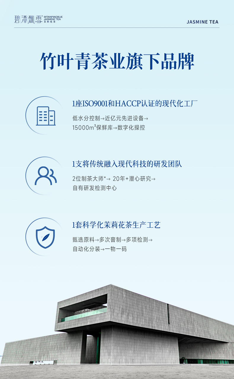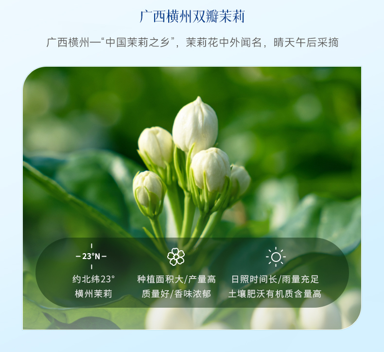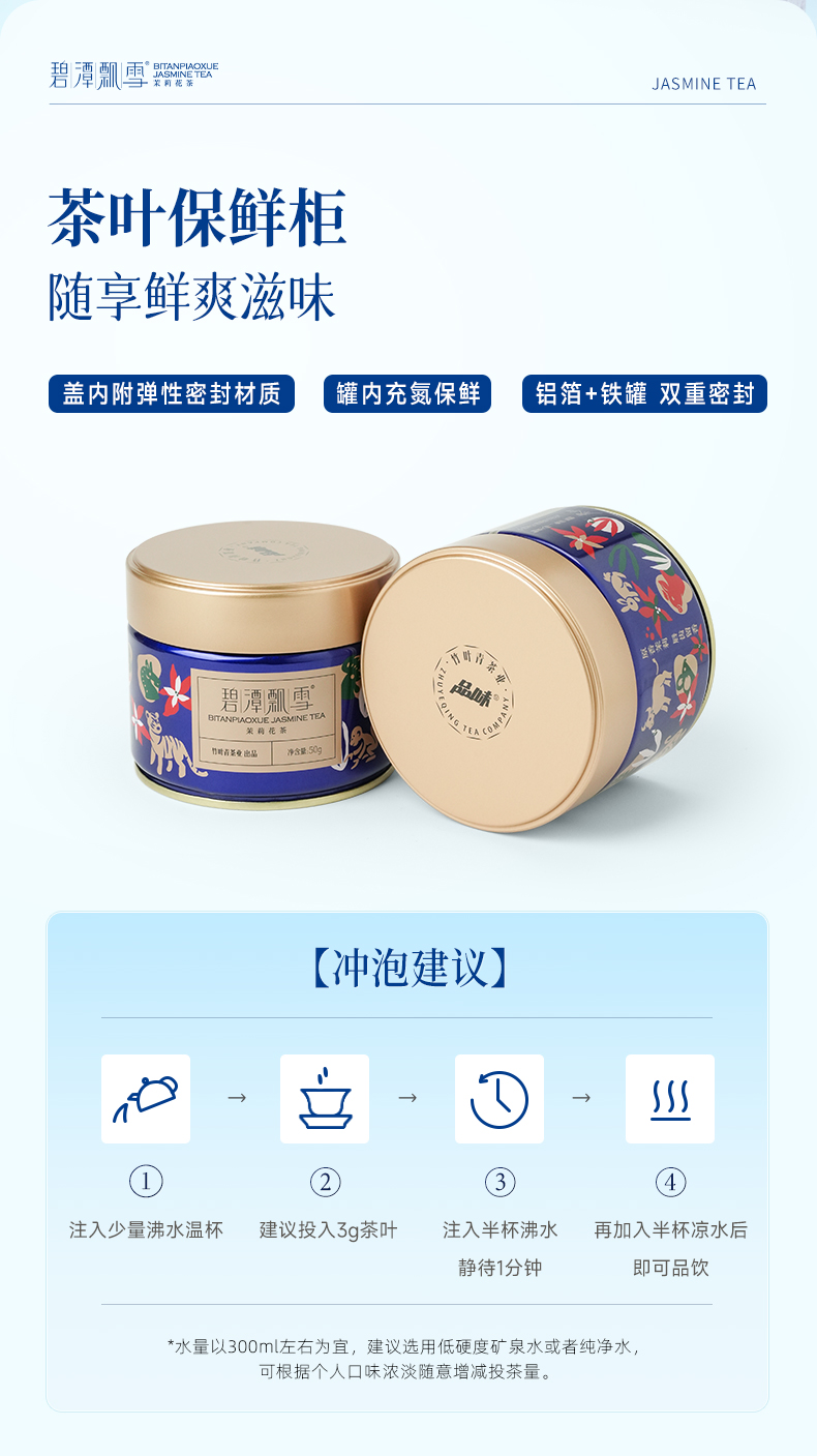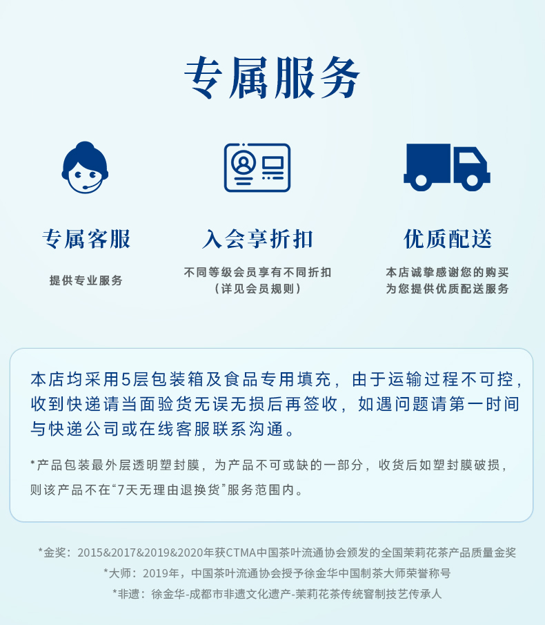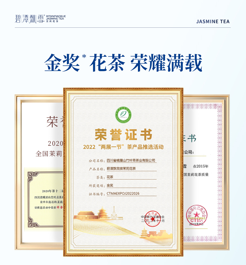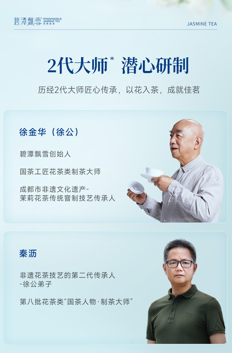 - 中国制茶大师徐金华(徐公)传承 古方制作技艺 开创新派茉莉花茶 精选峨眉高山明前春茶 配以广西横县双瓣茉莉 花与茶,黄金配比 时间酝酿,层层历练 花香与茶香交融 盖碗之间 仿佛茉莉花在舌尖绽放