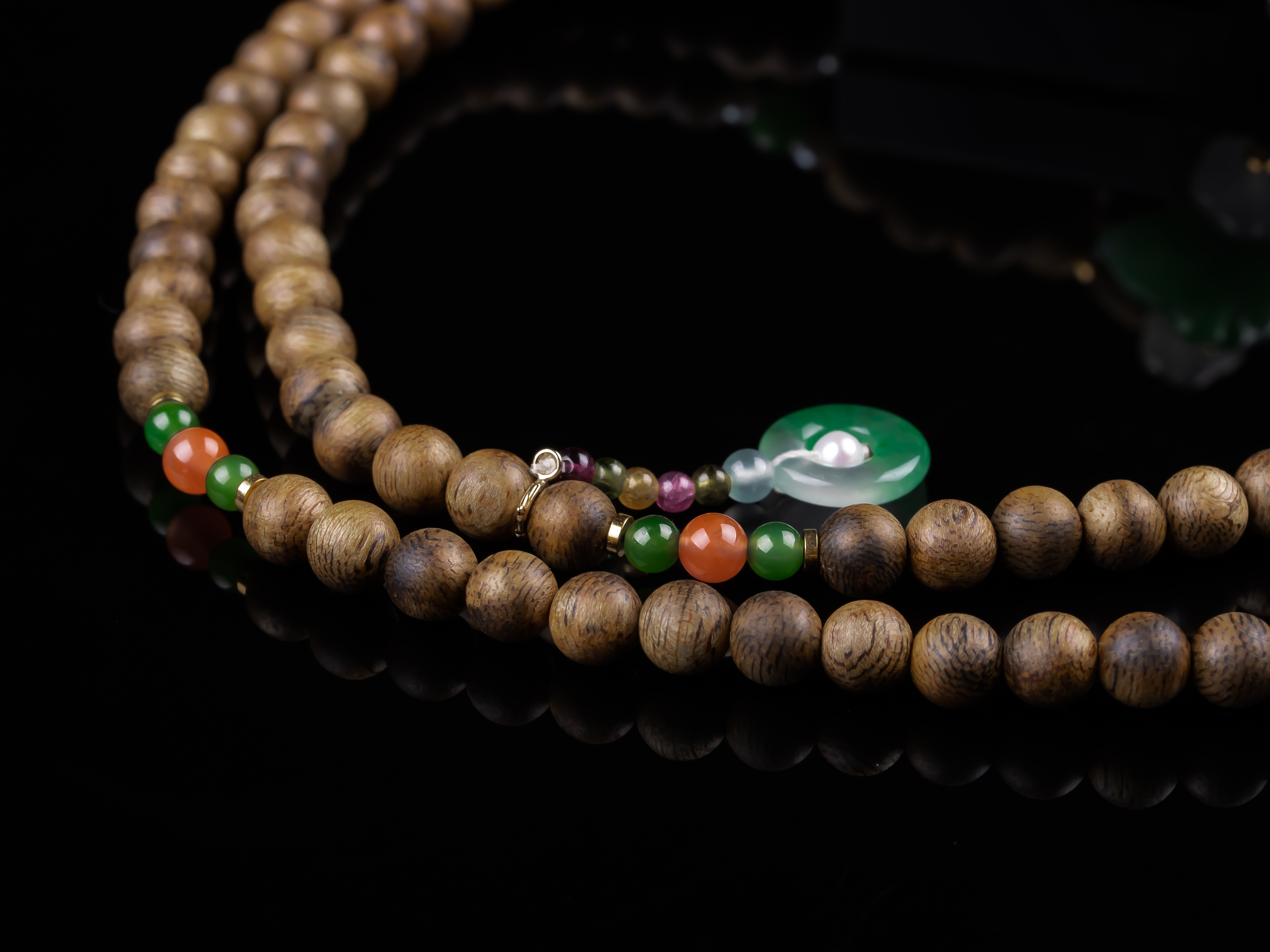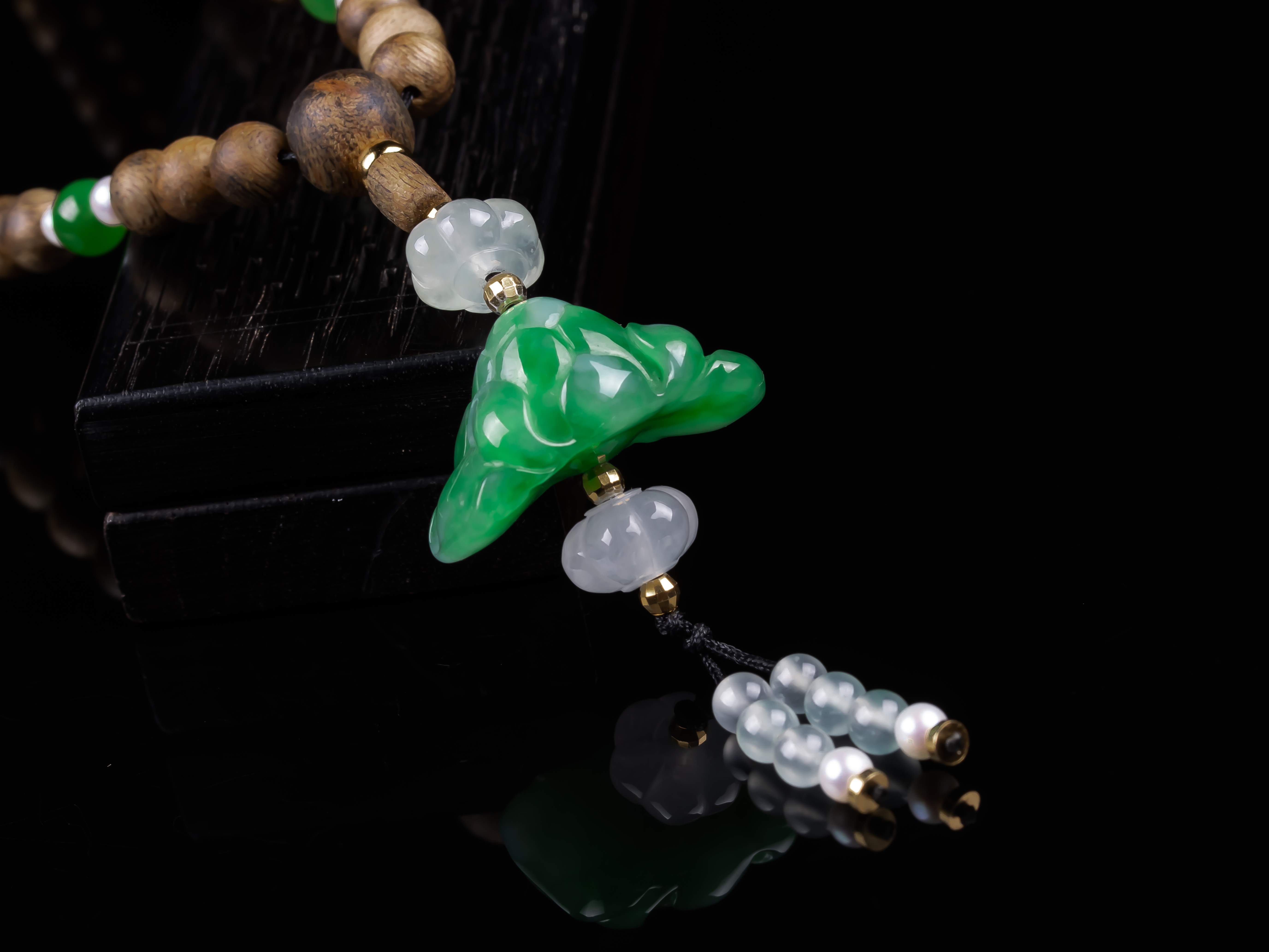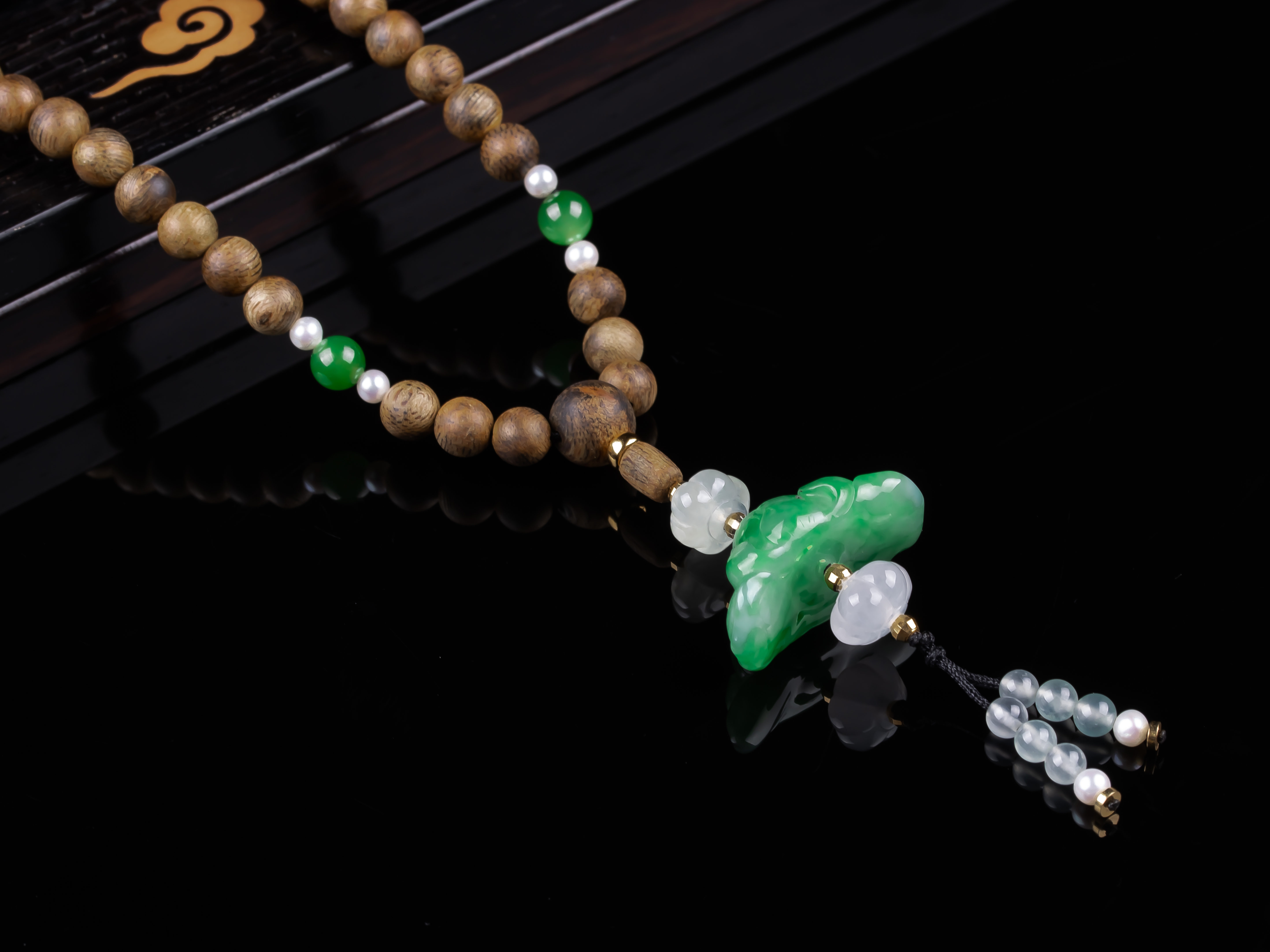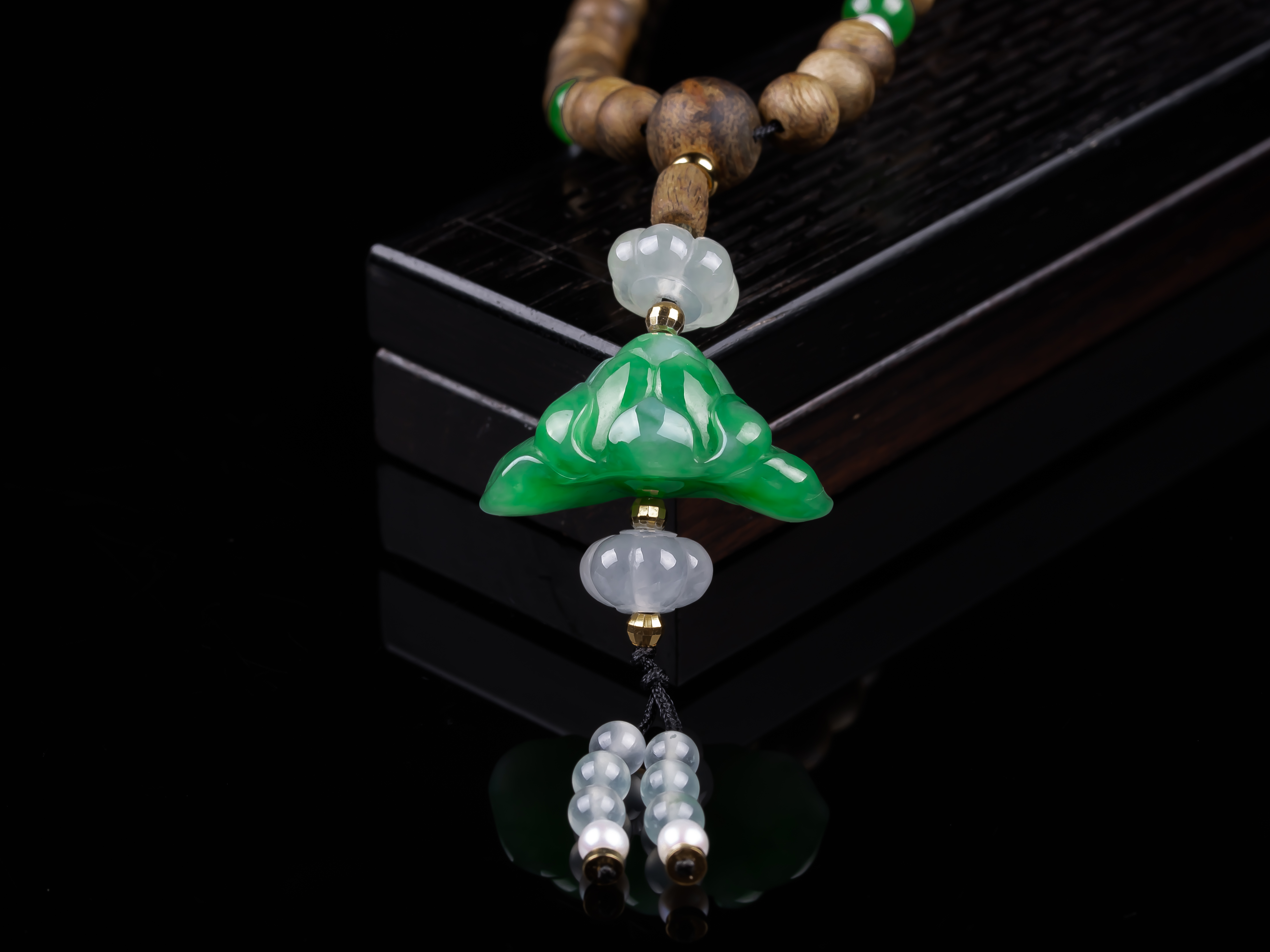 XY0298沉香+翡翠莲蓬挂件,天然沉香约6.3mm,原色原味,香味自然清甜。配珠:南红、珍珠、碧玺、碧玉、非洲翠、925银。几乎满色的翡翠莲蓬,两颗白冰种翡翠瓜珠,冰清玉洁,出污泥而不染,整体穿搭典雅高洁、朴素中又活动有爱,高贵典雅的东方艺术之美。