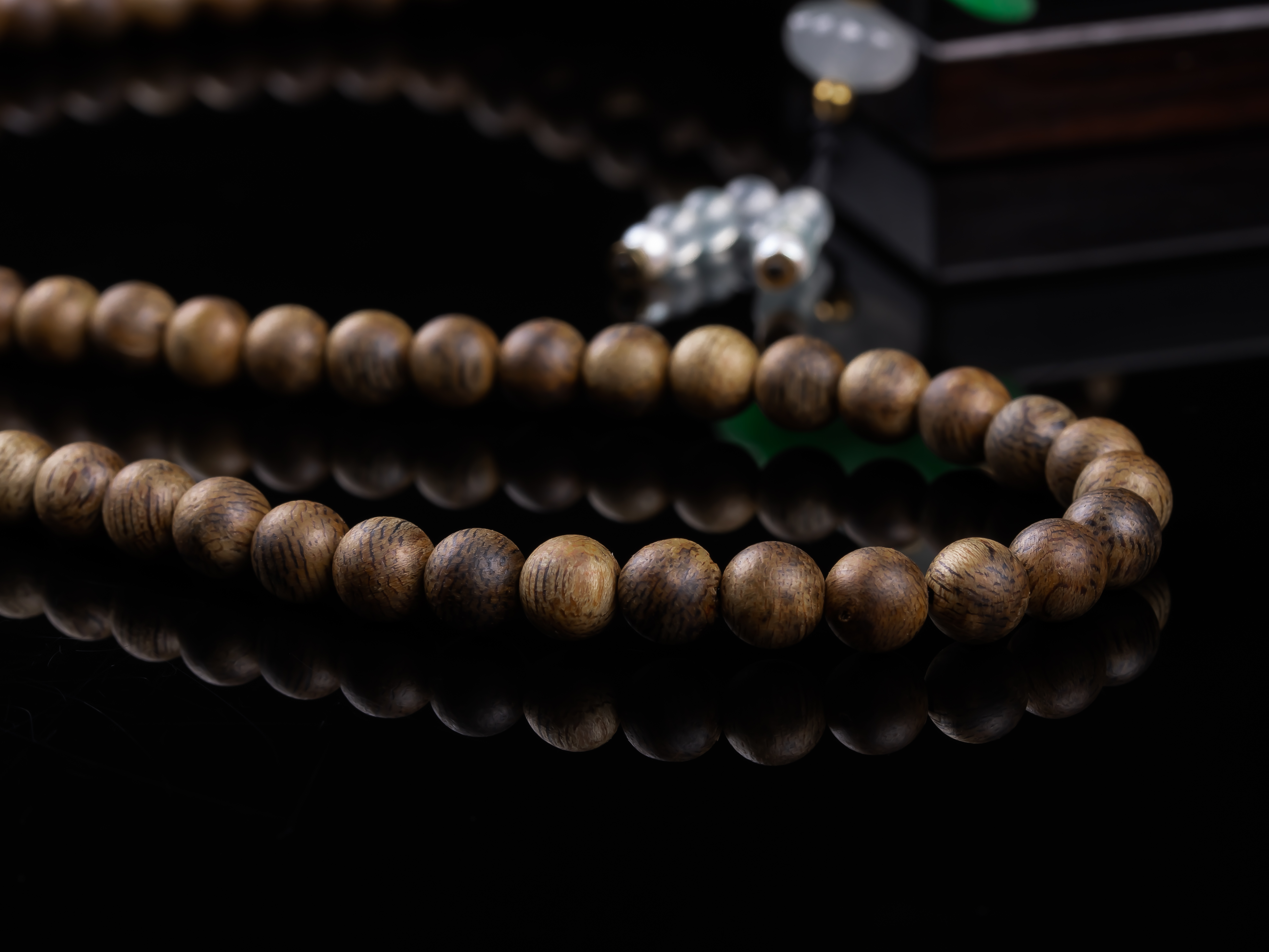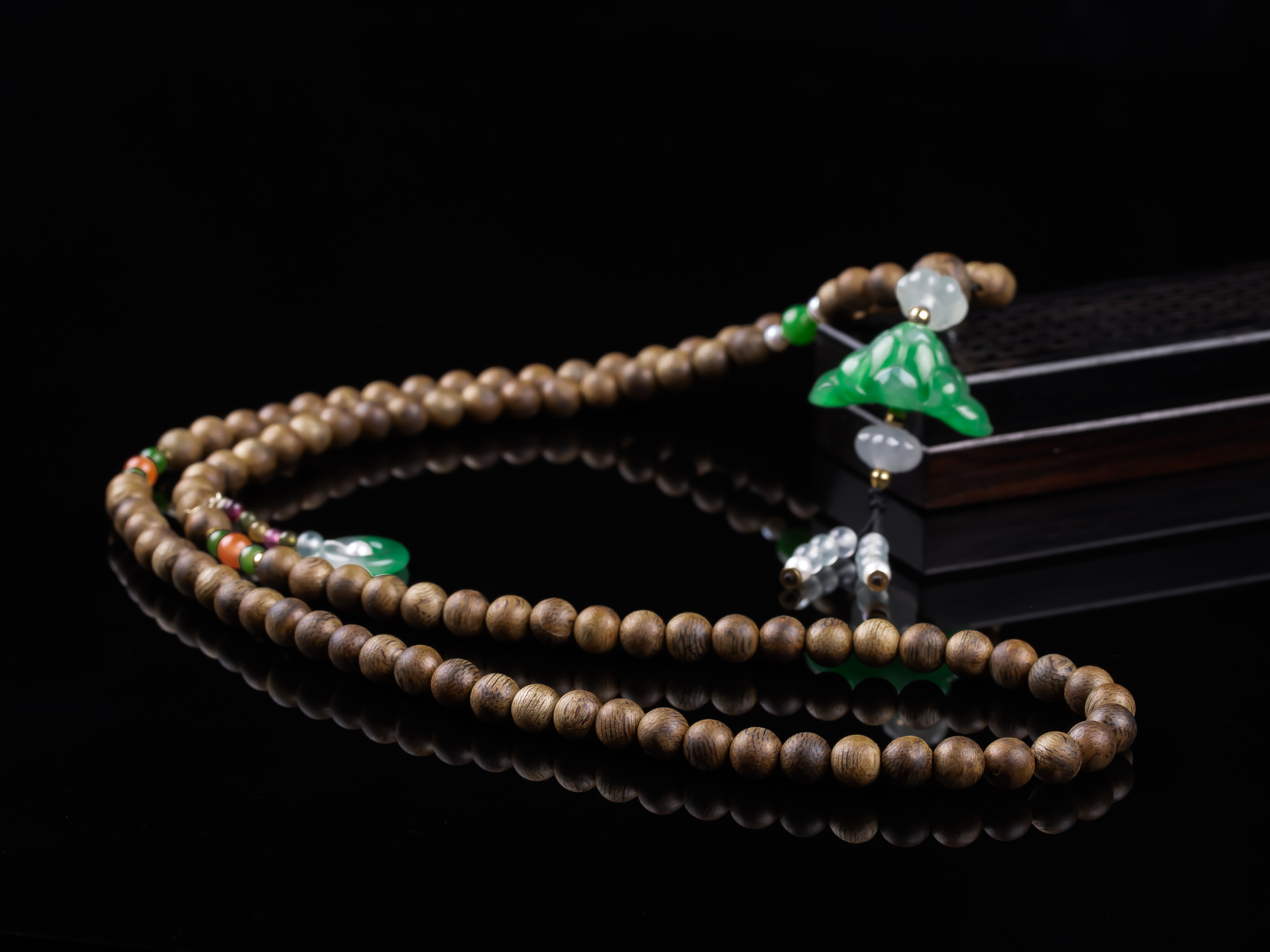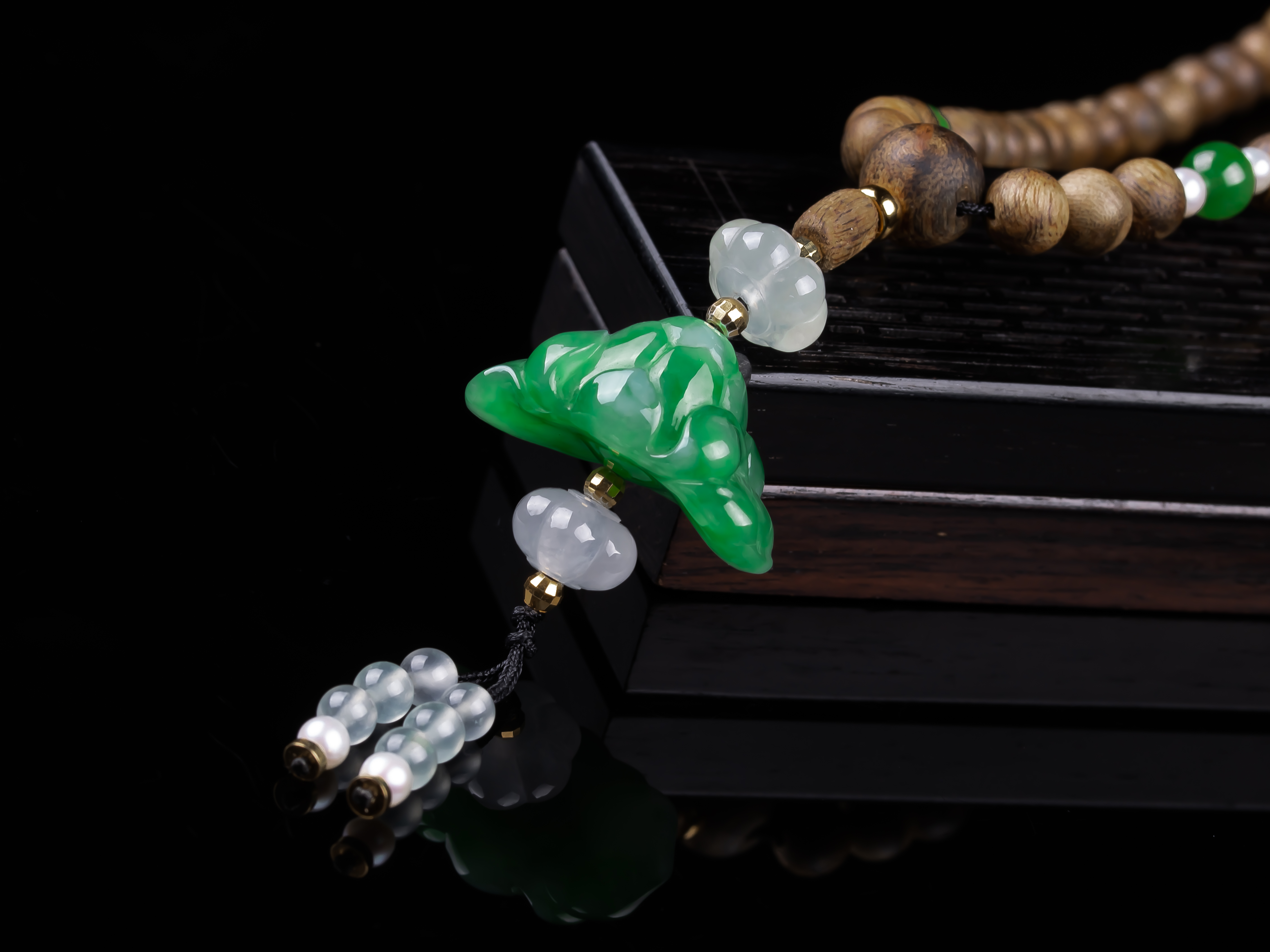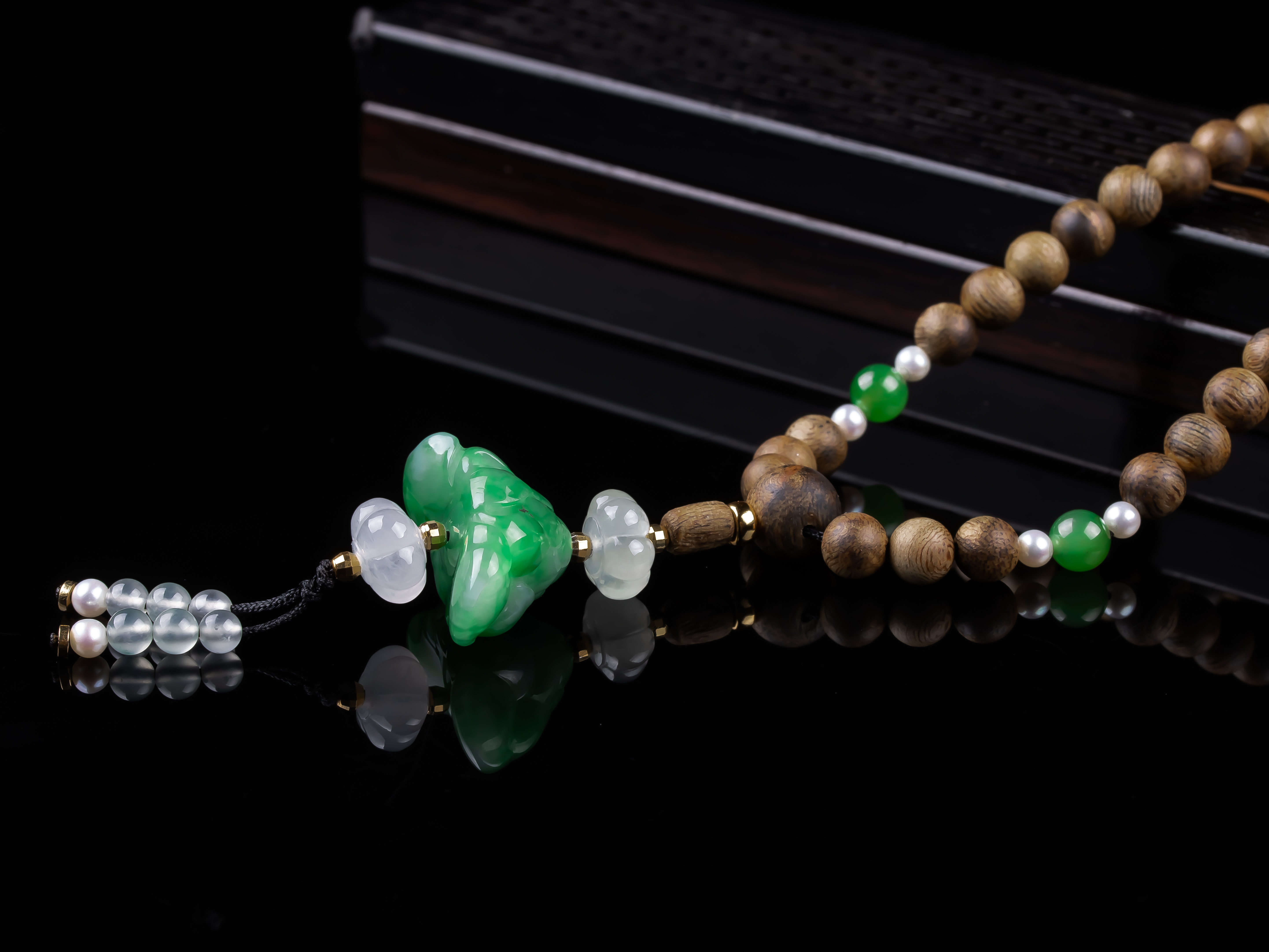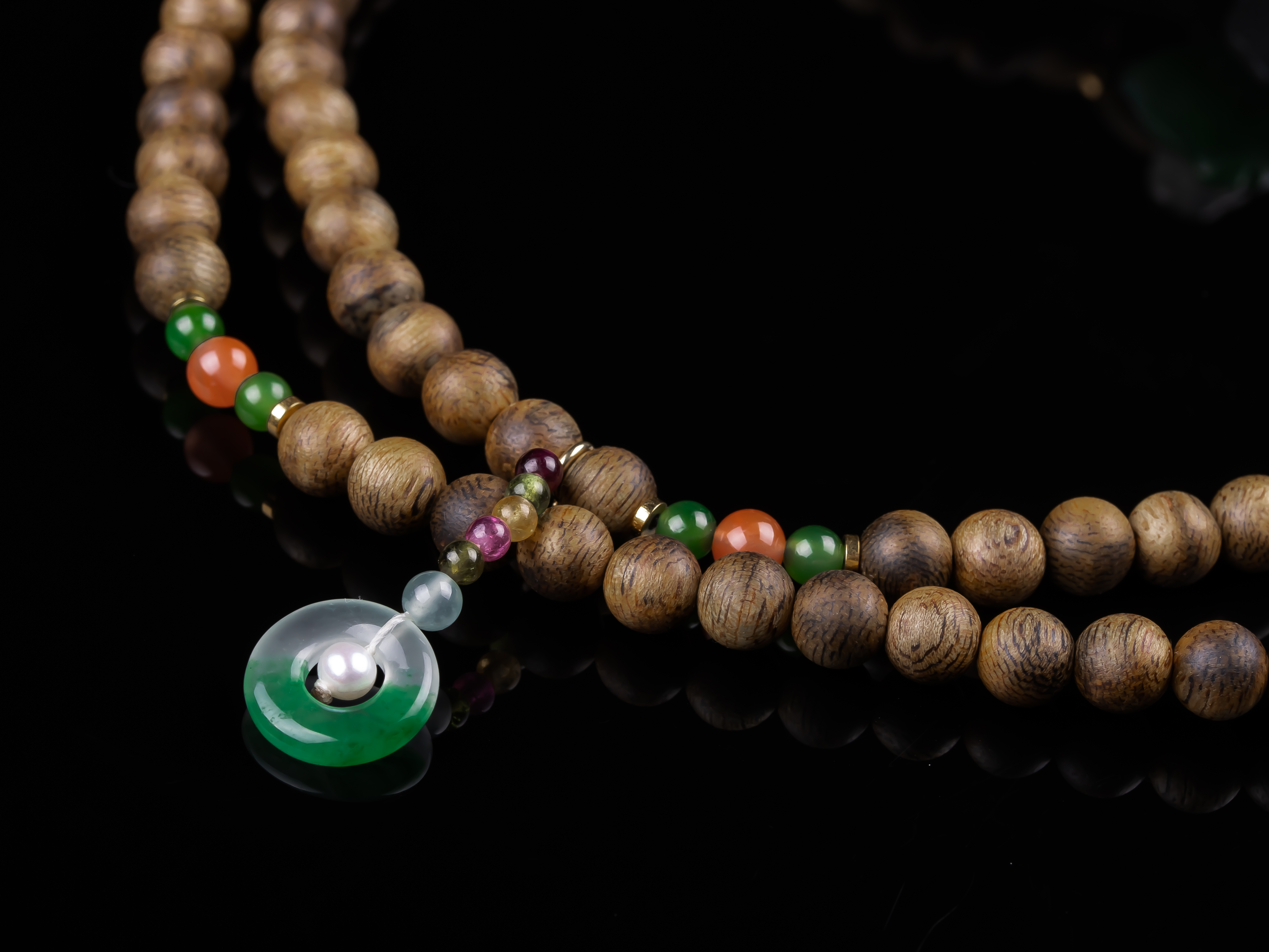 XY0298沉香+翡翠莲蓬挂件,天然沉香约6.3mm,原色原味,香味自然清甜。配珠:南红、珍珠、碧玺、碧玉、非洲翠、925银。几乎满色的翡翠莲蓬,两颗白冰种翡翠瓜珠,冰清玉洁,出污泥而不染,整体穿搭典雅高洁、朴素中又活动有爱,高贵典雅的东方艺术之美。