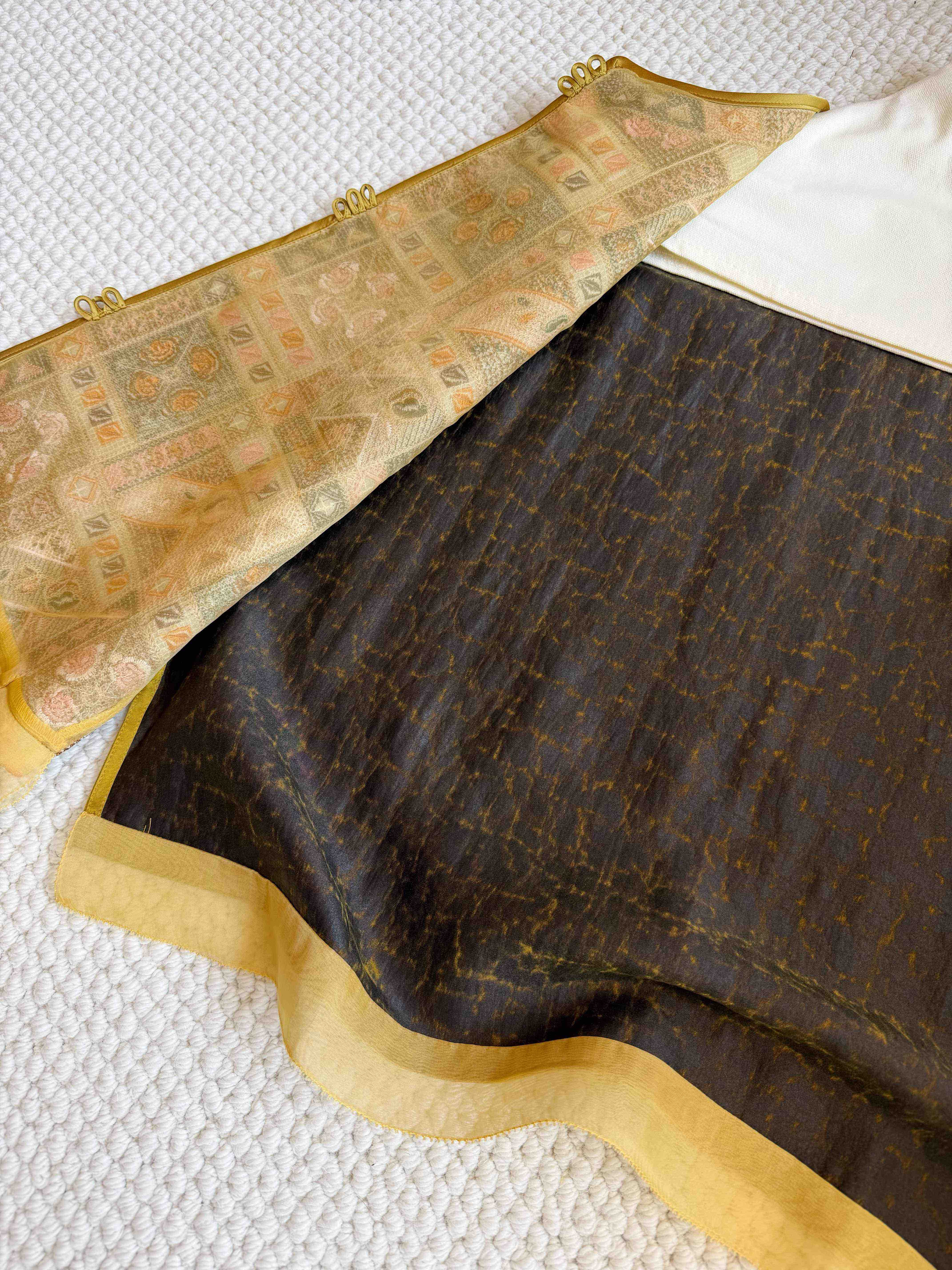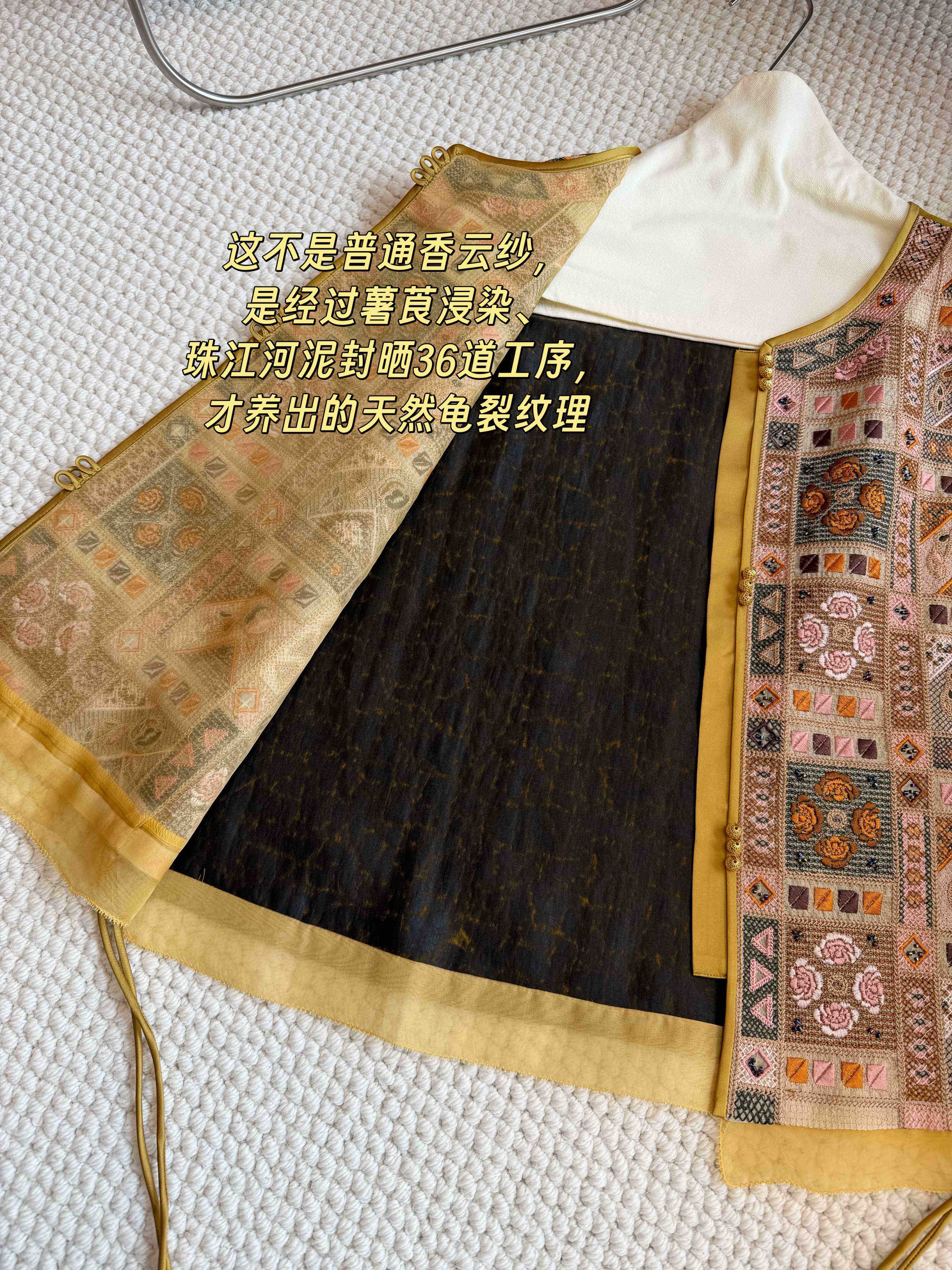 是经过薯莨浸染、珠江河泥封晒36道工序,才养出的天然龟裂纹理,100米面料里只能挑出15米合格的,懂行的都知道这叫“一寸龟纹一寸金”。100%桑蚕丝底布,夏天穿自带凉感,不闷汗、不粘身