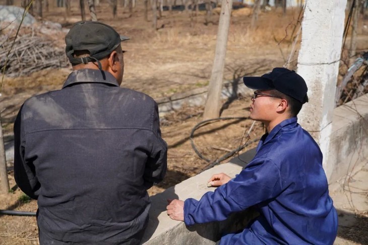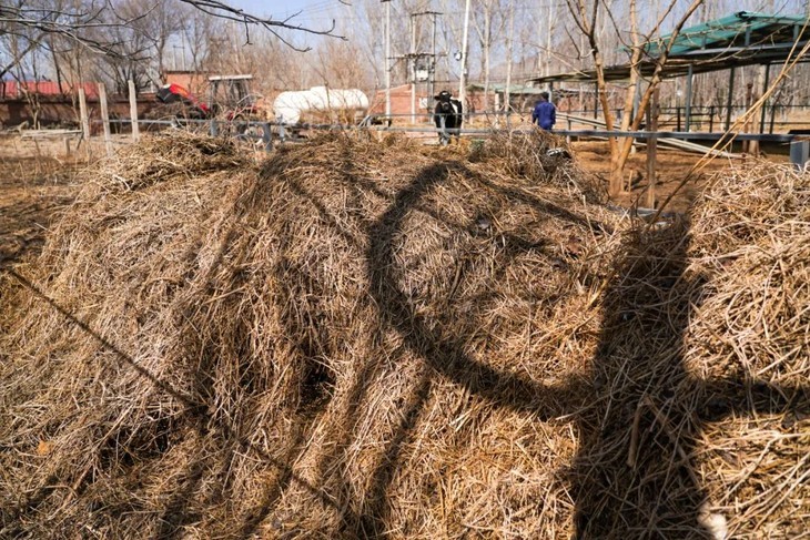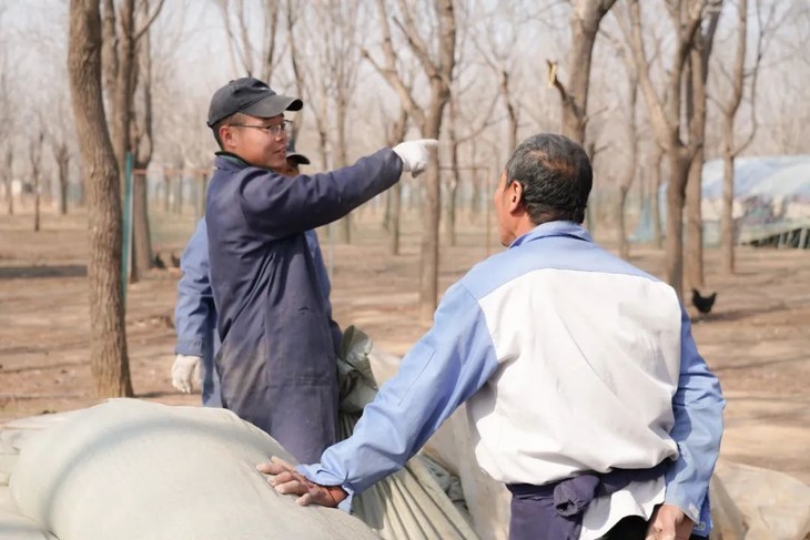 修理好水管,新朝和主要饲养鸡鸭鹅的阿姨想要把核桃林中储存的稻壳运送到育雏室里。但搬运这堆小山一样,每袋都一百多斤的稻壳,对于新朝和瘦小的阿姨,都太吃力了一些。于是他打电话寻求主要负责喂养牛羊的大叔来帮忙。