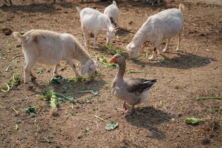 羊群中间有一只溜达的大鹅,而最近的鹅棚离这儿步行也要十分钟。新朝说它是跟着乡建的四只羊一起送来的,自那以后就在羊圈定居了。羊吃什么它吃什么,从来没把自己当外人儿。