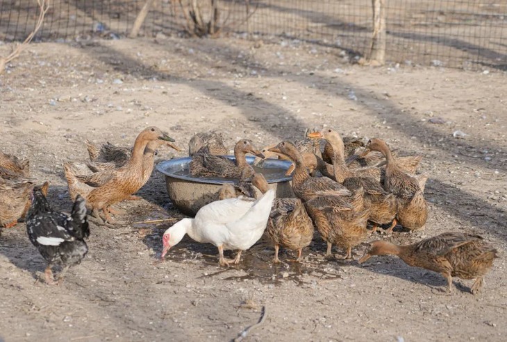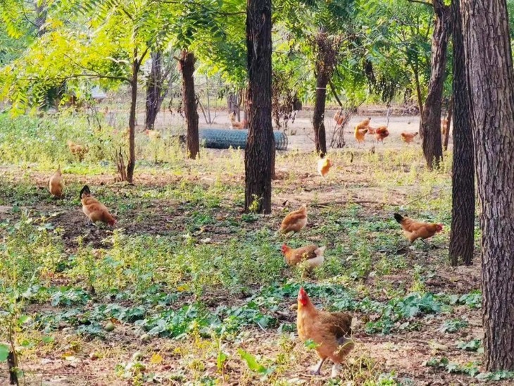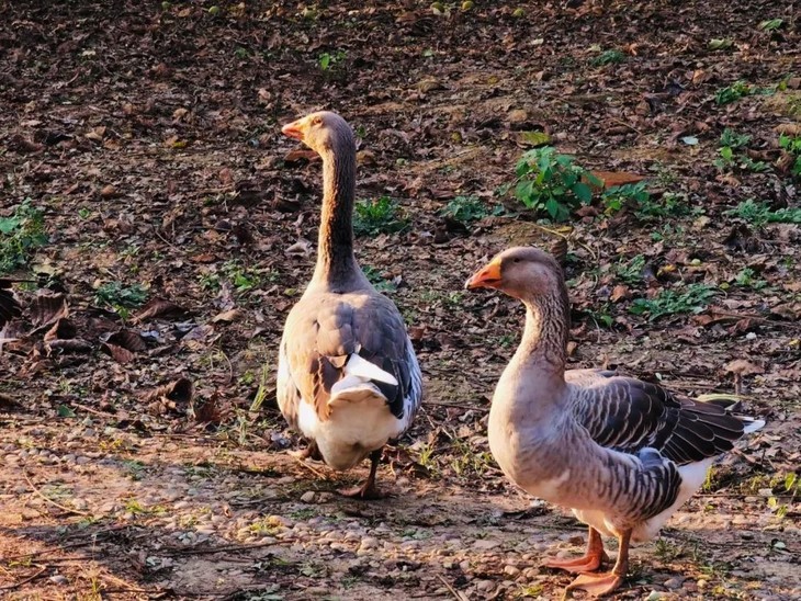 鸡鸭鹅们一年四季都很幸福,冬天棚舍里很暖,夏天核桃林枝叶繁茂,在树荫下也不会太热,而且可以边溜达边吃些鲜嫩的草叶。林下养殖的优势是双向的,树林立体的环境优势既提供了舒适的环境和丰富的青饲料,鸡鸭鹅也能帮助在林间除草。