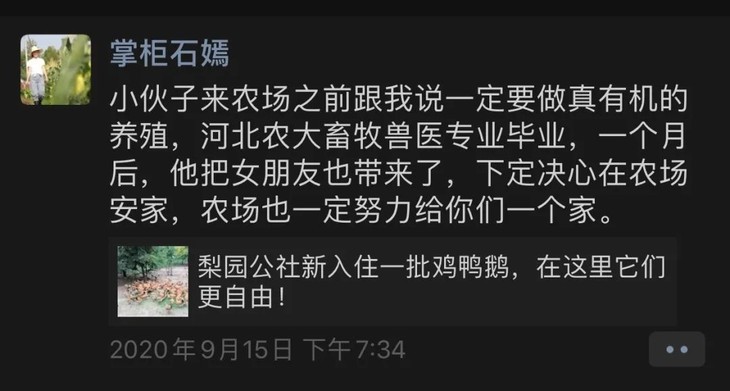 新朝工作的地方是在分享收获的梨园公社基地,主要负责协调管理养殖部的大小事务。在梨园中将近五十亩的不同区域内,分别饲养照顾鸡鸭鹅和牛羊猪,还有一头小毛驴~