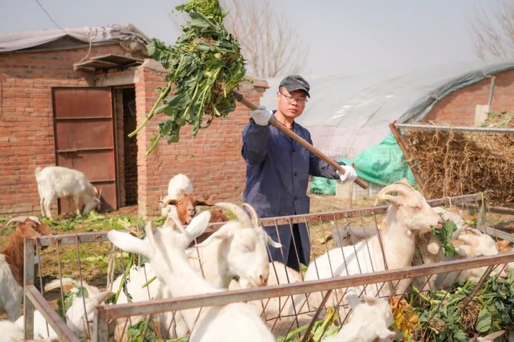 羊羊打针不怎么开心,但开餐就很兴奋了。这一顿就有五种菜式:玉米、花生饼、麦麸、葵花籽饼,还有从旁边大棚拉过来的最新鲜的西兰花杆和其他菜叶子,嚼起来嘎嘣脆。牛羊鸡鸭鹅吃的这些青饲料,按实际市场价,可都是十几块钱一斤的“正经”蔬菜。这就是种养殖结合的一大优势,循环的价值超越了成本,所以也是很多单纯做养殖的养殖场难以拥有的一个部分。