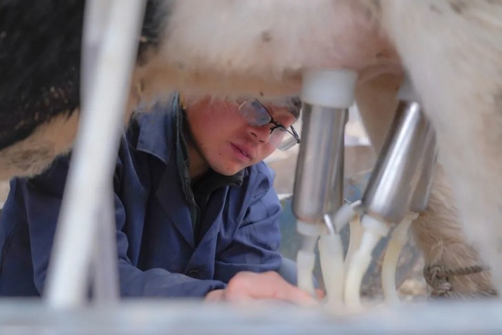 早晨赶到梨园公社的时候,新朝正在挤牛奶。纯纯的乳白色牛奶顺着吸奶器的管子慢慢流入奶桶中,不一会就灌装了小半桶,肉眼可见跟市场中售卖的普通牛奶不一样。这位牛妈妈每天只会被挤一次奶,还是因为小牛喝不完就浪费了。新朝讲他见过很多奶牛分娩后就被母子分离,每天挤三遍奶,没有价值直接被淘汰。看着农场最近喜添的两只小牛新丁在牛圈里撒欢儿,默默感叹:“幸好你们是在这儿呀!”