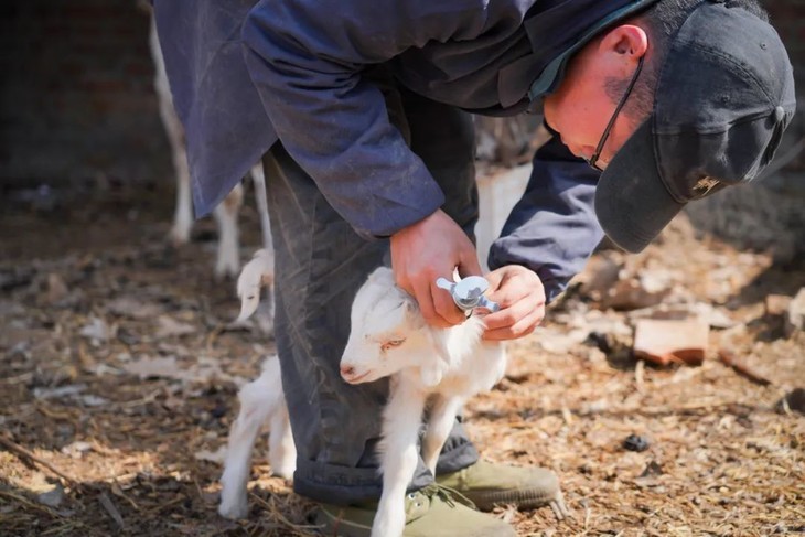 原来是最近气温变化比较大,有一只小羊稍稍有点发烧。第一次见到小羊测体温的方式,还有新朝最专业的一面。有机养殖用药是需要严格遵守规范的,新朝见多了常规养殖业抗生素残留严重的问题,深知里面的厉害。哪怕小羊只是感冒,也会被这位“畜牧兽医专业蓝大褂”小心谨慎的照顾,防患于未然。