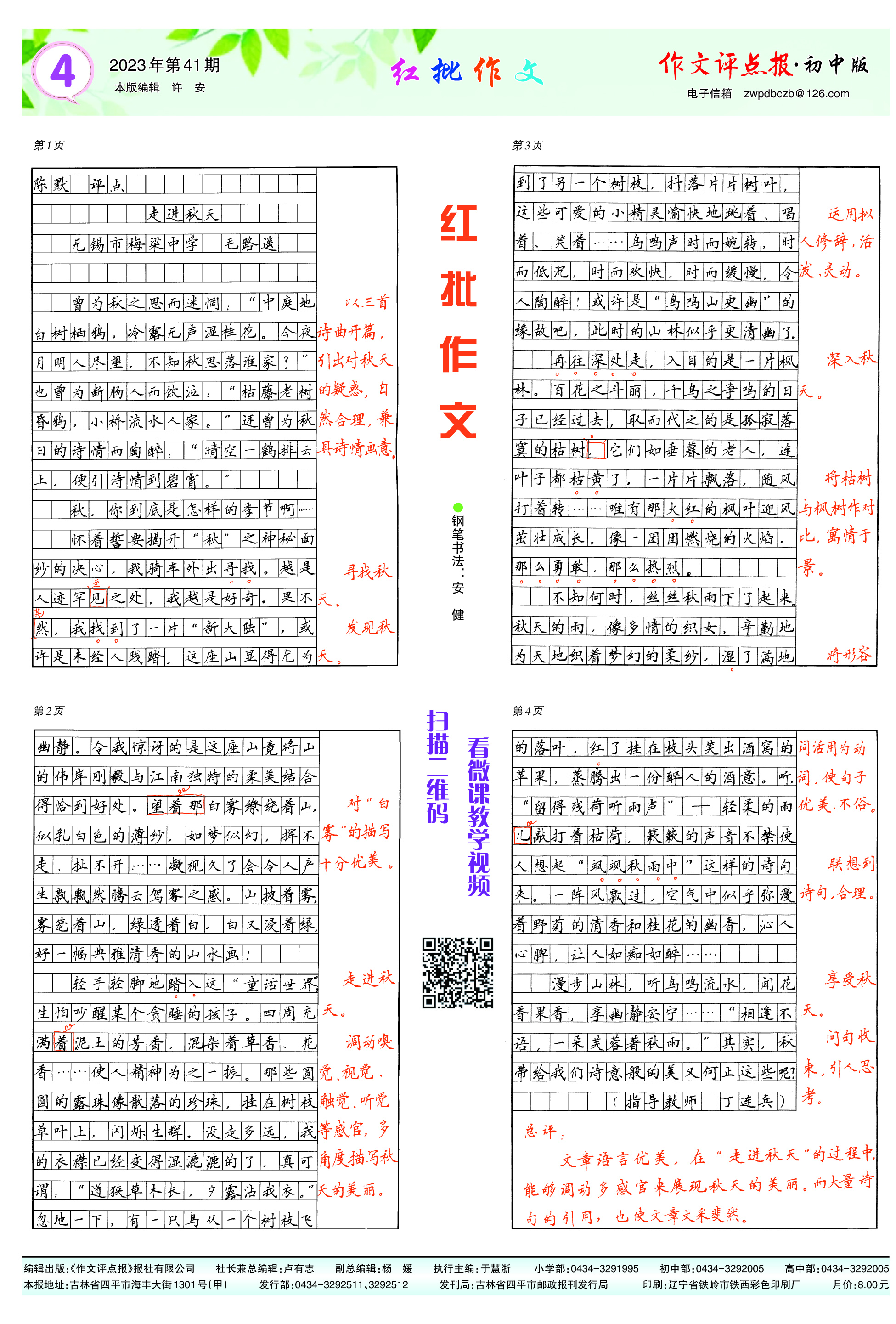 二、有声、视频同步讲解。扫描“红批有声、视频作文”栏目的二维码即可收听名师详解作文或观看微课教学视频,让作文学习有“声”有“色”。