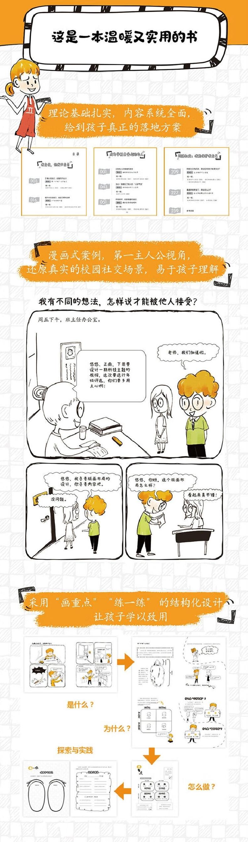 全书从“我自信,但我不自负”“成为学校里受欢迎的人”“成为超级合作者”“我能自己解决矛盾与冲突”“我有方法应对嘲笑和欺负”“网络社交:我能保护我自己”6大主题入手,除了用生动的案例和语言向孩子讲述关于社交的底层逻辑,更有效地提出了19个实用的校园社交解决策略,帮助孩子学会解决冲突和与人相处的技巧。